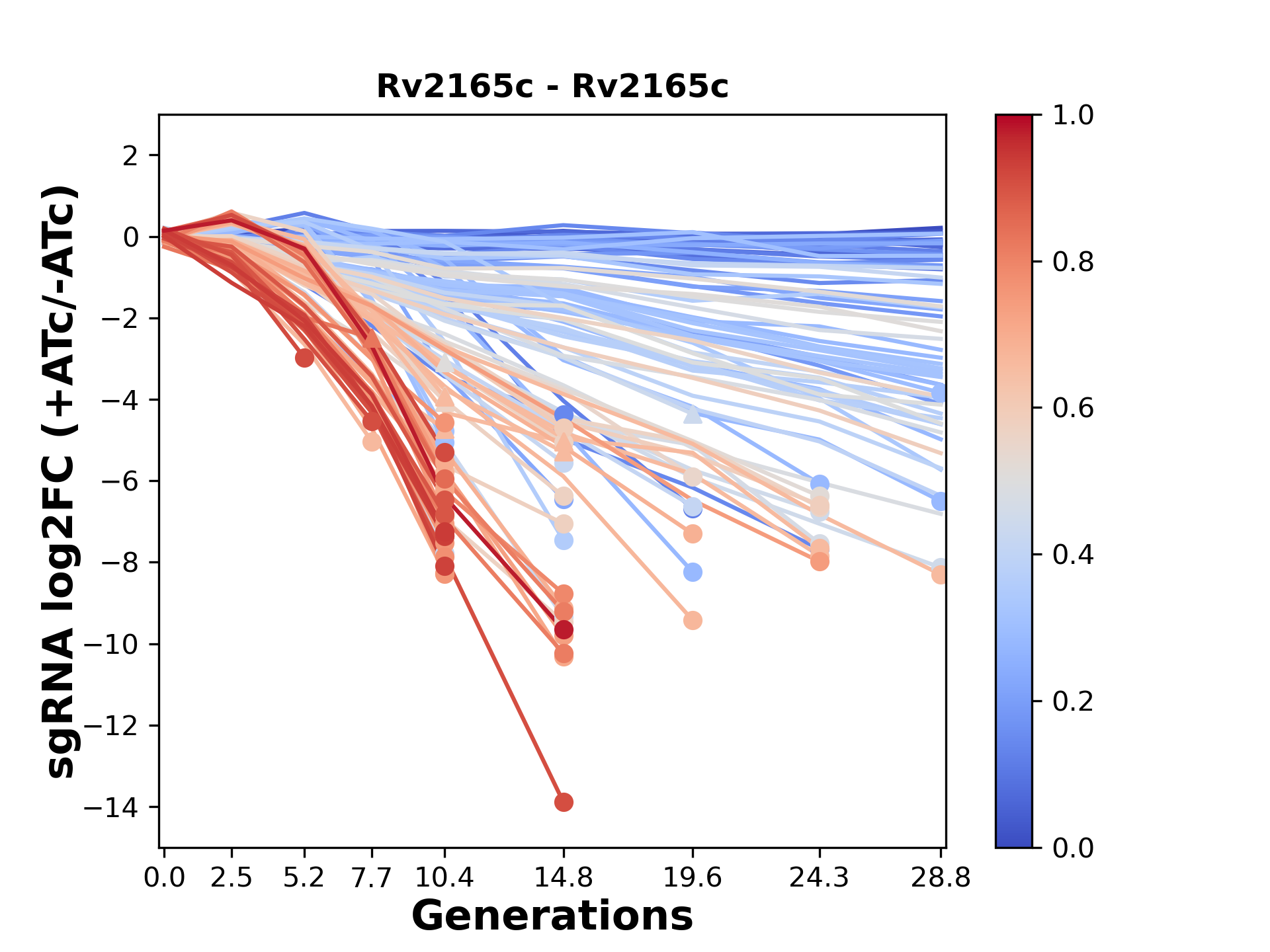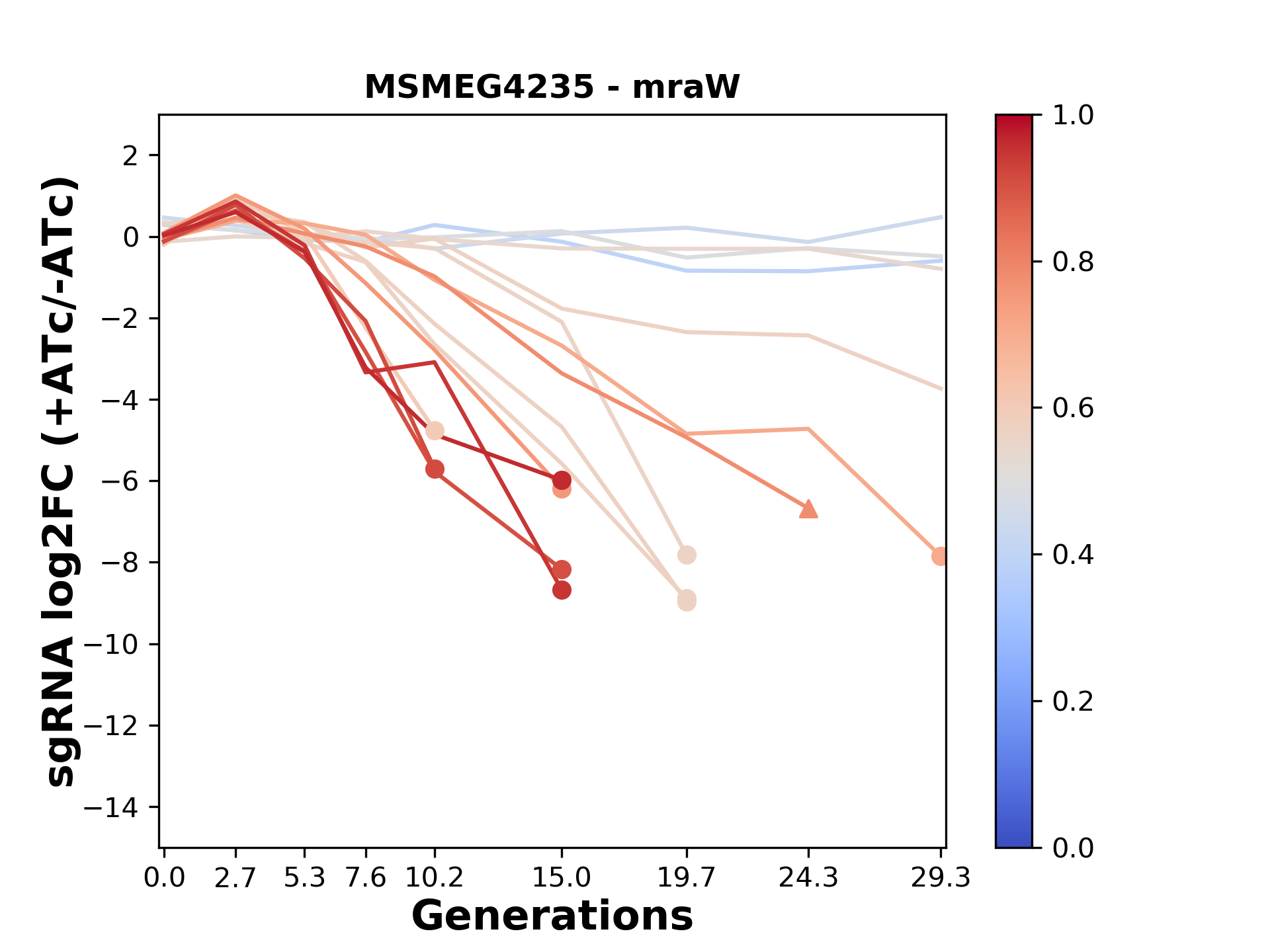 Here, we show sgRNA log2 fold-change values (L2FC) (plus versus minus ATc) over consecutive generations for sgRNAs targeting the gene you selected.