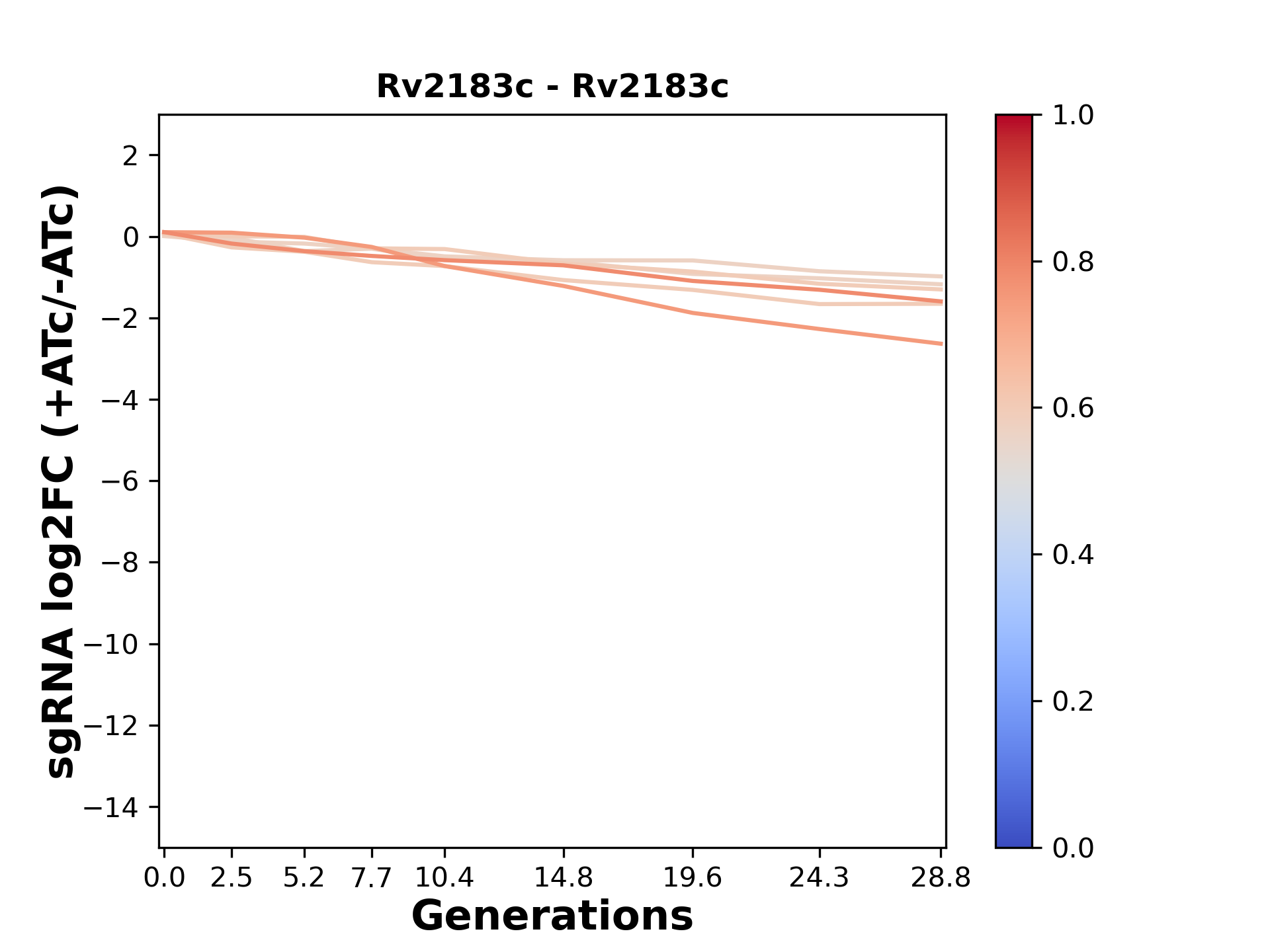 Here, we show sgRNA log2 fold-change values (L2FC) (plus versus minus ATc) over consecutive generations for sgRNAs targeting the gene you selected.