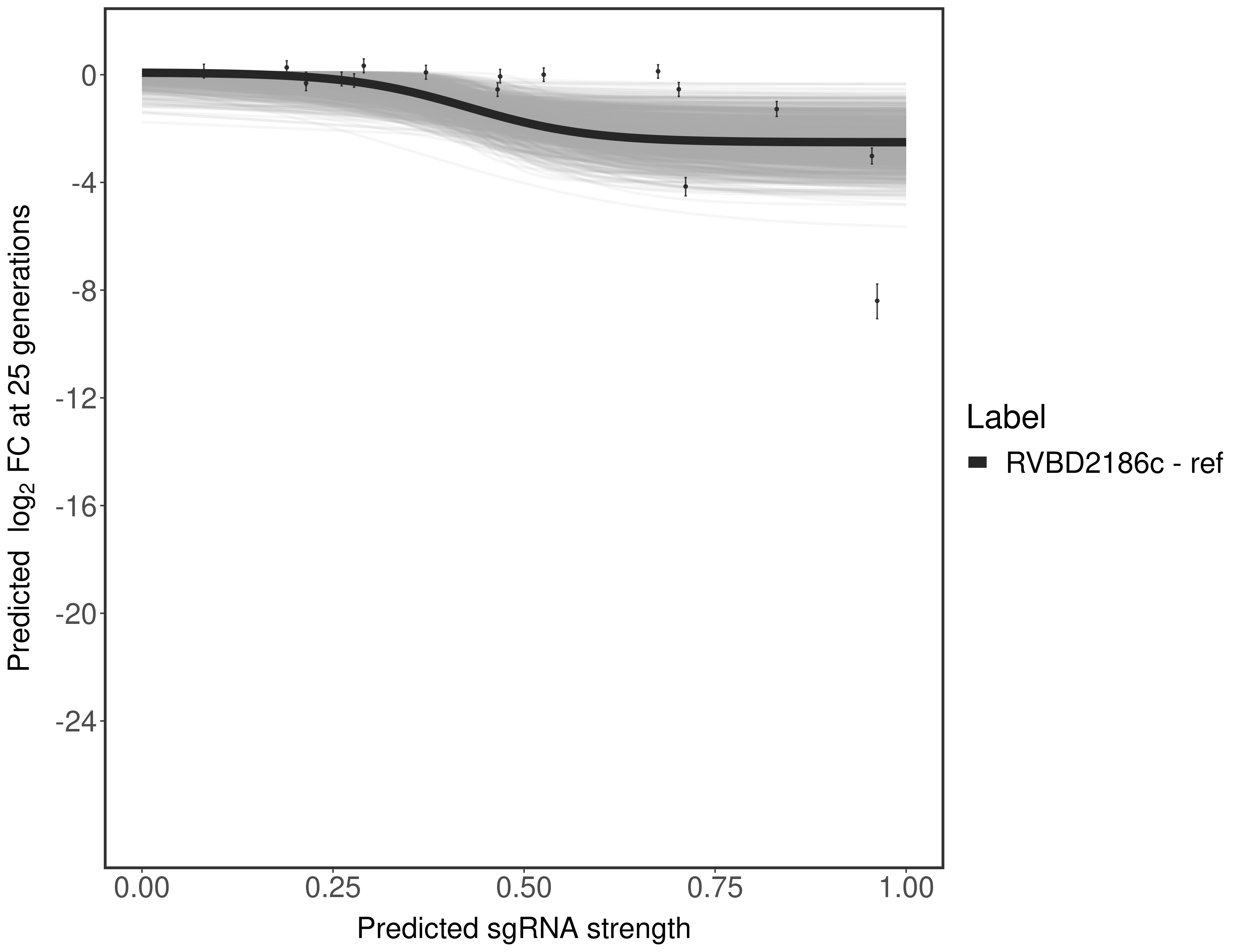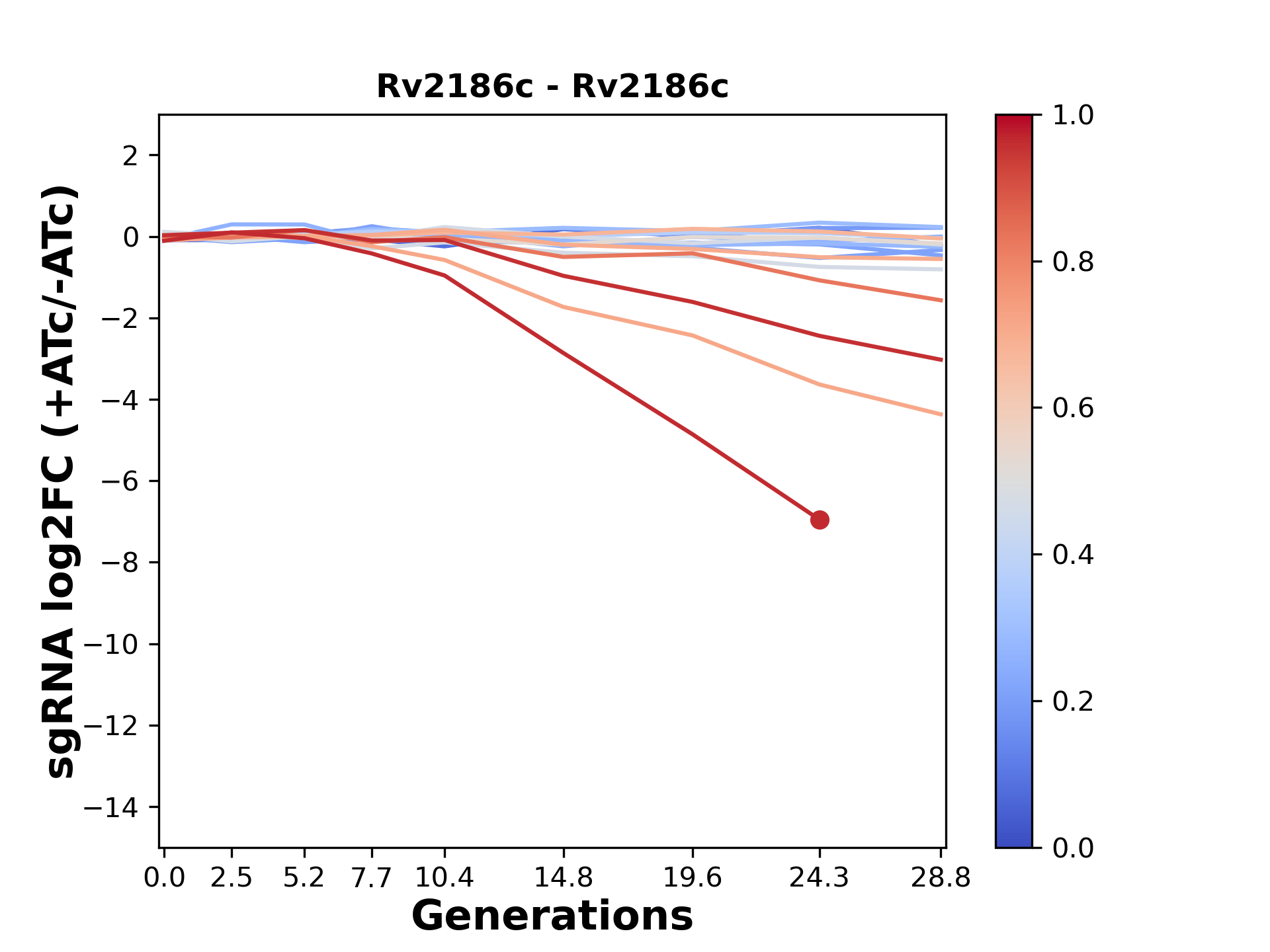 Experiment: We designed an M. tuberculosis CRISPRi library (RLC12) to target all annotated Mtb genes with single guide RNAs (sgRNAs) of varying predicted knockdown efficiencies. In parallel, we constructed a M. smegmatis CRISPRi library (RLC11) to target all annotated Msmeg genes, similar to the Mtb sgRNA library. RLC12 was transformed into M. tuberculosis H37Rv; RLC11 into M. smegmatis mc2-155. We passaged both CRISPRi libraries for nearly 30 generations in the presence or absence of the CRISPRi-inducer anhydrotetracycline (ATc). At the indicated timepoints, genomic DNA was harvested and the representation of individual sgRNAs was counted using Illumina sequencing. Here, we show sgRNA log2 fold-change values (L2FC) (plus versus minus ATc) over consecutive generations for sgRNAs targeting the gene you selected. sgRNAs are color-coded based on their predicted strength from blue (strength=0; weak) to red (strength=1; strong).