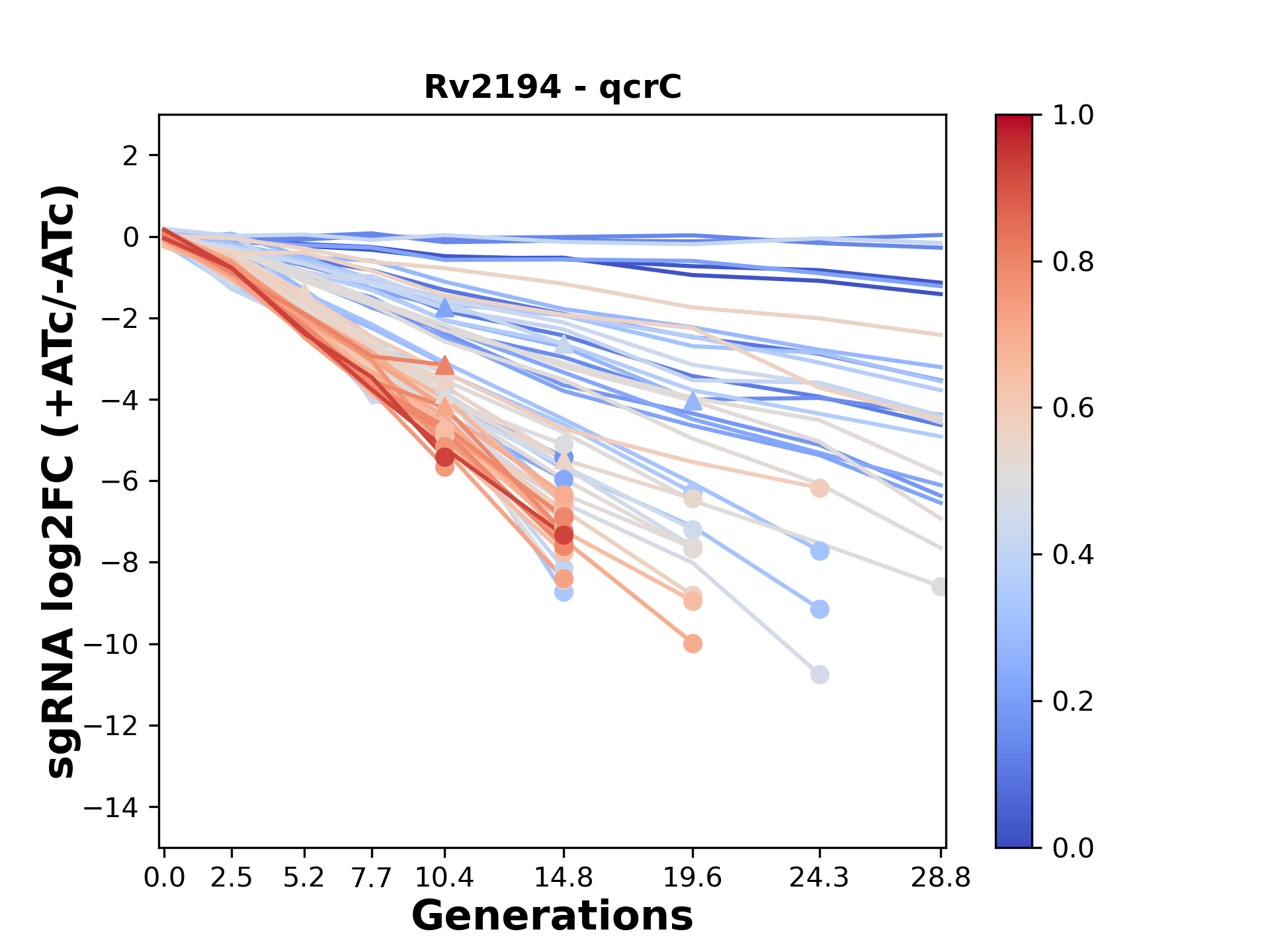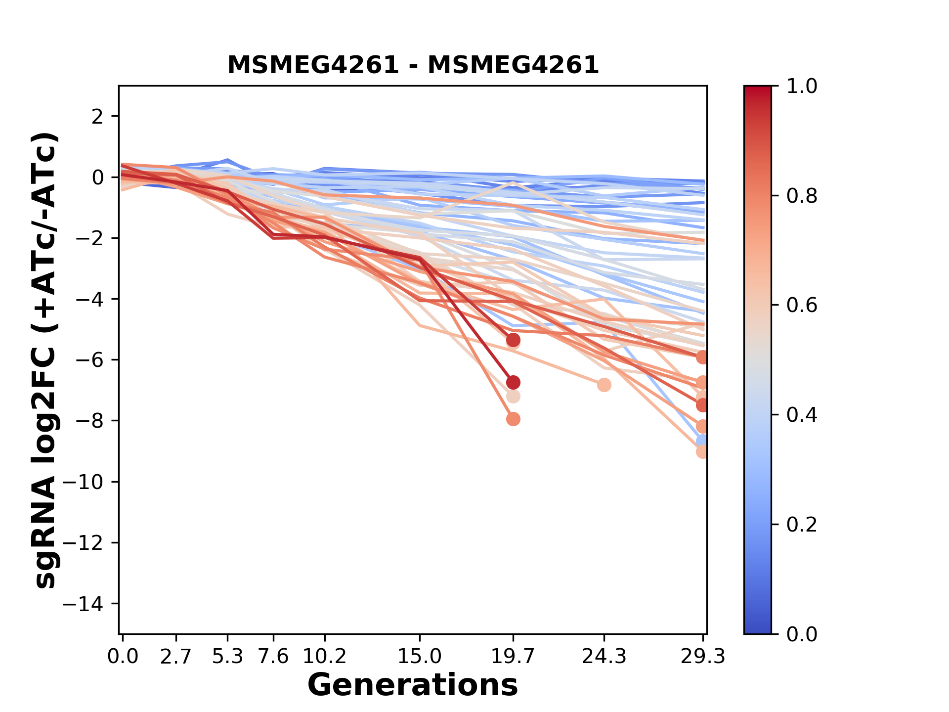 Here, we show sgRNA log2 fold-change values (L2FC) (plus versus minus ATc) over consecutive generations for sgRNAs targeting the gene you selected.