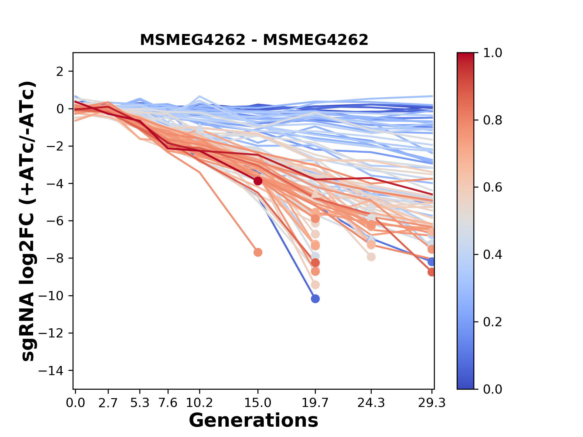 Here, we show sgRNA log2 fold-change values (L2FC) (plus versus minus ATc) over consecutive generations for sgRNAs targeting the gene you selected.