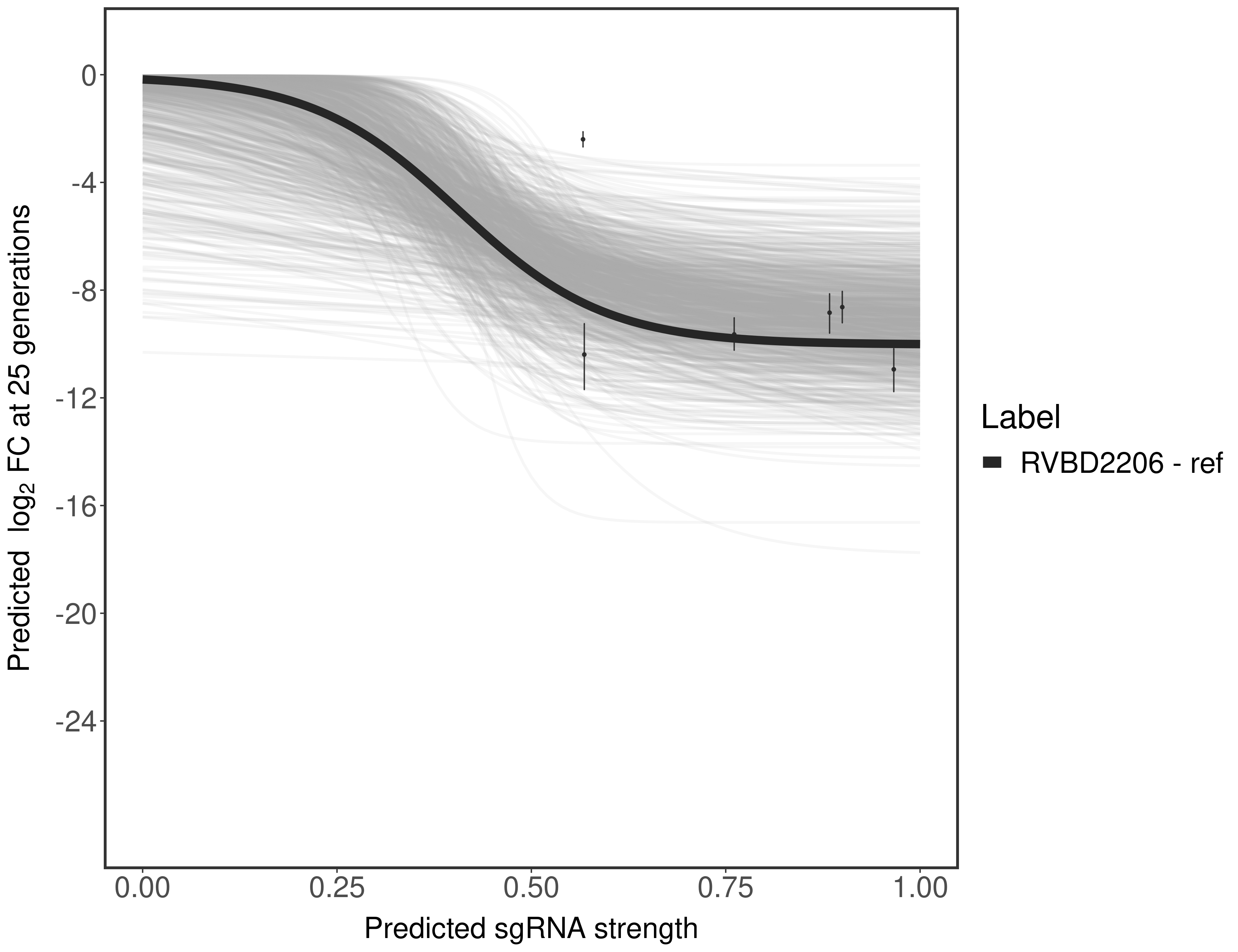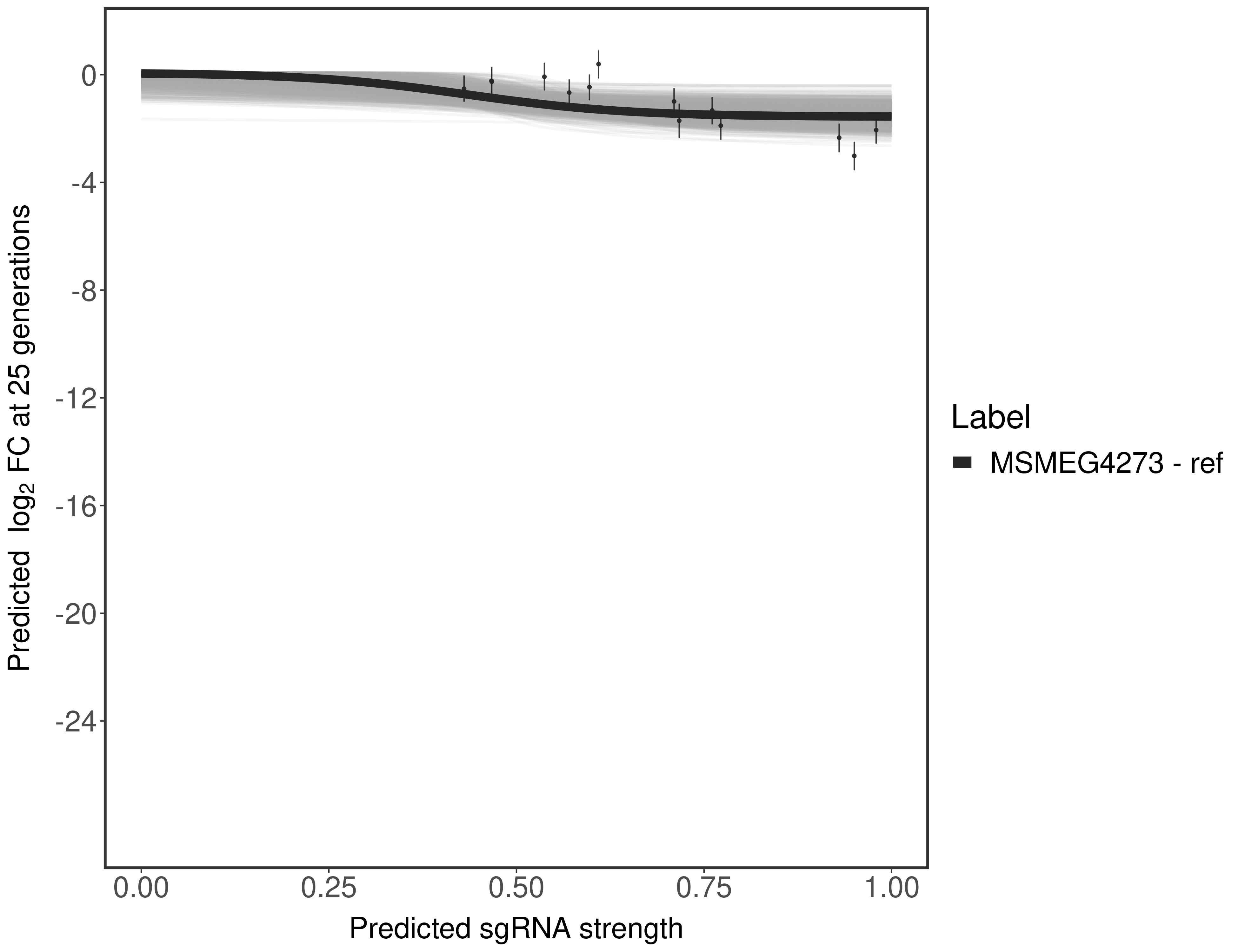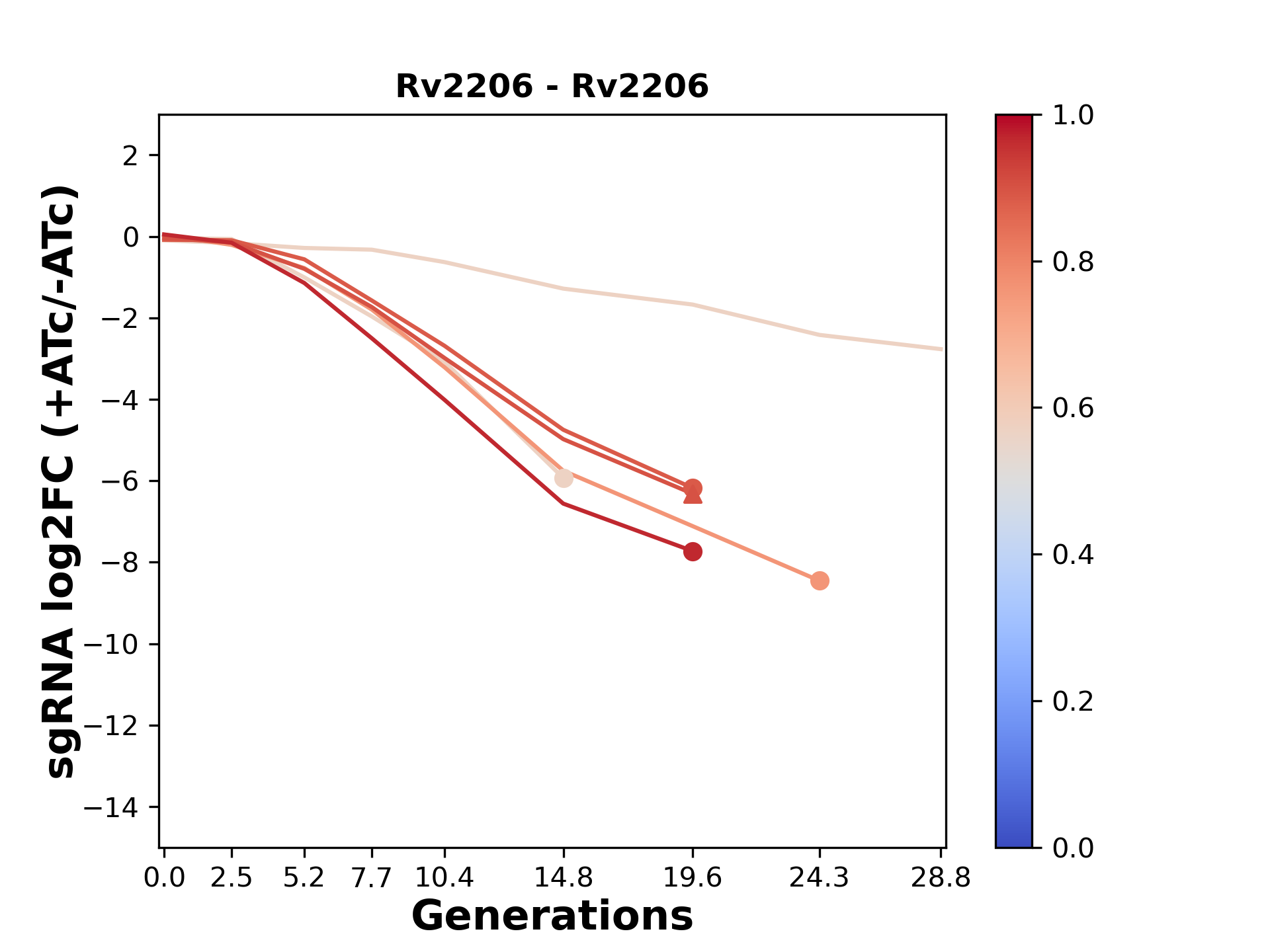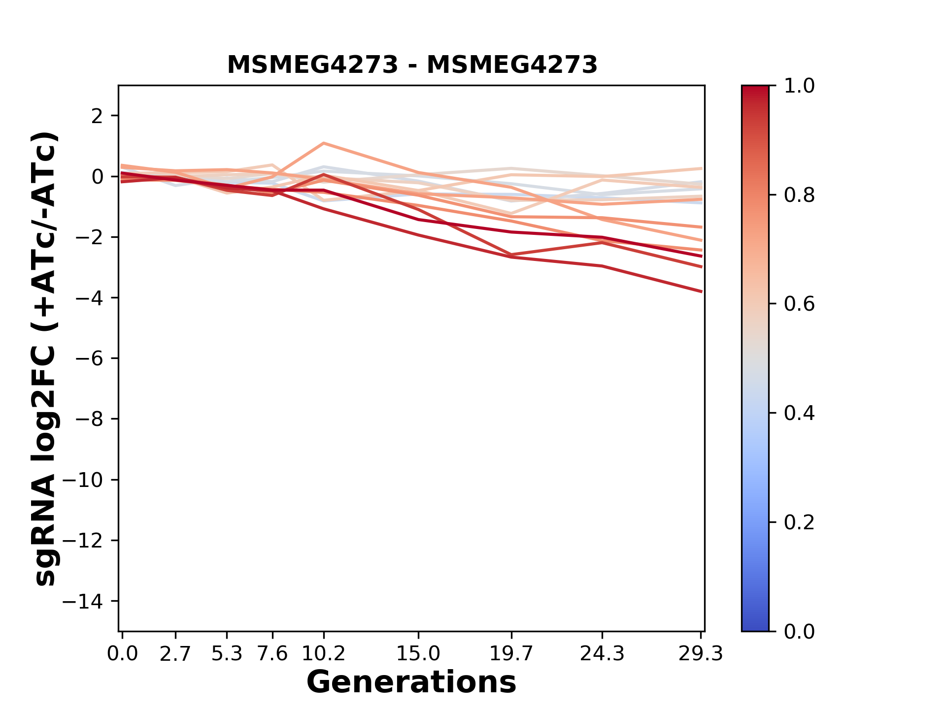 Experiment: We designed an M. tuberculosis CRISPRi library (RLC12) to target all annotated Mtb genes with single guide RNAs (sgRNAs) of varying predicted knockdown efficiencies. In parallel, we constructed a M. smegmatis CRISPRi library (RLC11) to target all annotated Msmeg genes, similar to the Mtb sgRNA library. RLC12 was transformed into M. tuberculosis H37Rv; RLC11 into M. smegmatis mc2-155. We passaged both CRISPRi libraries for nearly 30 generations in the presence or absence of the CRISPRi-inducer anhydrotetracycline (ATc). At the indicated timepoints, genomic DNA was harvested and the representation of individual sgRNAs was counted using Illumina sequencing. Here, we show sgRNA log2 fold-change values (L2FC) (plus versus minus ATc) over consecutive generations for sgRNAs targeting the gene you selected. sgRNAs are color-coded based on their predicted strength from blue (strength=0; weak) to red (strength=1; strong).
