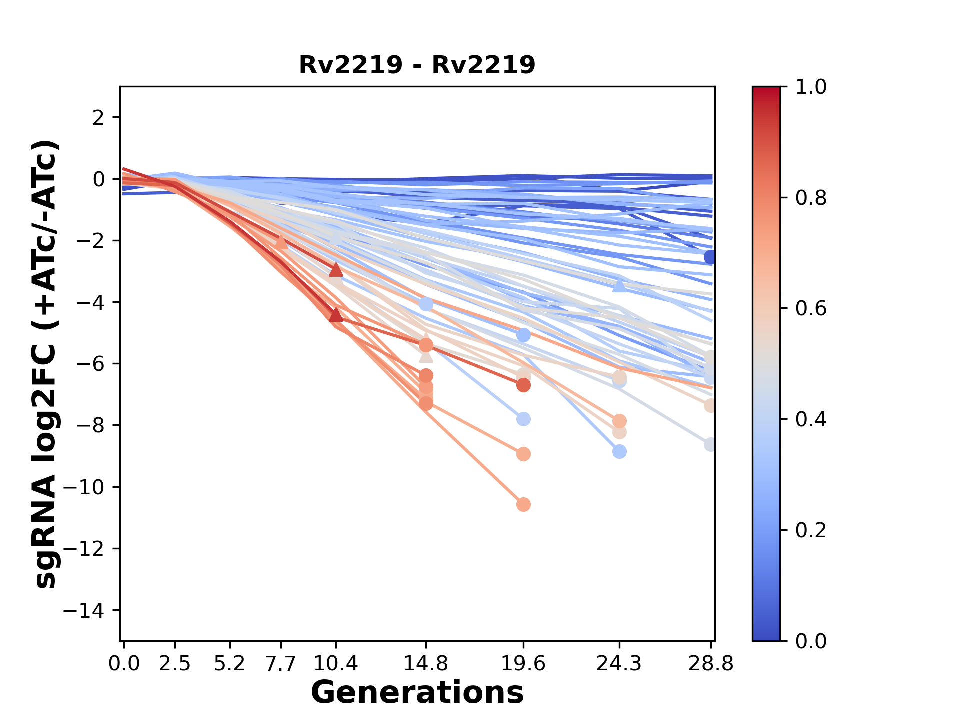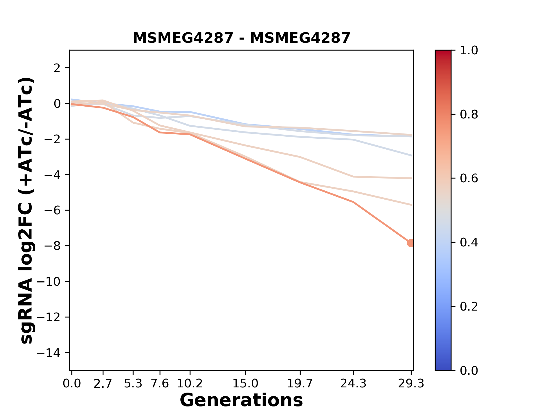 Here, we show sgRNA log2 fold-change values (L2FC) (plus versus minus ATc) over consecutive generations for sgRNAs targeting the gene you selected.