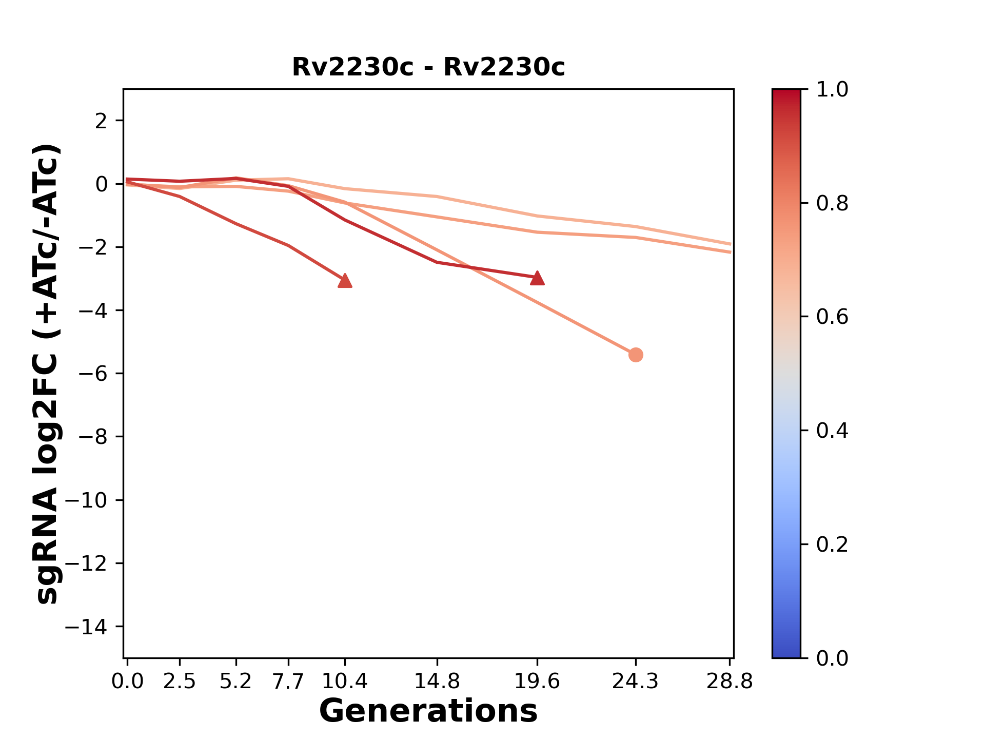 Here, we show sgRNA log2 fold-change values (L2FC) (plus versus minus ATc) over consecutive generations for sgRNAs targeting the gene you selected.