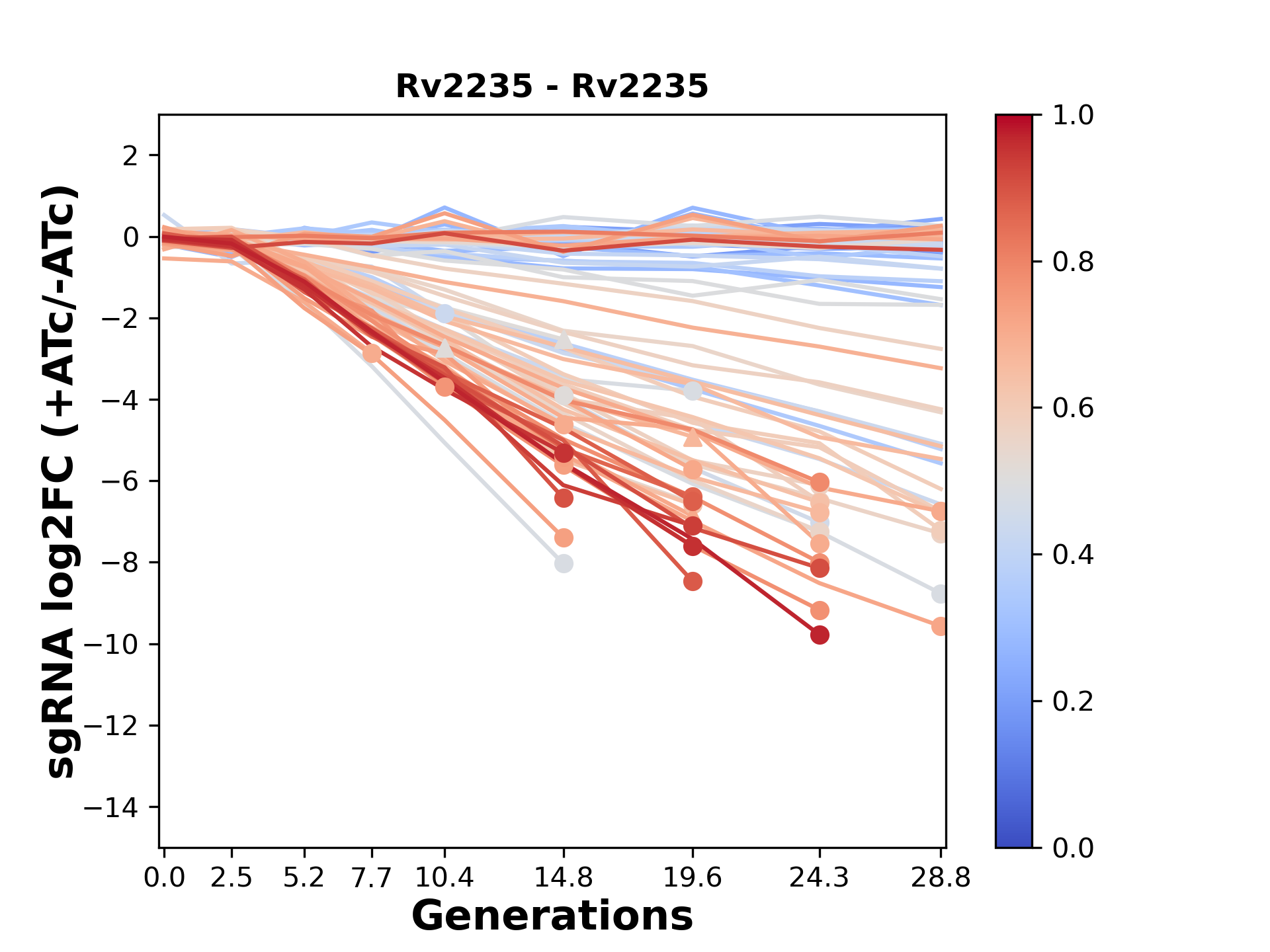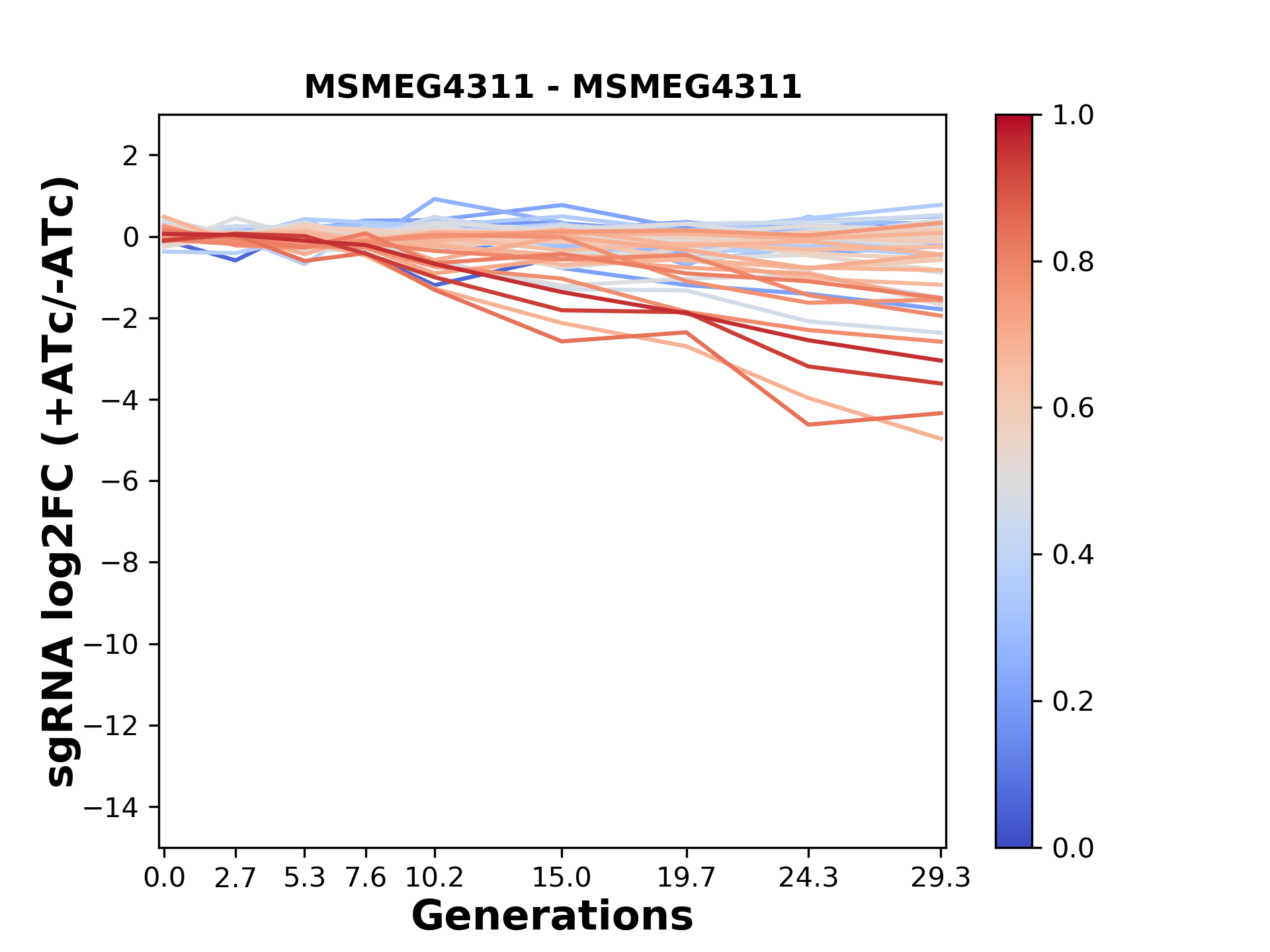 Here, we show sgRNA log2 fold-change values (L2FC) (plus versus minus ATc) over consecutive generations for sgRNAs targeting the gene you selected.