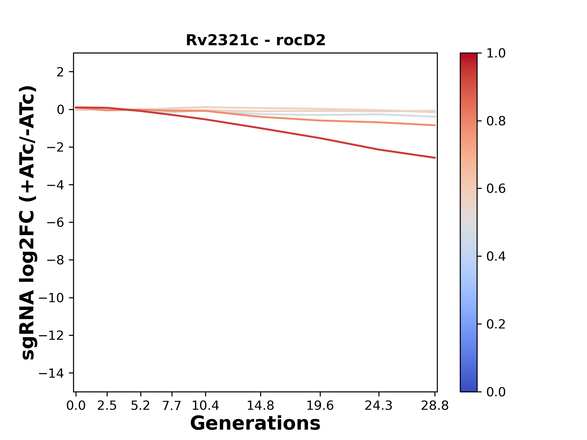 Here, we show sgRNA log2 fold-change values (L2FC) (plus versus minus ATc) over consecutive generations for sgRNAs targeting the gene you selected.