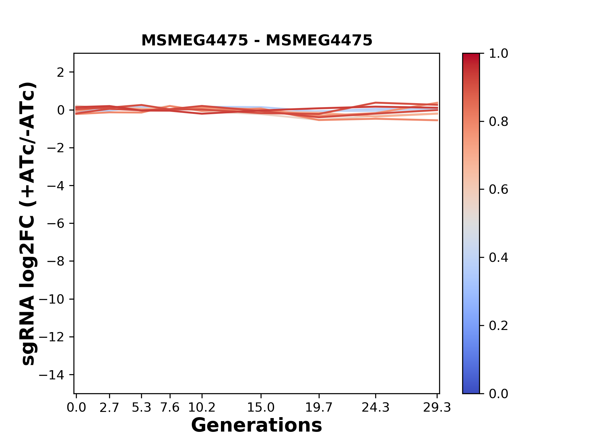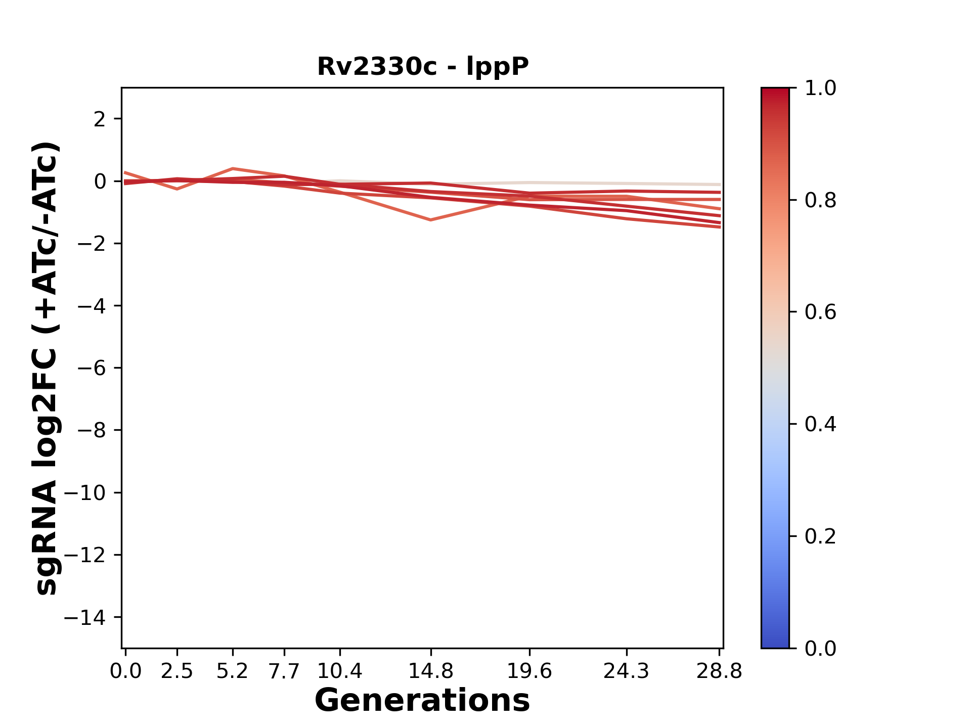 Experiment: We designed an M. tuberculosis CRISPRi library (RLC12) to target all annotated Mtb genes with single guide RNAs (sgRNAs) of varying predicted knockdown efficiencies. In parallel, we constructed a M. smegmatis CRISPRi library (RLC11) to target all annotated Msmeg genes, similar to the Mtb sgRNA library. RLC12 was transformed into M. tuberculosis H37Rv; RLC11 into M. smegmatis mc2-155. We passaged both CRISPRi libraries for nearly 30 generations in the presence or absence of the CRISPRi-inducer anhydrotetracycline (ATc). At the indicated timepoints, genomic DNA was harvested and the representation of individual sgRNAs was counted using Illumina sequencing. Here, we show sgRNA log2 fold-change values (L2FC) (plus versus minus ATc) over consecutive generations for sgRNAs targeting the gene you selected. sgRNAs are color-coded based on their predicted strength from blue (strength=0; weak) to red (strength=1; strong).