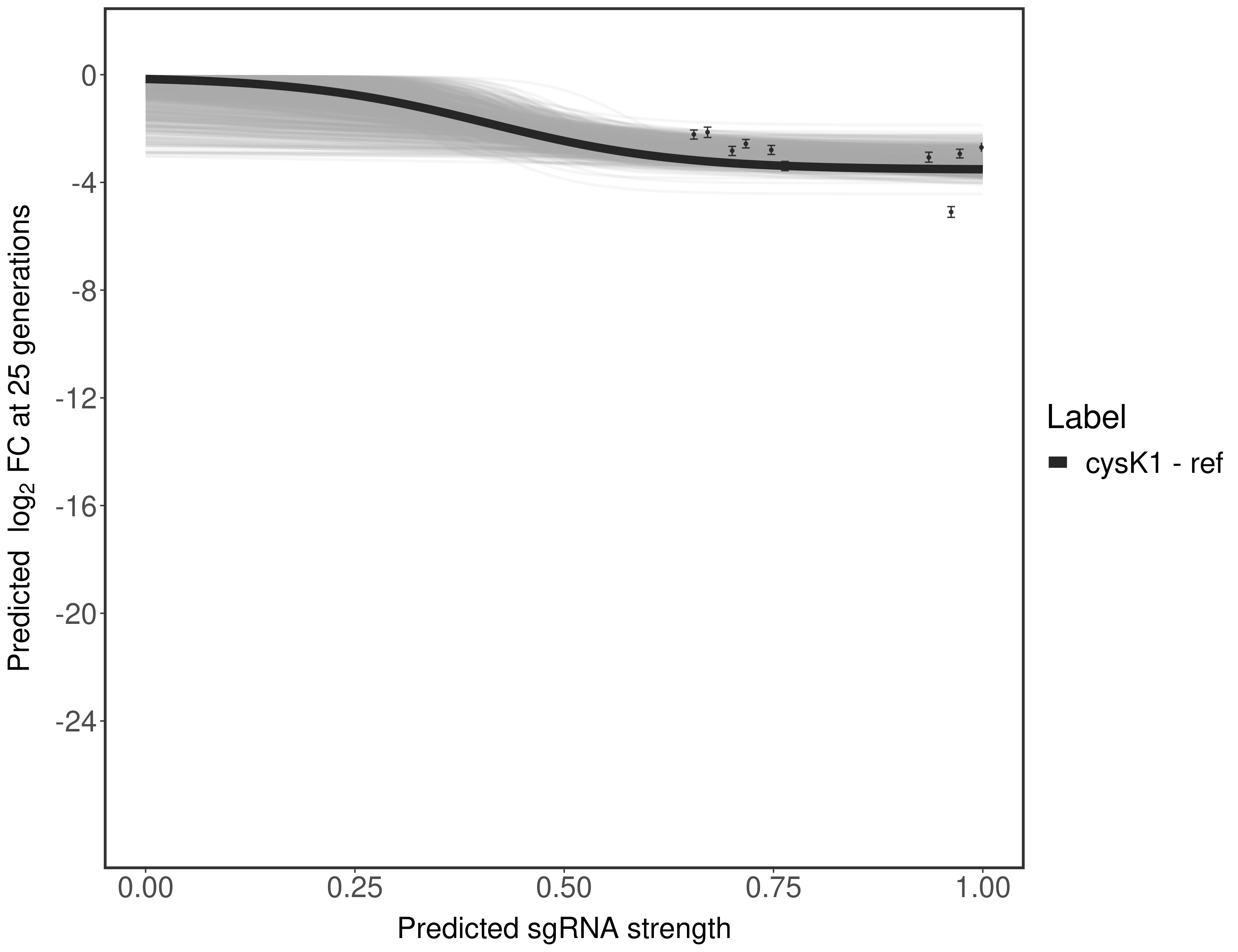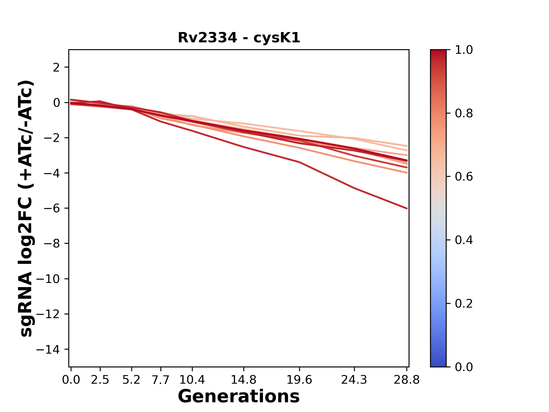 Here, we show sgRNA log2 fold-change values (L2FC) (plus versus minus ATc) over consecutive generations for sgRNAs targeting the gene you selected.