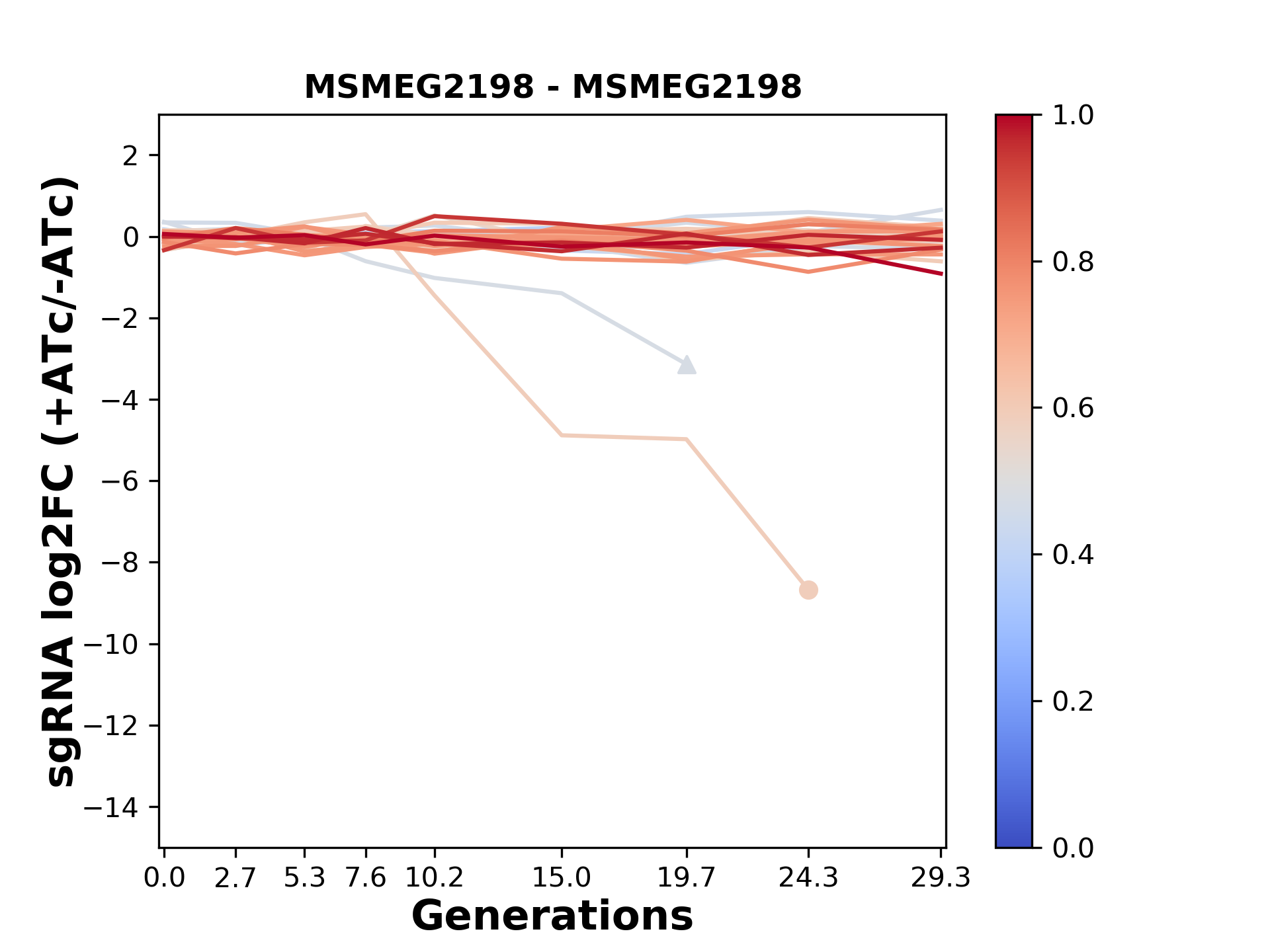 Here, we show sgRNA log2 fold-change values (L2FC) (plus versus minus ATc) over consecutive generations for sgRNAs targeting the gene you selected.