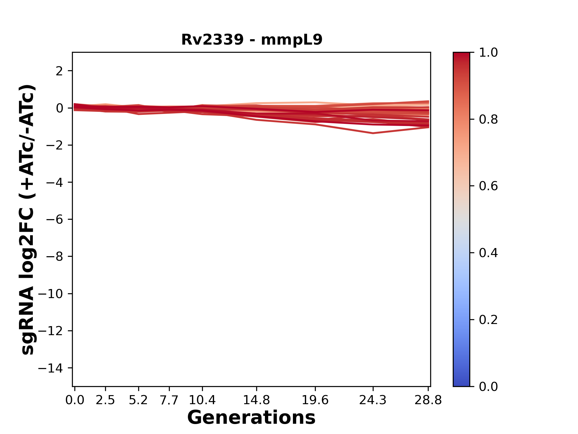 Here, we show sgRNA log2 fold-change values (L2FC) (plus versus minus ATc) over consecutive generations for sgRNAs targeting the gene you selected.