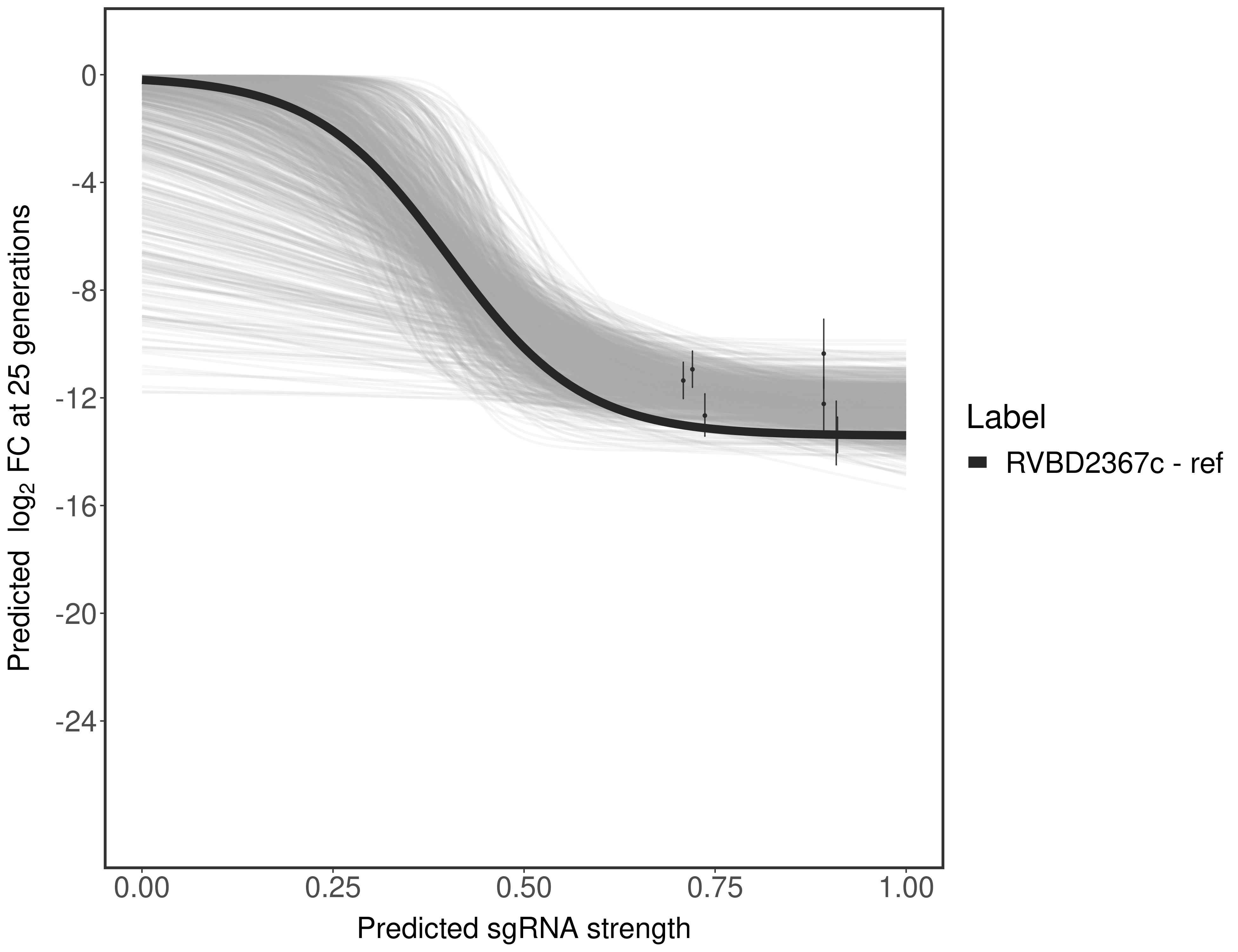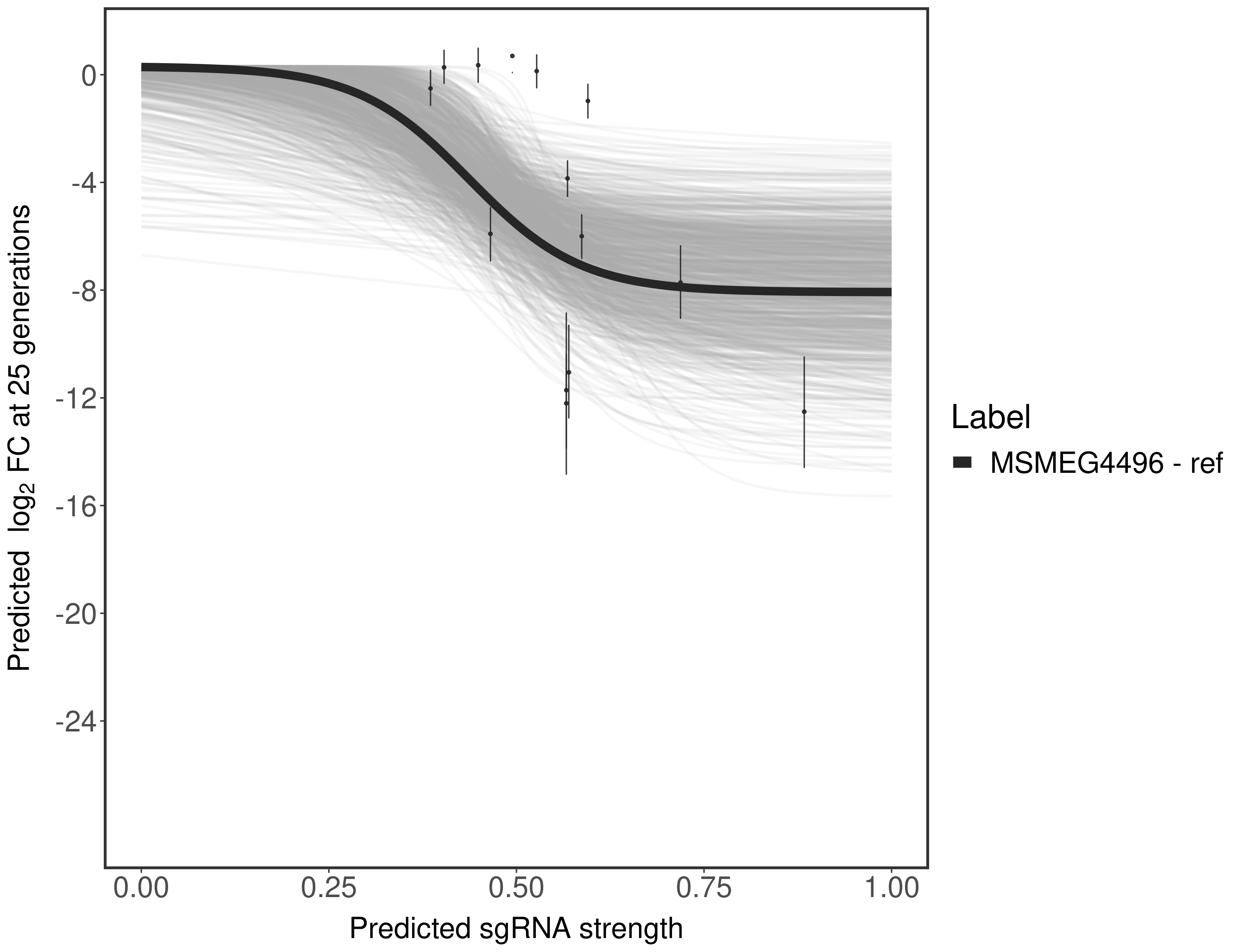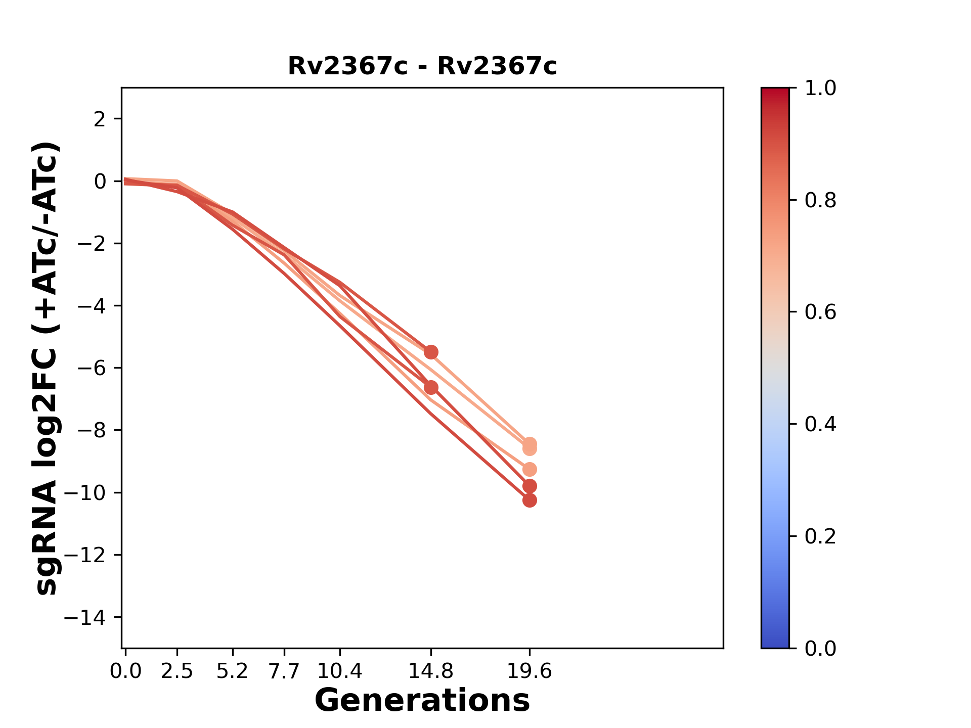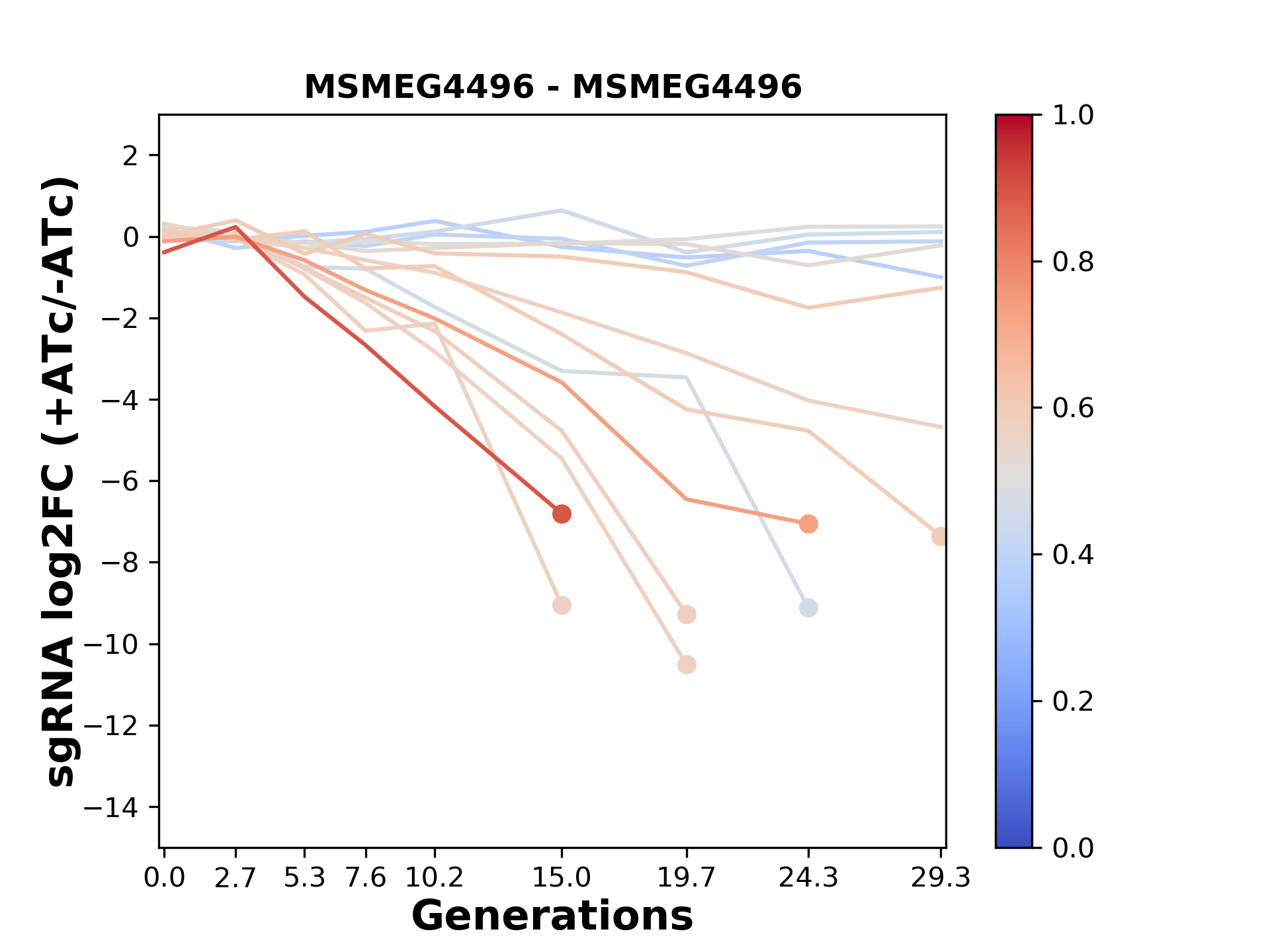 Experiment: We designed an M. tuberculosis CRISPRi library (RLC12) to target all annotated Mtb genes with single guide RNAs (sgRNAs) of varying predicted knockdown efficiencies. In parallel, we constructed a M. smegmatis CRISPRi library (RLC11) to target all annotated Msmeg genes, similar to the Mtb sgRNA library. RLC12 was transformed into M. tuberculosis H37Rv; RLC11 into M. smegmatis mc2-155. We passaged both CRISPRi libraries for nearly 30 generations in the presence or absence of the CRISPRi-inducer anhydrotetracycline (ATc). At the indicated timepoints, genomic DNA was harvested and the representation of individual sgRNAs was counted using Illumina sequencing. Here, we show sgRNA log2 fold-change values (L2FC) (plus versus minus ATc) over consecutive generations for sgRNAs targeting the gene you selected. sgRNAs are color-coded based on their predicted strength from blue (strength=0; weak) to red (strength=1; strong).