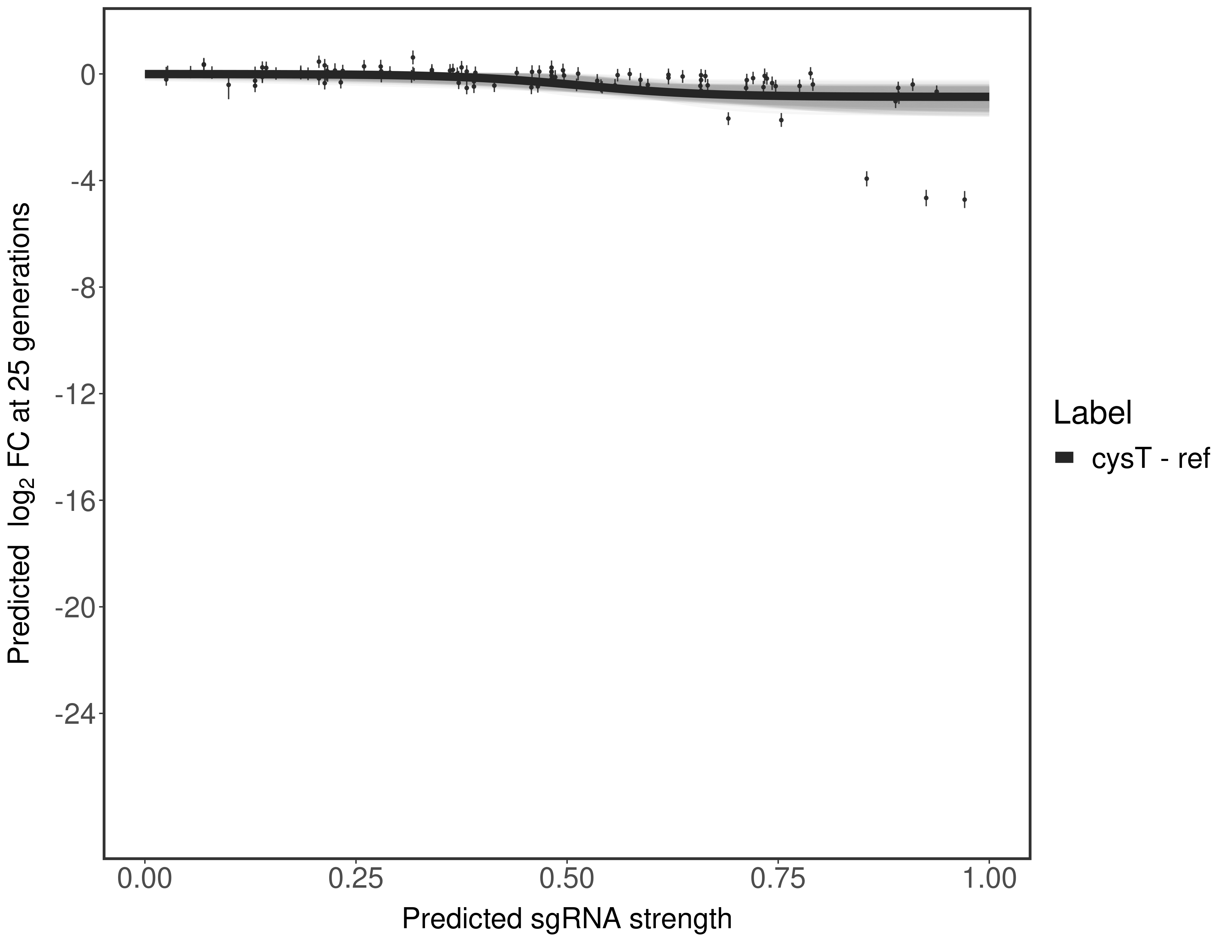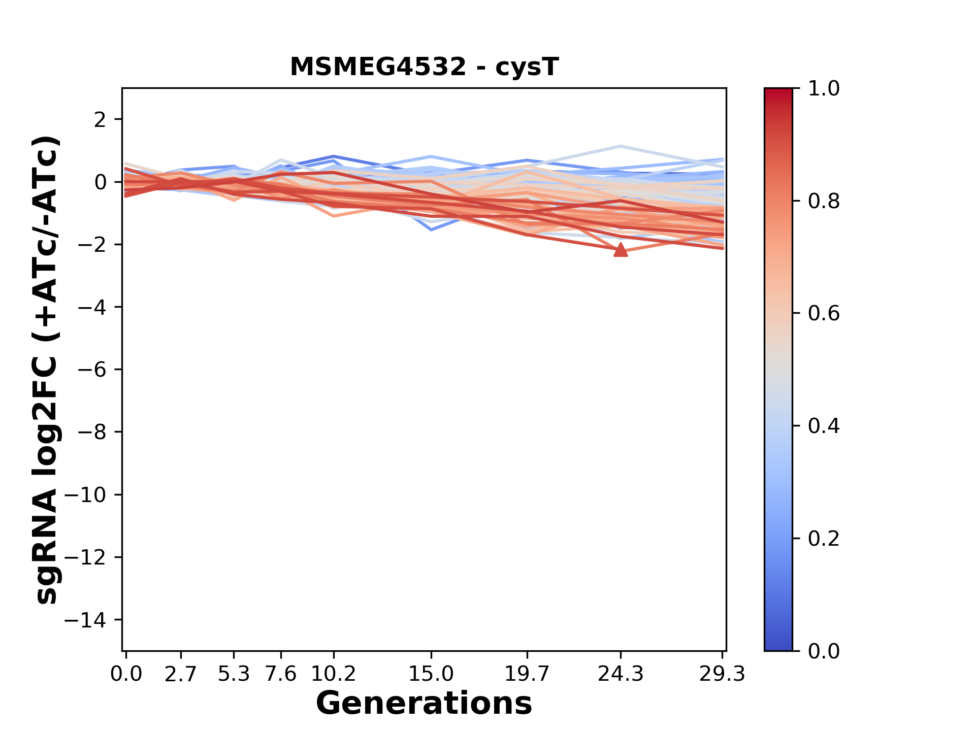 Here, we show sgRNA log2 fold-change values (L2FC) (plus versus minus ATc) over consecutive generations for sgRNAs targeting the gene you selected.