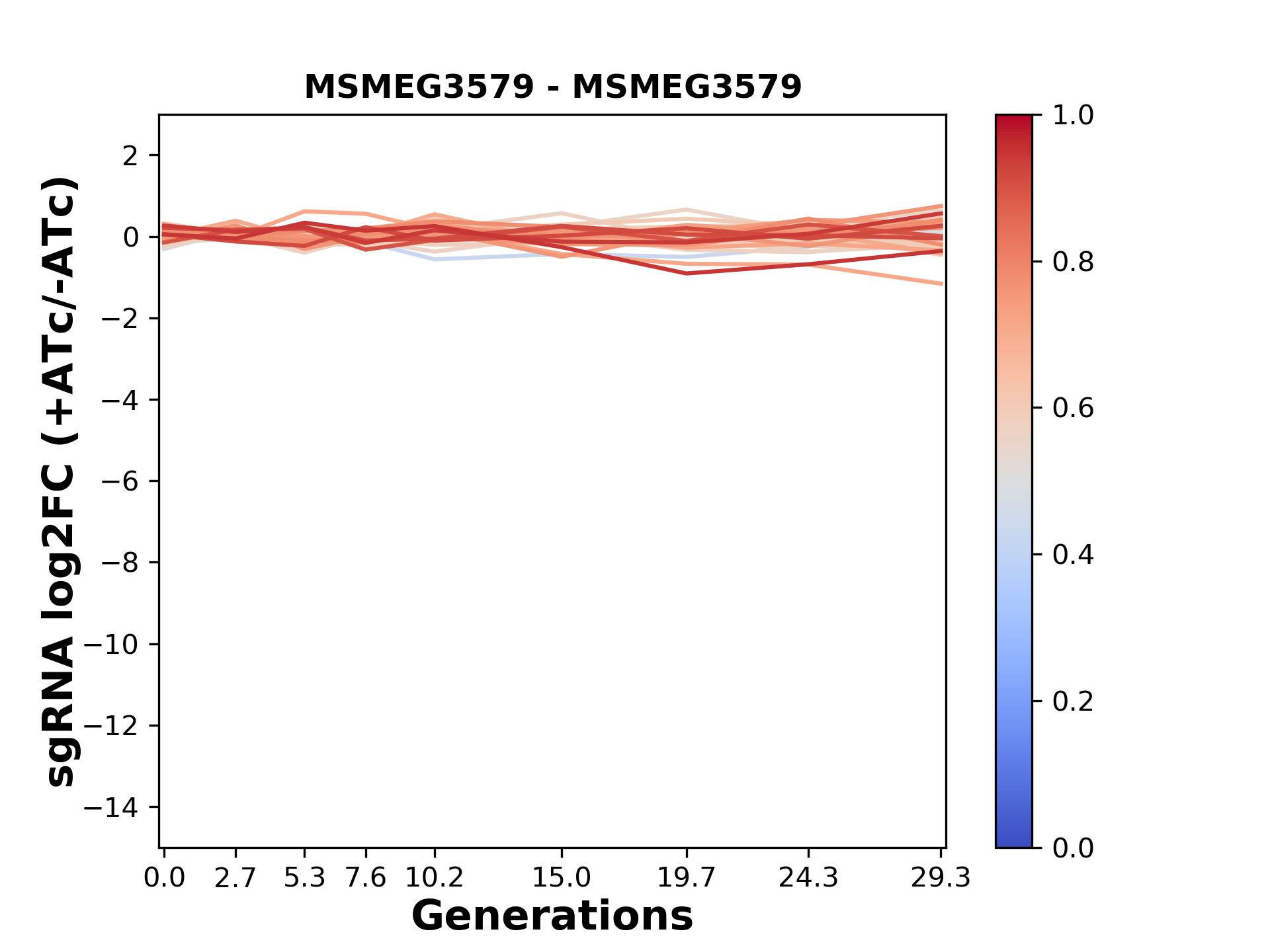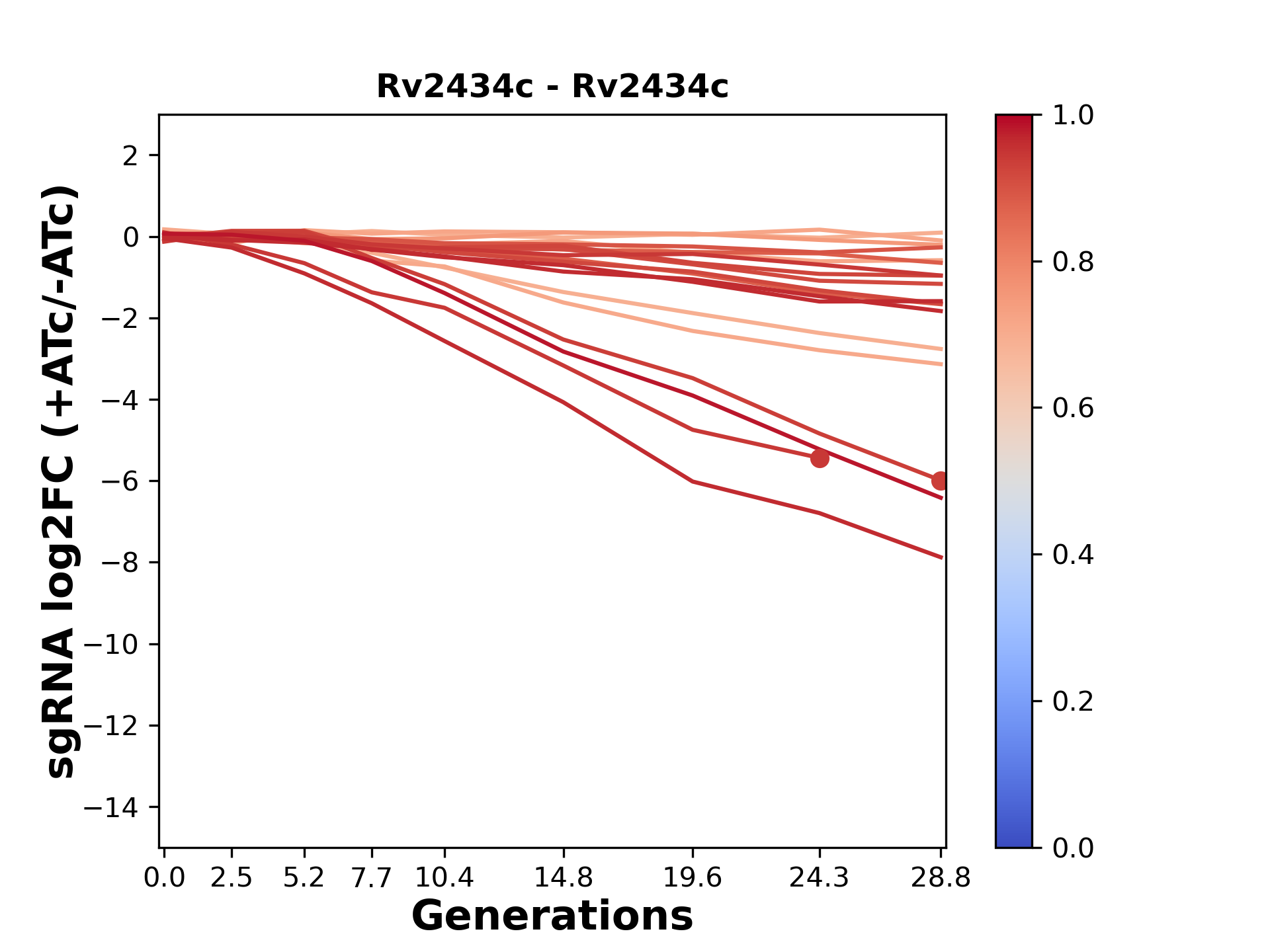 Experiment: We designed an M. tuberculosis CRISPRi library (RLC12) to target all annotated Mtb genes with single guide RNAs (sgRNAs) of varying predicted knockdown efficiencies. In parallel, we constructed a M. smegmatis CRISPRi library (RLC11) to target all annotated Msmeg genes, similar to the Mtb sgRNA library. RLC12 was transformed into M. tuberculosis H37Rv; RLC11 into M. smegmatis mc2-155. We passaged both CRISPRi libraries for nearly 30 generations in the presence or absence of the CRISPRi-inducer anhydrotetracycline (ATc). At the indicated timepoints, genomic DNA was harvested and the representation of individual sgRNAs was counted using Illumina sequencing. Here, we show sgRNA log2 fold-change values (L2FC) (plus versus minus ATc) over consecutive generations for sgRNAs targeting the gene you selected. sgRNAs are color-coded based on their predicted strength from blue (strength=0; weak) to red (strength=1; strong).