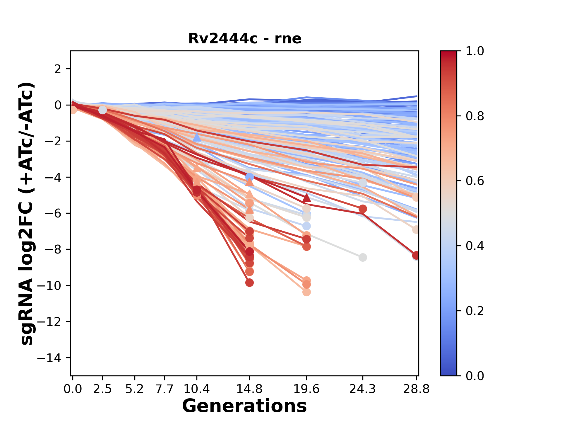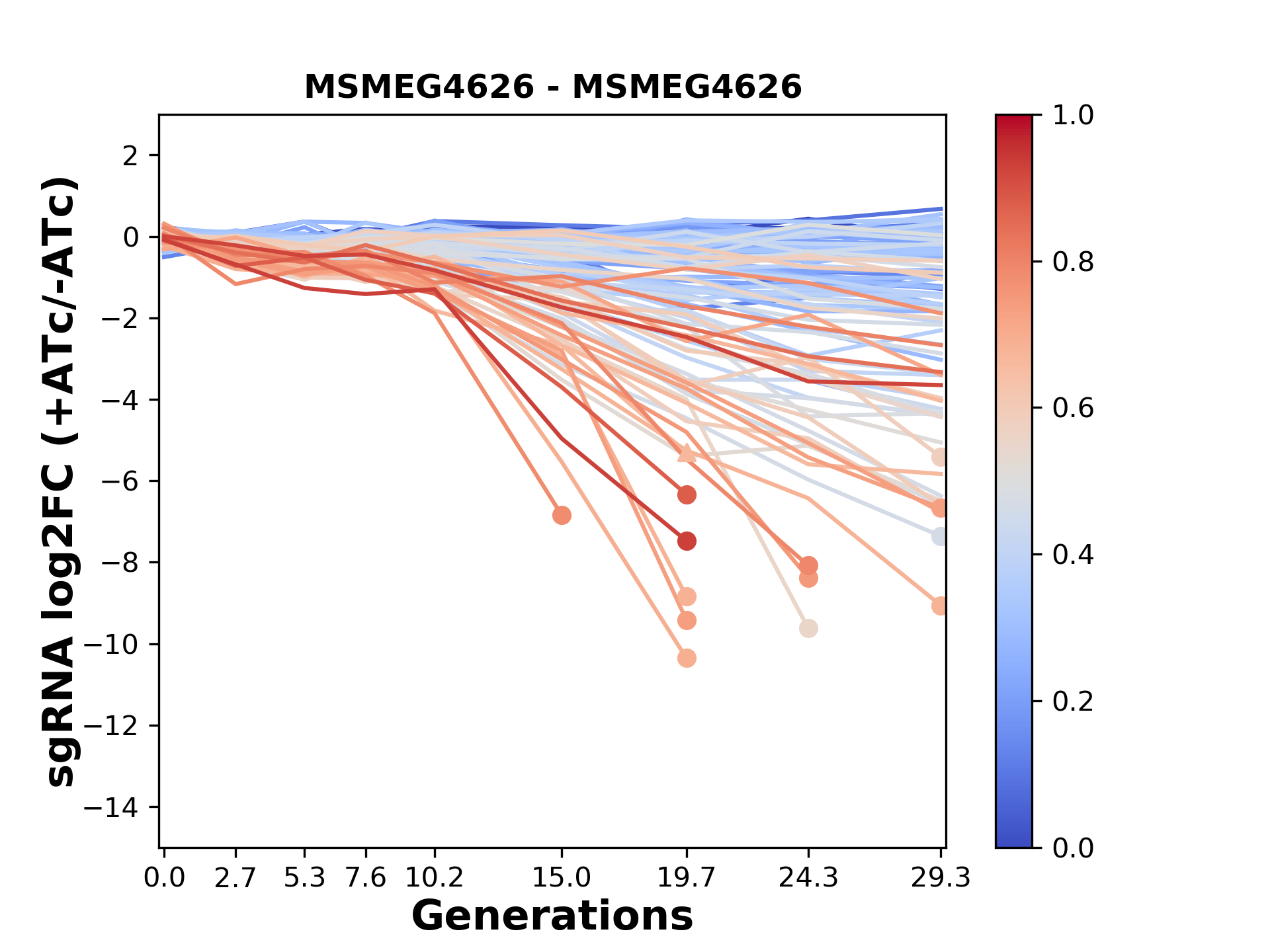 Here, we show sgRNA log2 fold-change values (L2FC) (plus versus minus ATc) over consecutive generations for sgRNAs targeting the gene you selected.