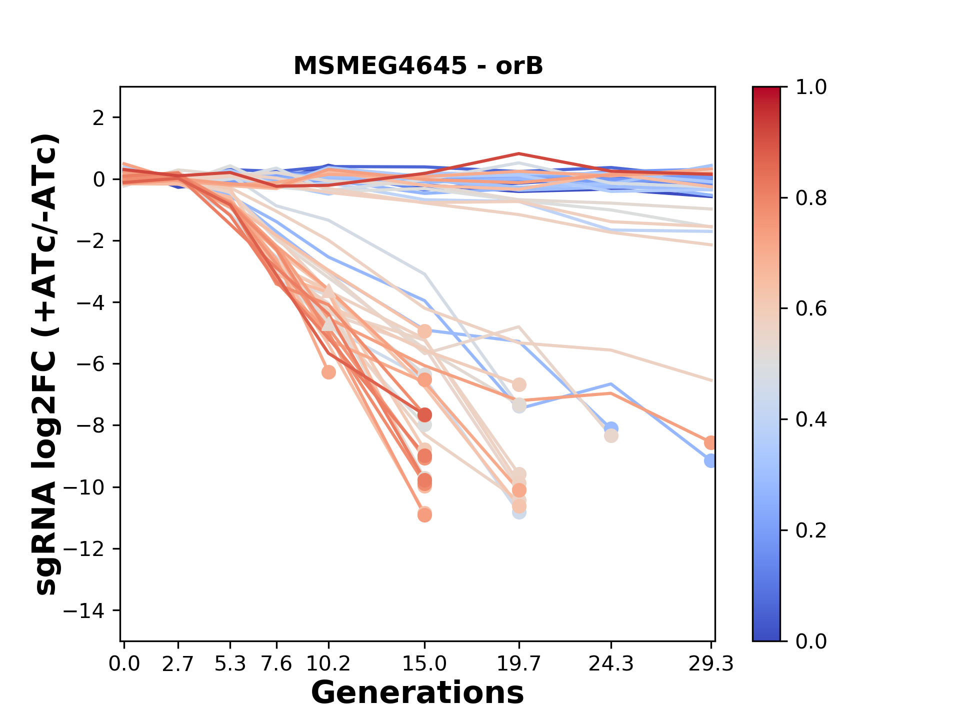 Here, we show sgRNA log2 fold-change values (L2FC) (plus versus minus ATc) over consecutive generations for sgRNAs targeting the gene you selected.