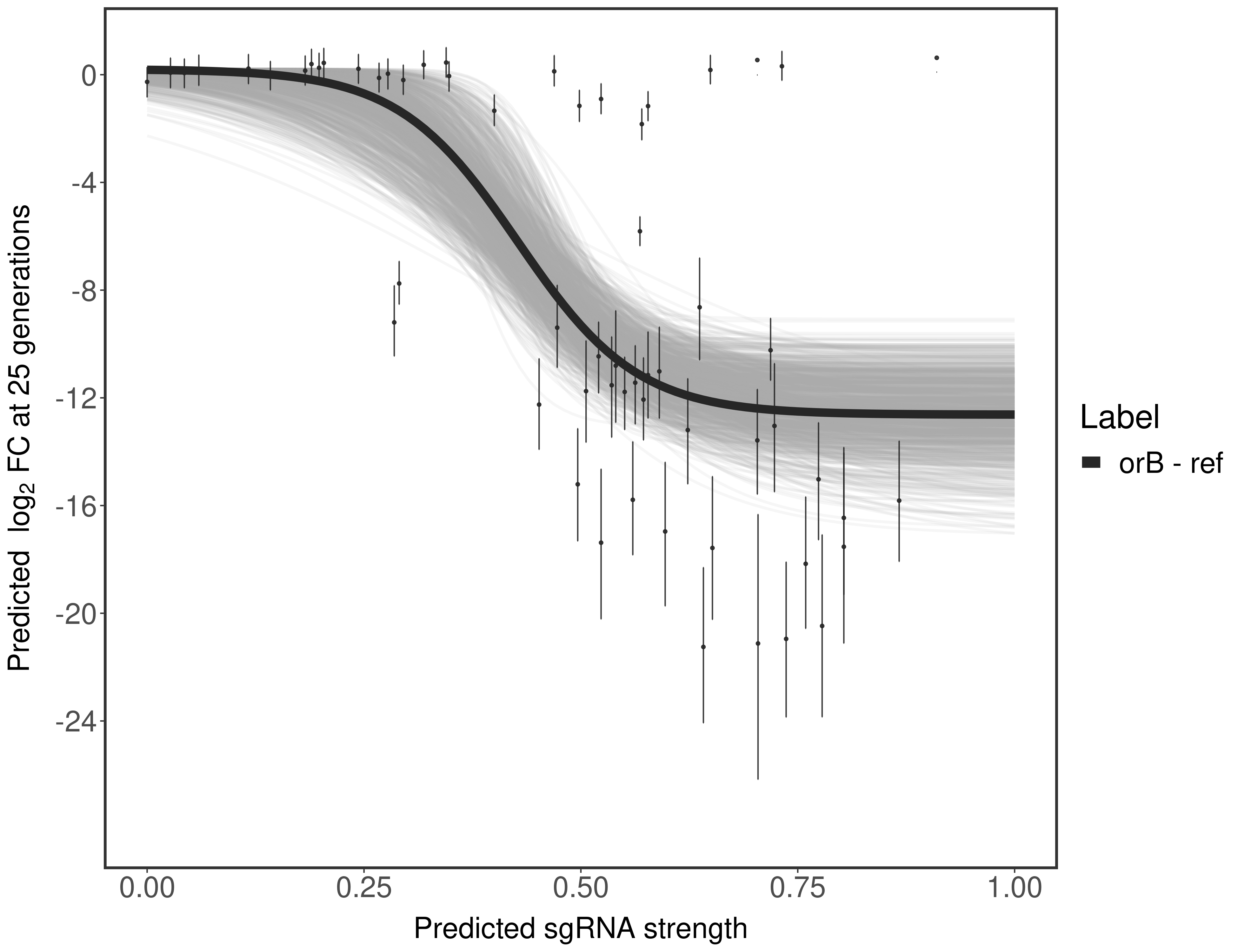 In order to quantify gene vulnerability, data were subsequently analyzed with a hierarchical model at the sgRNA level (two-line model) and gene level (Hill curve). The vulnerability quantification is shown below. [More information]