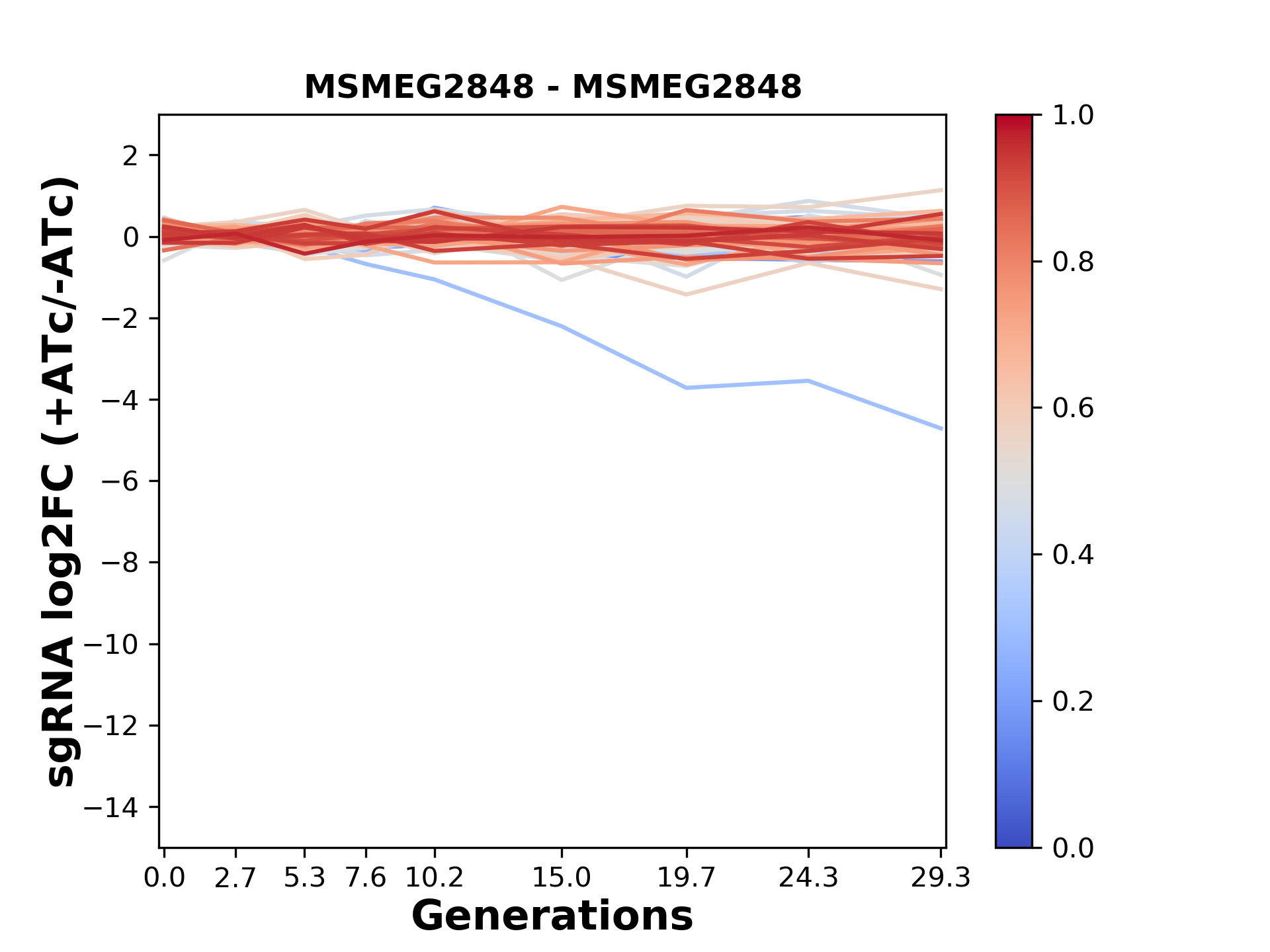 Here, we show sgRNA log2 fold-change values (L2FC) (plus versus minus ATc) over consecutive generations for sgRNAs targeting the gene you selected.