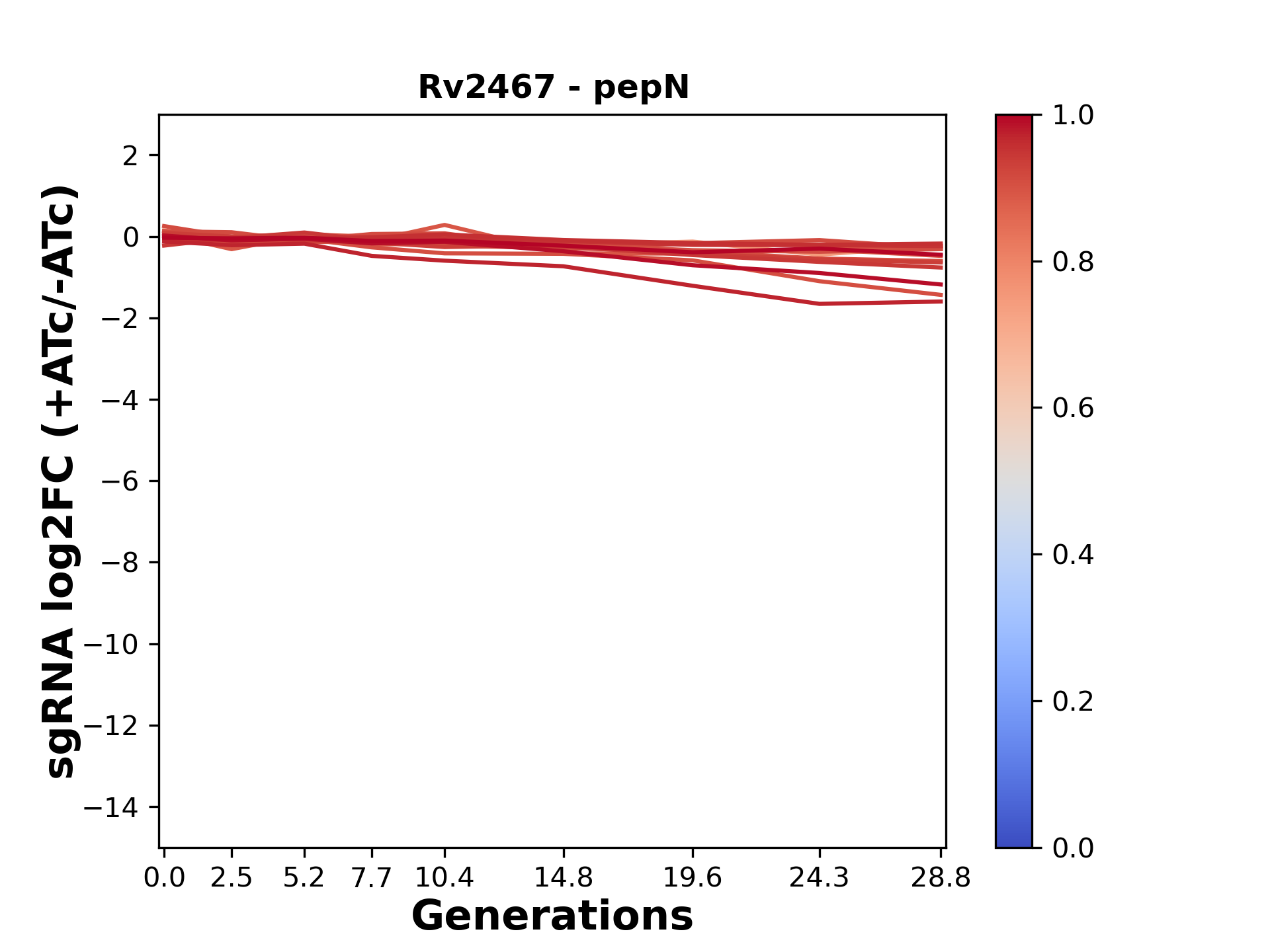 Here, we show sgRNA log2 fold-change values (L2FC) (plus versus minus ATc) over consecutive generations for sgRNAs targeting the gene you selected.