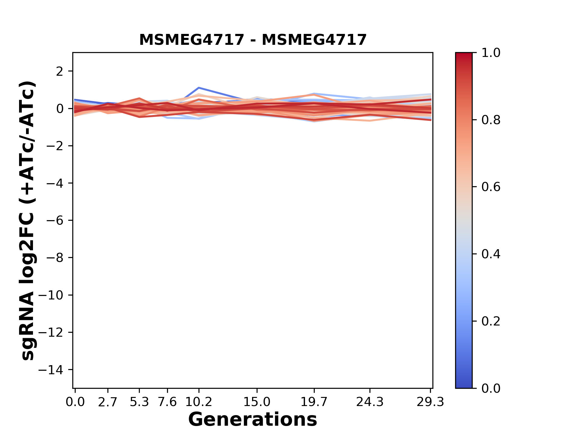 Experiment: We designed an M. tuberculosis CRISPRi library (RLC12) to target all annotated Mtb genes with single guide RNAs (sgRNAs) of varying predicted knockdown efficiencies. In parallel, we constructed a M. smegmatis CRISPRi library (RLC11) to target all annotated Msmeg genes, similar to the Mtb sgRNA library. RLC12 was transformed into M. tuberculosis H37Rv; RLC11 into M. smegmatis mc2-155. We passaged both CRISPRi libraries for nearly 30 generations in the presence or absence of the CRISPRi-inducer anhydrotetracycline (ATc). At the indicated timepoints, genomic DNA was harvested and the representation of individual sgRNAs was counted using Illumina sequencing. Here, we show sgRNA log2 fold-change values (L2FC) (plus versus minus ATc) over consecutive generations for sgRNAs targeting the gene you selected. sgRNAs are color-coded based on their predicted strength from blue (strength=0; weak) to red (strength=1; strong).