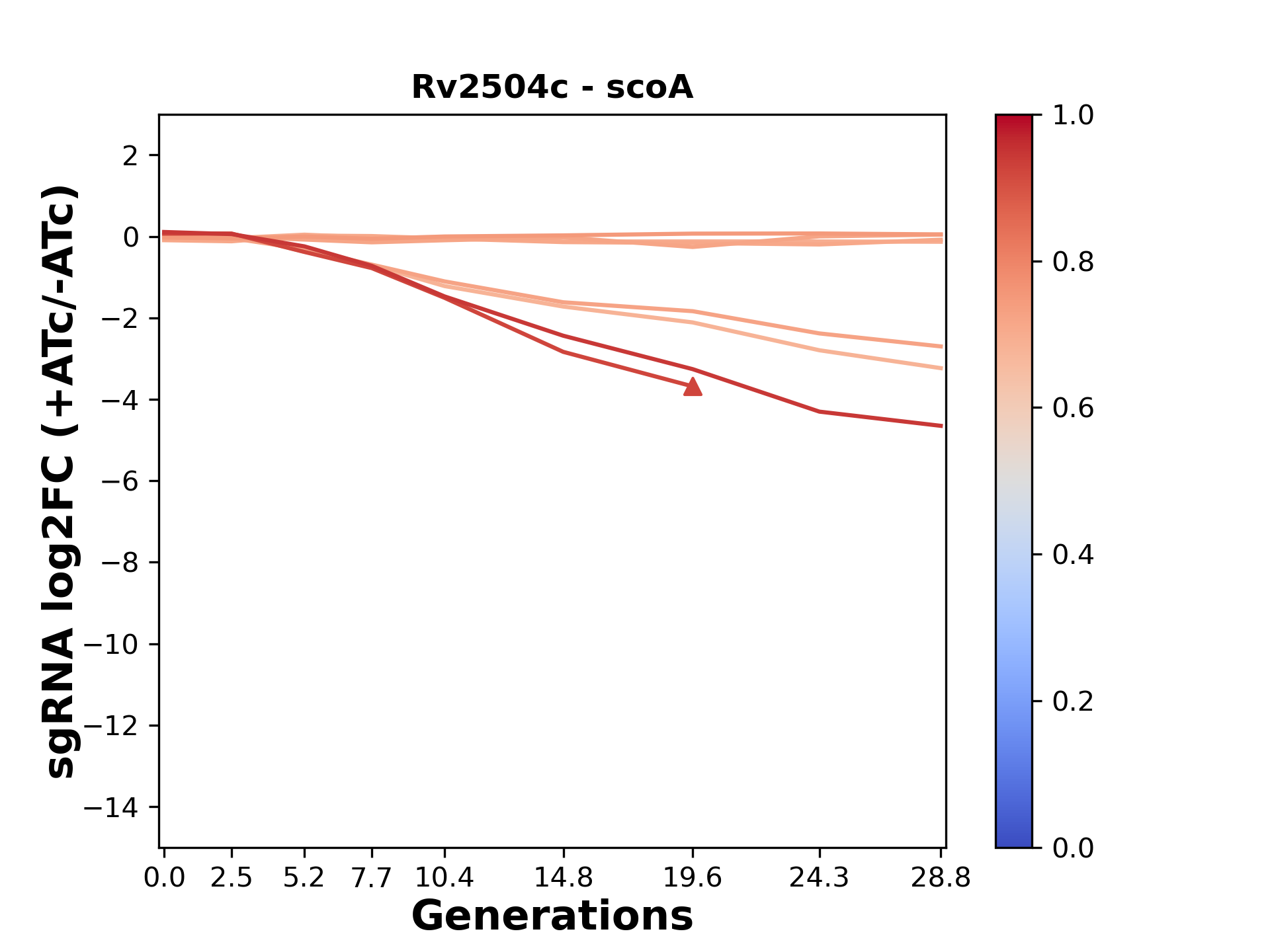Here, we show sgRNA log2 fold-change values (L2FC) (plus versus minus ATc) over consecutive generations for sgRNAs targeting the gene you selected.