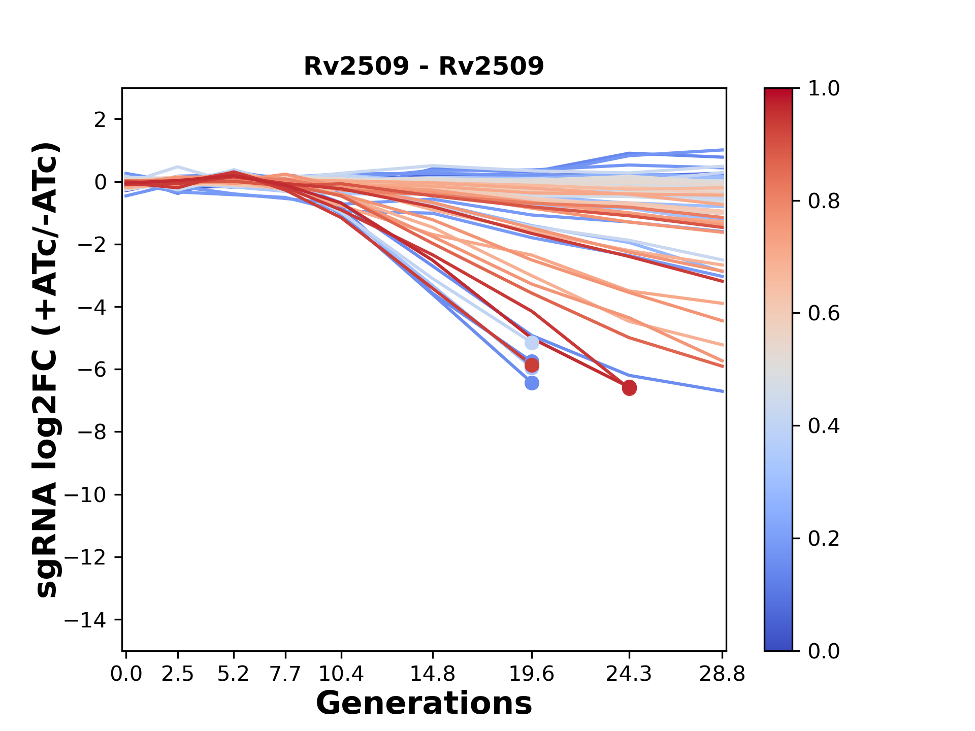 Here, we show sgRNA log2 fold-change values (L2FC) (plus versus minus ATc) over consecutive generations for sgRNAs targeting the gene you selected.