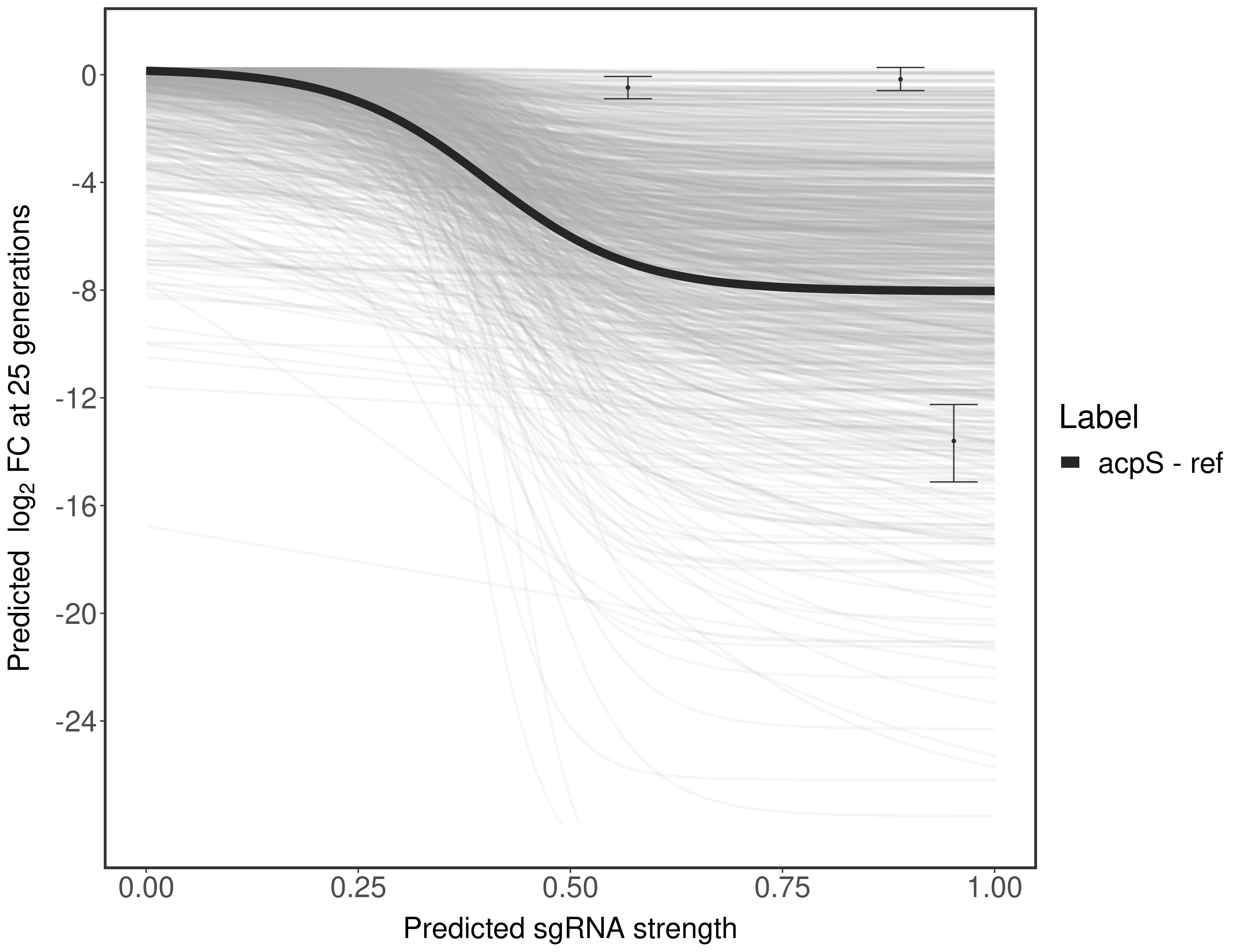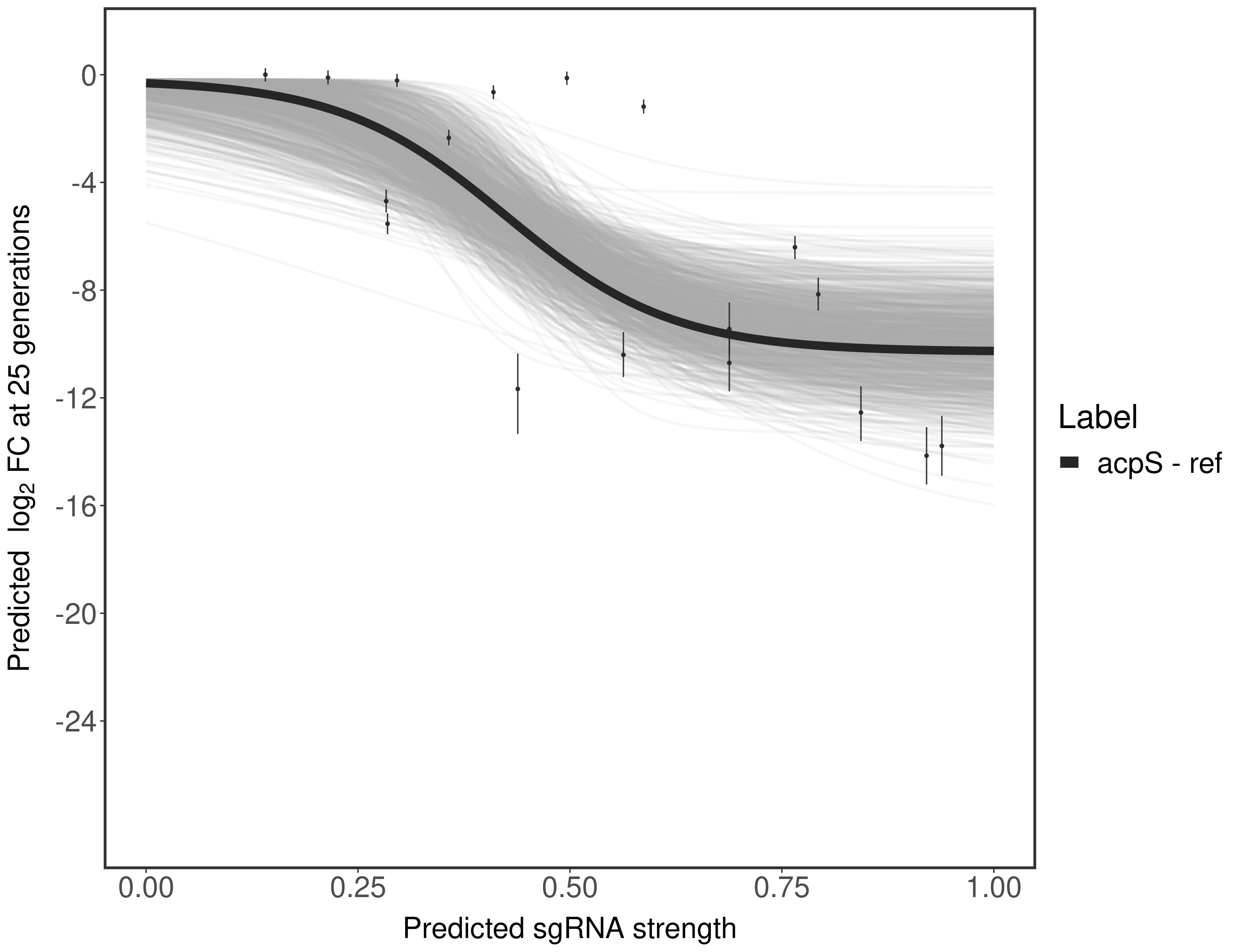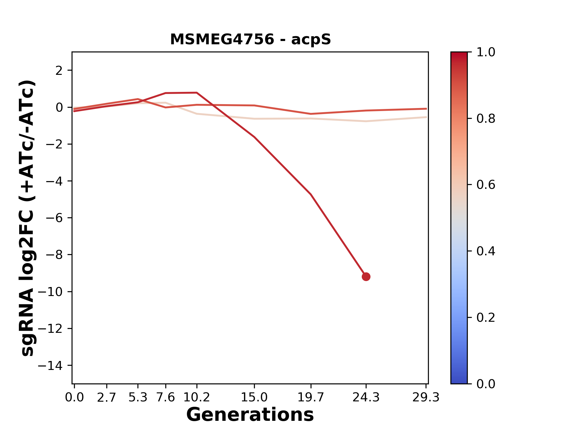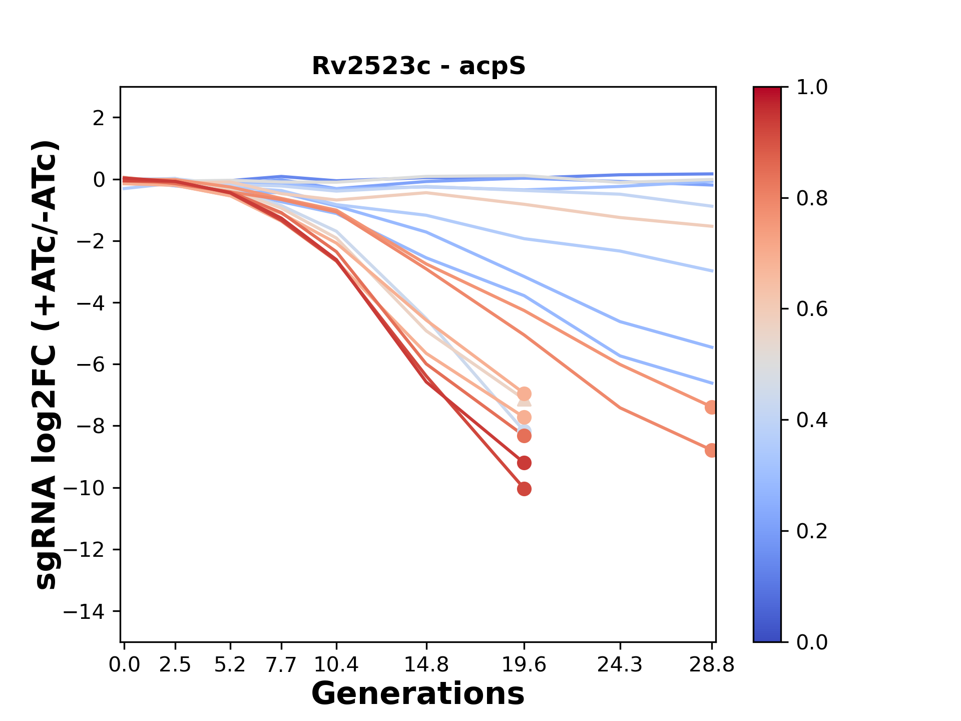 Here, we show sgRNA log2 fold-change values (L2FC) (plus versus minus ATc) over consecutive generations for sgRNAs targeting the gene you selected.