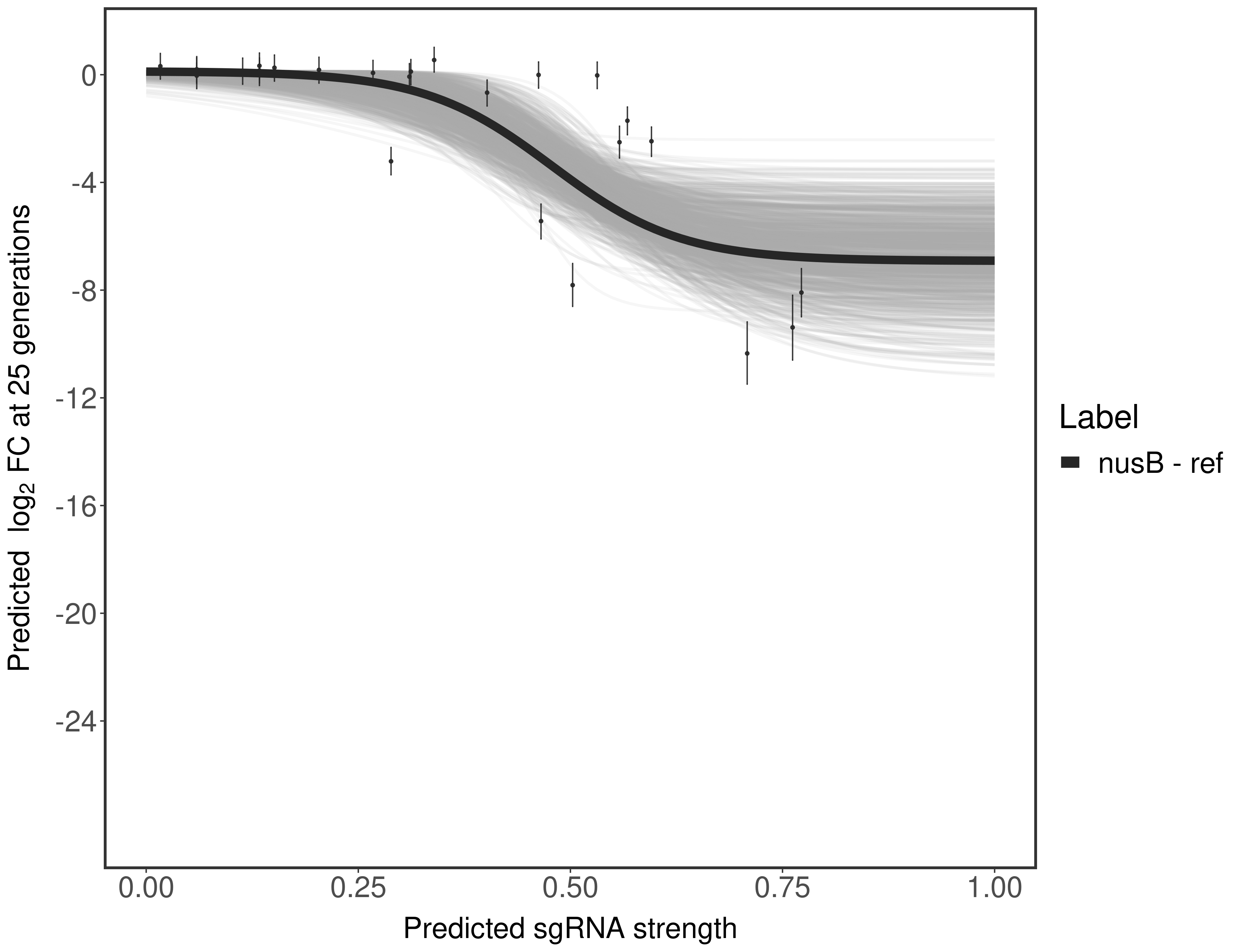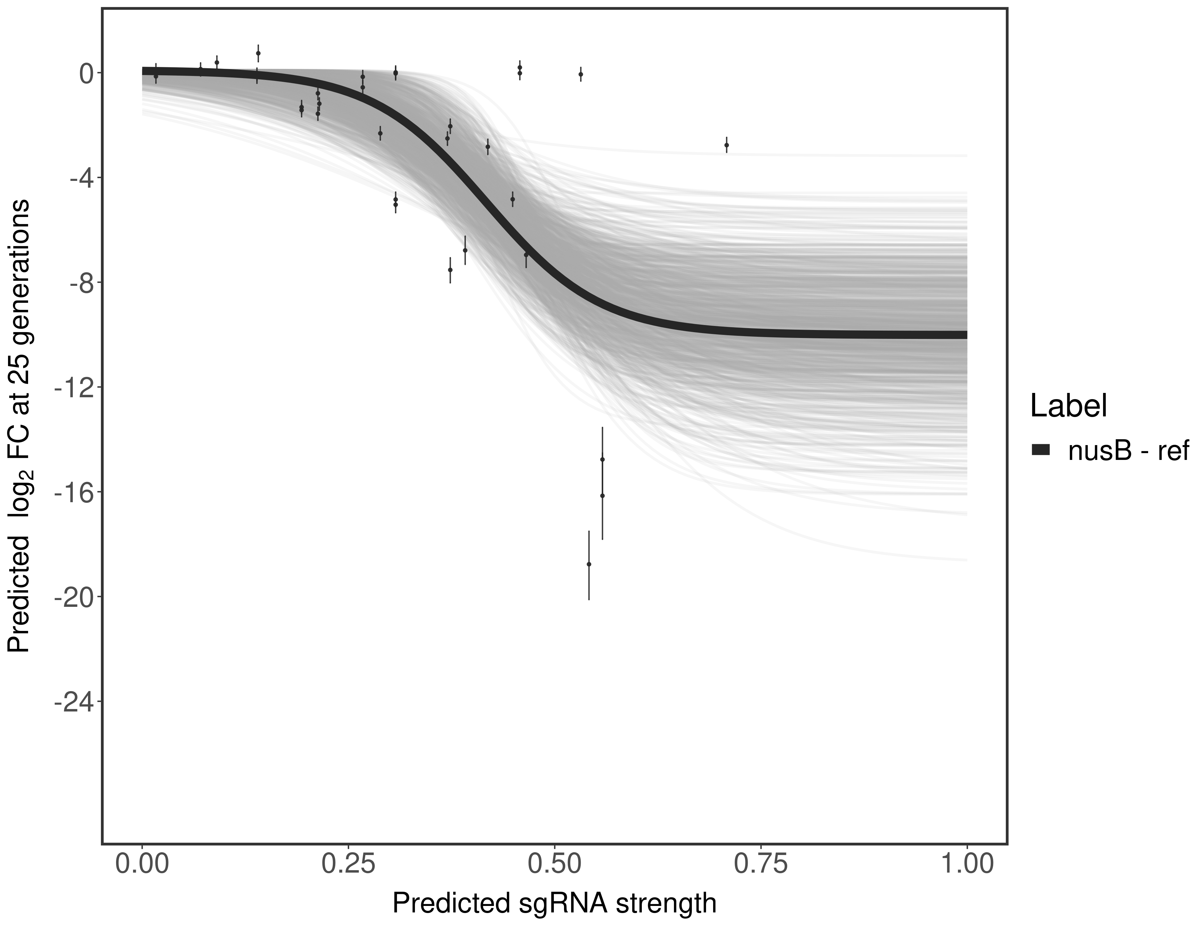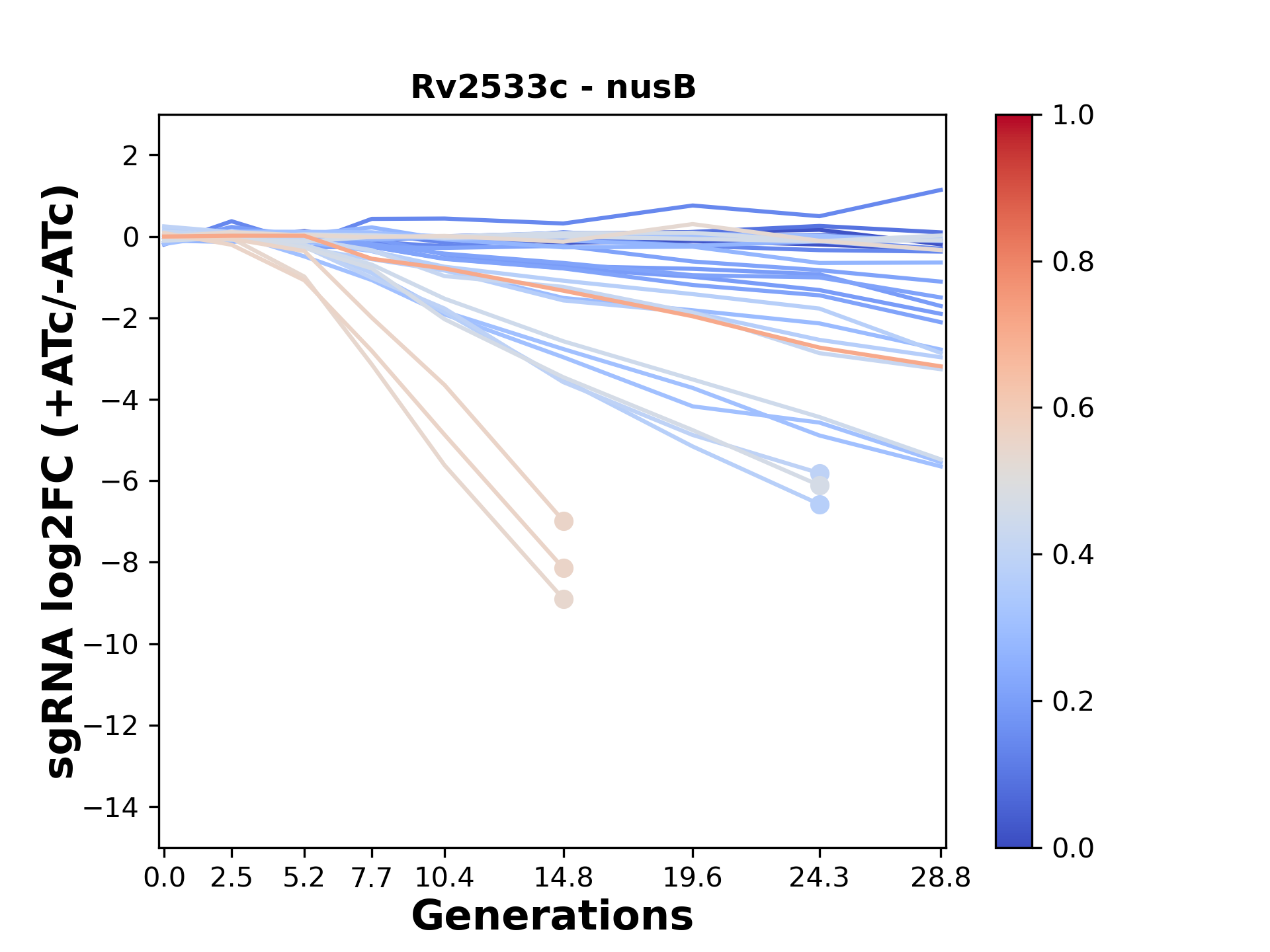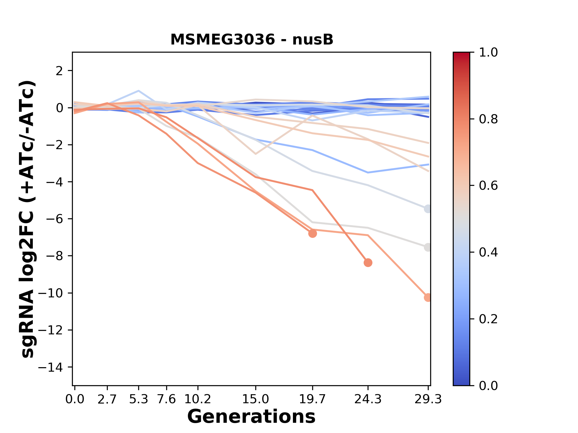 Here, we show sgRNA log2 fold-change values (L2FC) (plus versus minus ATc) over consecutive generations for sgRNAs targeting the gene you selected.