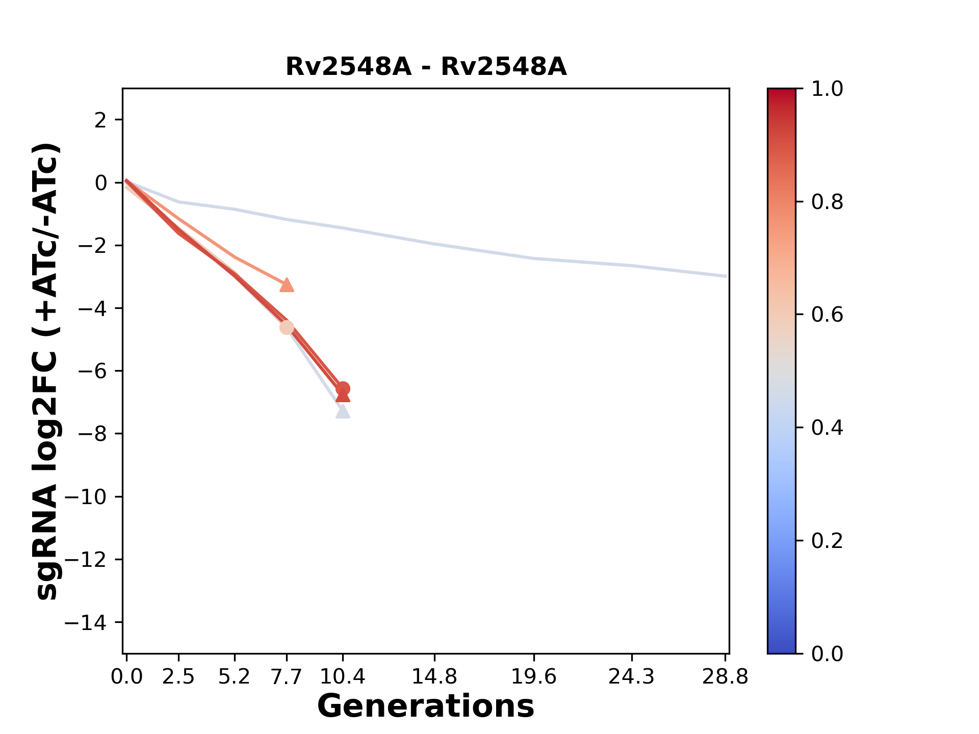Here, we show sgRNA log2 fold-change values (L2FC) (plus versus minus ATc) over consecutive generations for sgRNAs targeting the gene you selected.