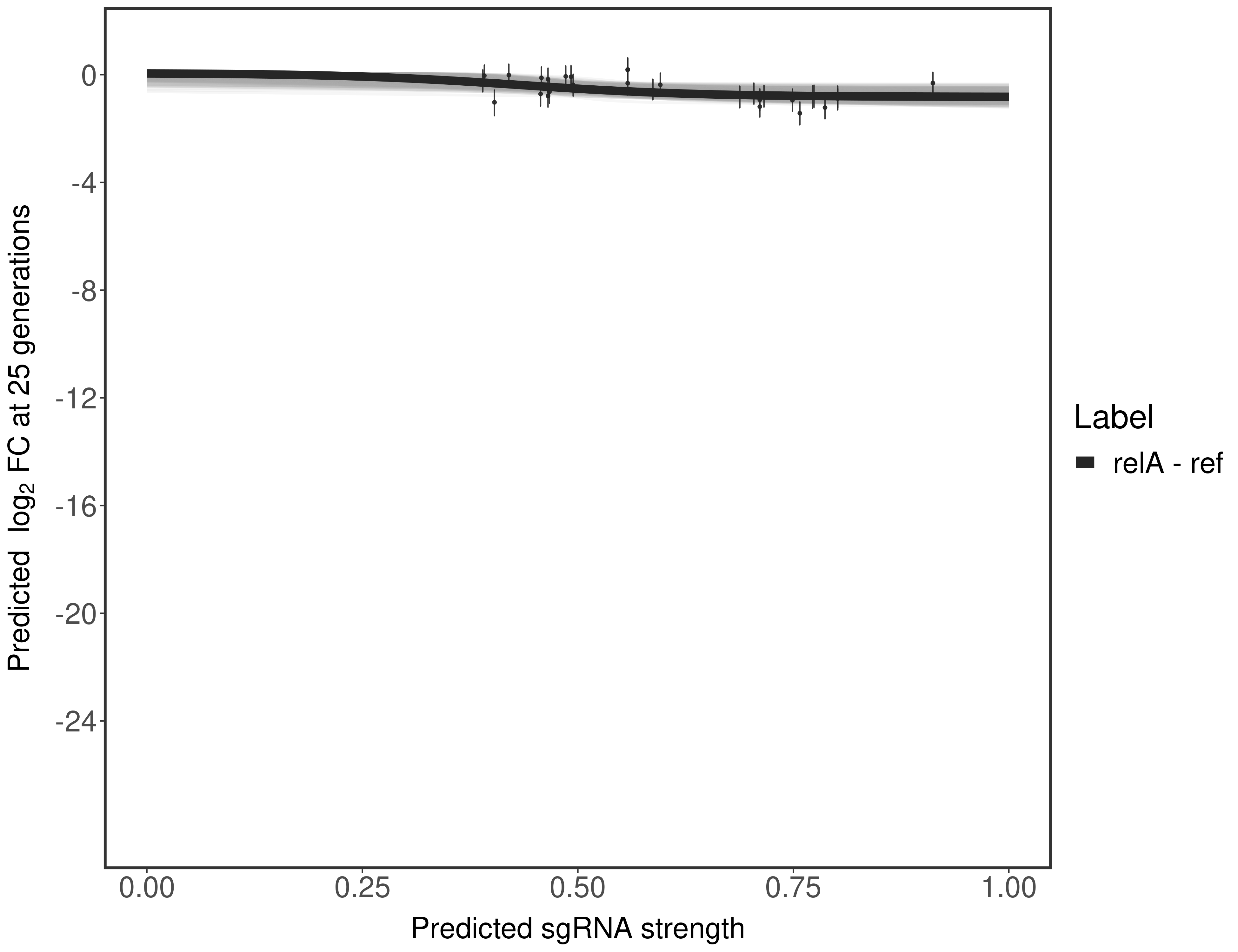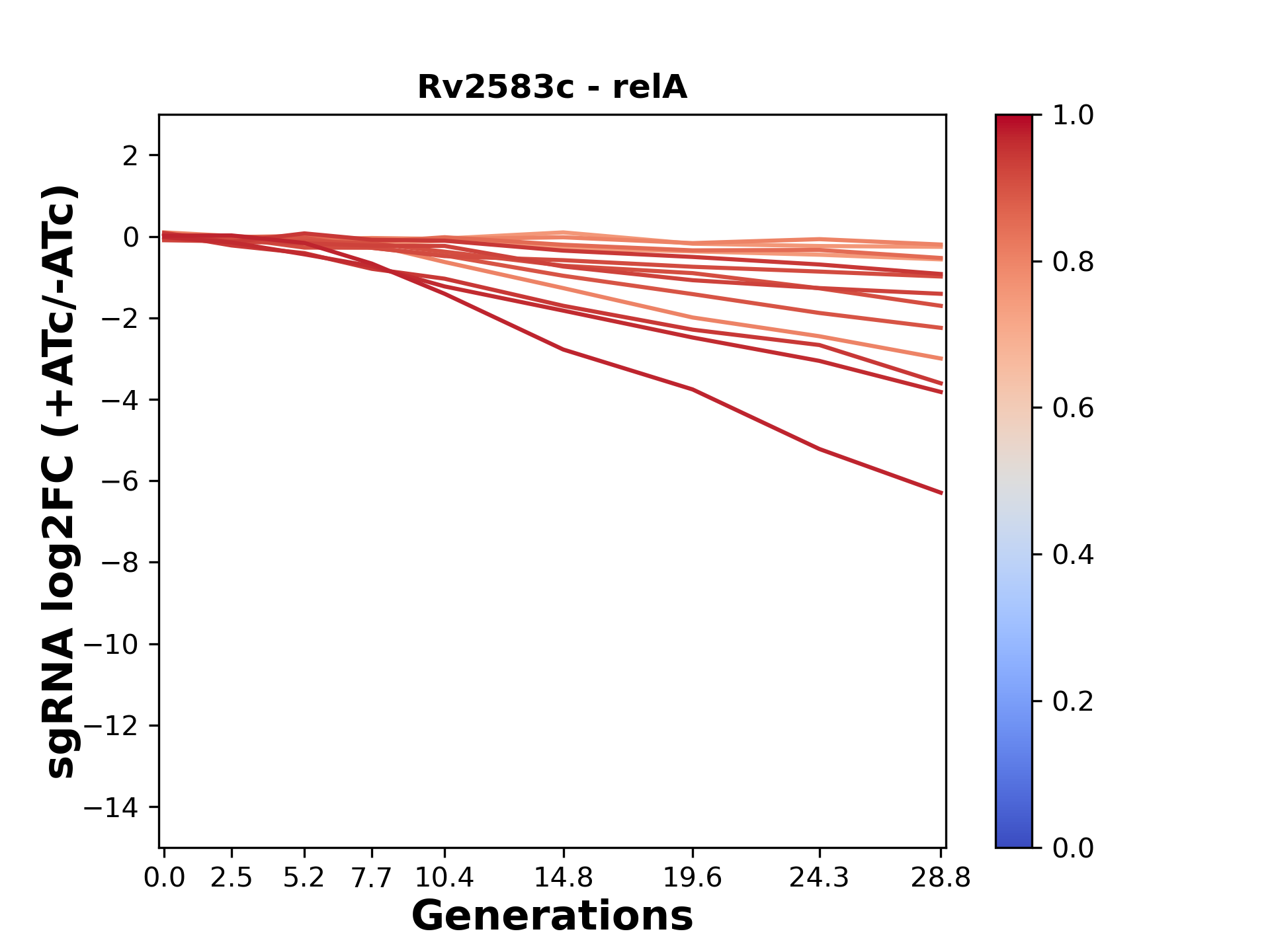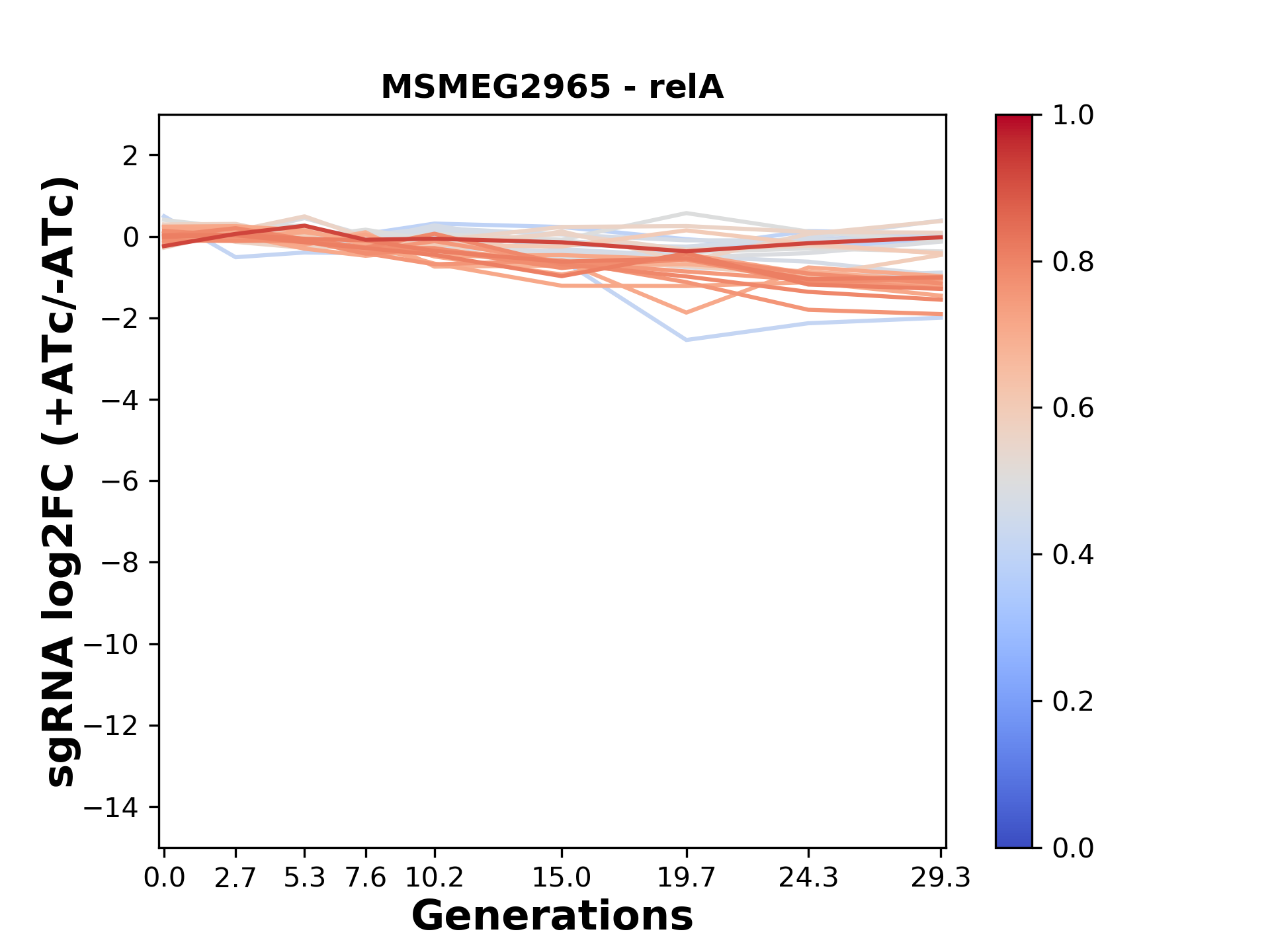 Here, we show sgRNA log2 fold-change values (L2FC) (plus versus minus ATc) over consecutive generations for sgRNAs targeting the gene you selected.