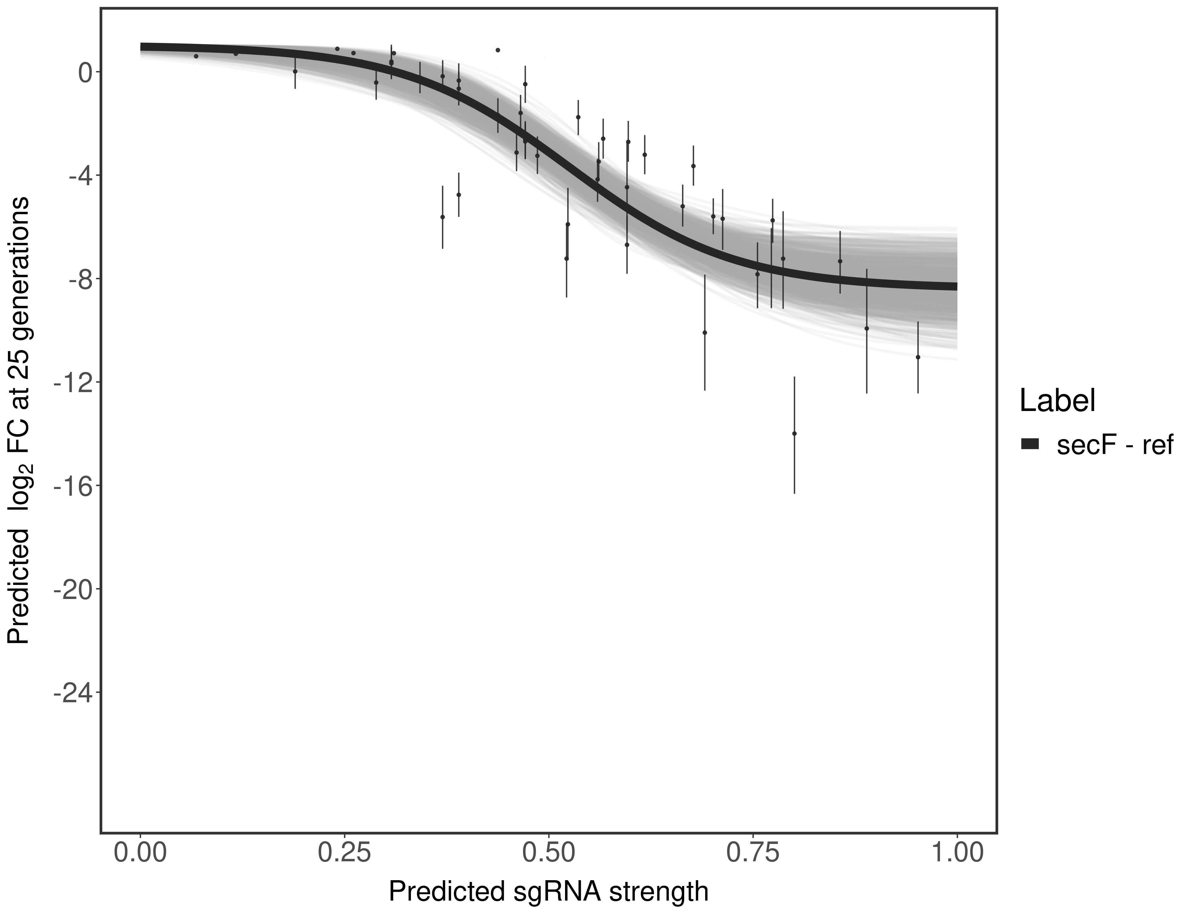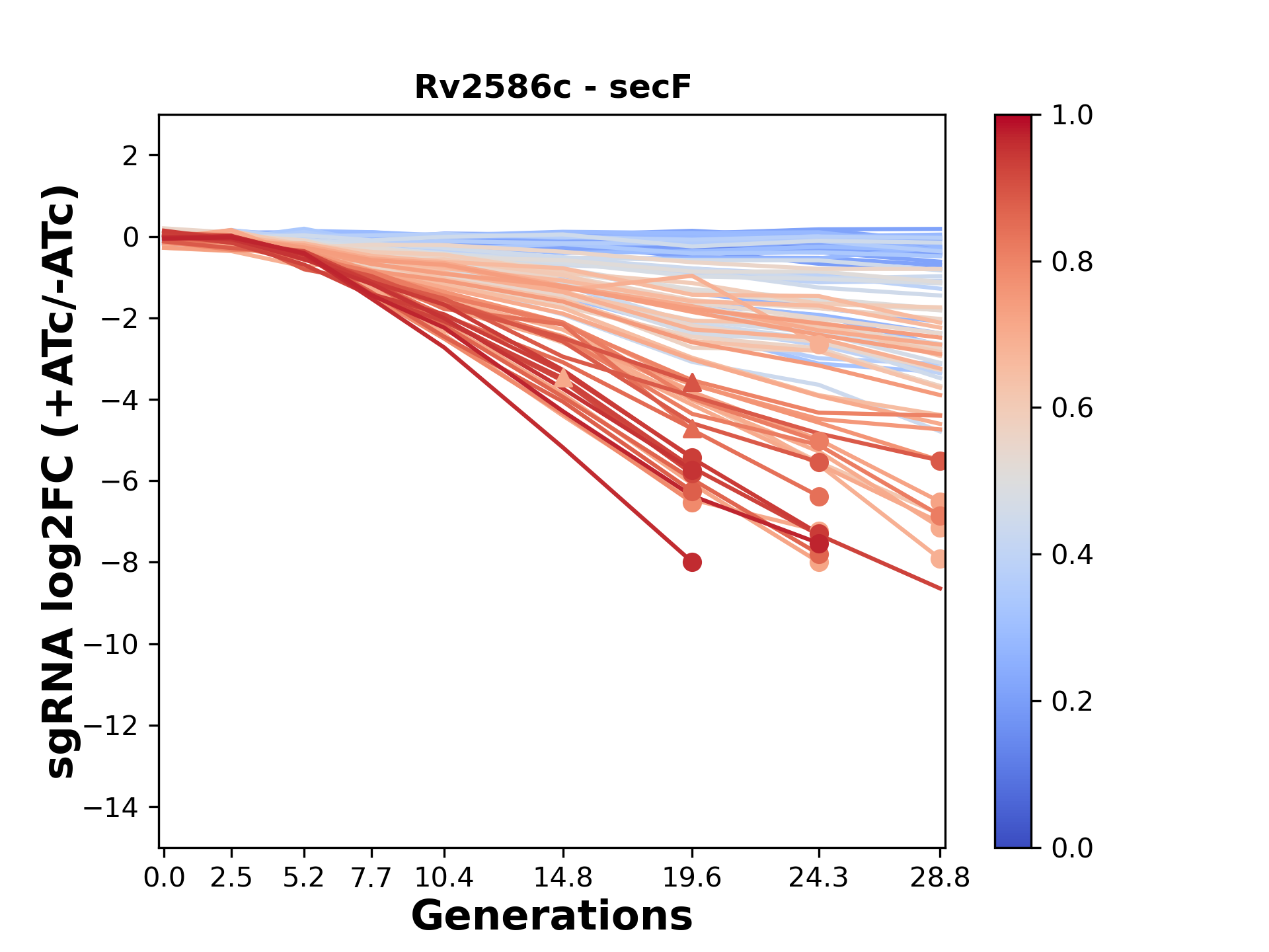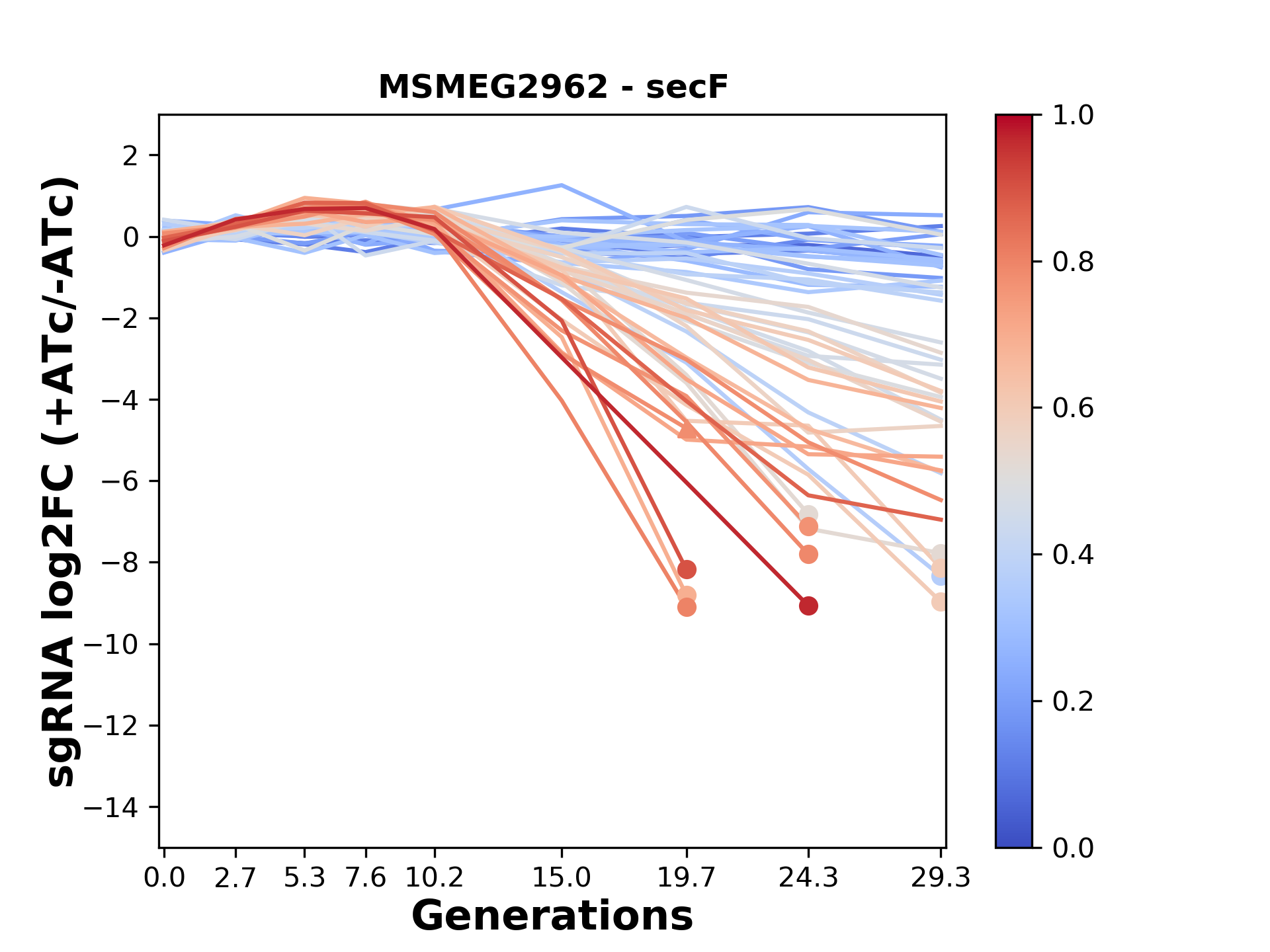 Experiment: We designed an M. tuberculosis CRISPRi library (RLC12) to target all annotated Mtb genes with single guide RNAs (sgRNAs) of varying predicted knockdown efficiencies. In parallel, we constructed a M. smegmatis CRISPRi library (RLC11) to target all annotated Msmeg genes, similar to the Mtb sgRNA library. RLC12 was transformed into M. tuberculosis H37Rv; RLC11 into M. smegmatis mc2-155. We passaged both CRISPRi libraries for nearly 30 generations in the presence or absence of the CRISPRi-inducer anhydrotetracycline (ATc). At the indicated timepoints, genomic DNA was harvested and the representation of individual sgRNAs was counted using Illumina sequencing. Here, we show sgRNA log2 fold-change values (L2FC) (plus versus minus ATc) over consecutive generations for sgRNAs targeting the gene you selected. sgRNAs are color-coded based on their predicted strength from blue (strength=0; weak) to red (strength=1; strong).