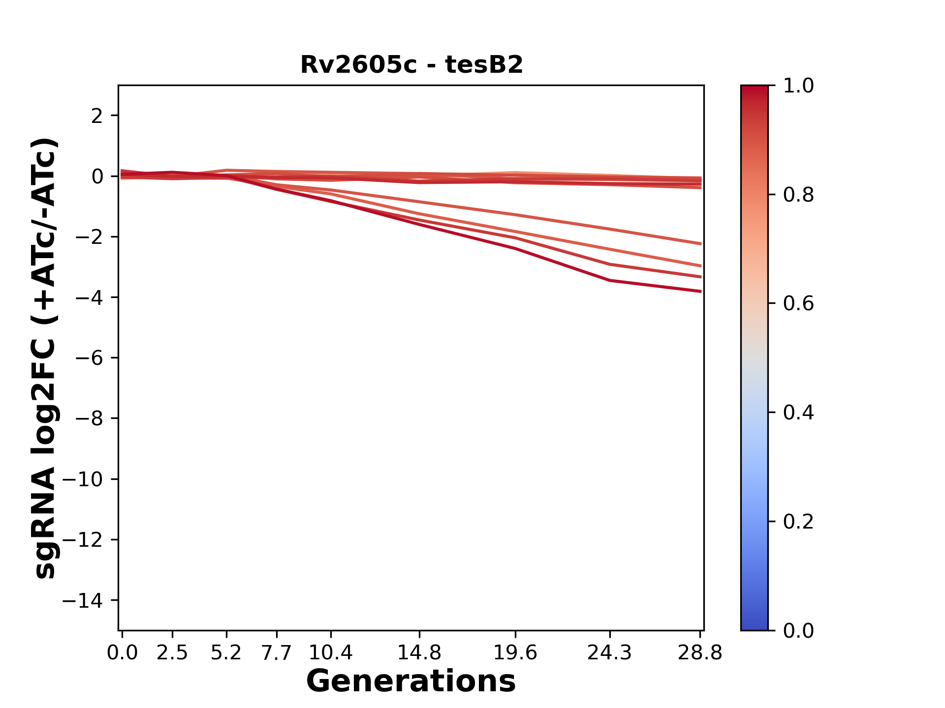 Here, we show sgRNA log2 fold-change values (L2FC) (plus versus minus ATc) over consecutive generations for sgRNAs targeting the gene you selected.