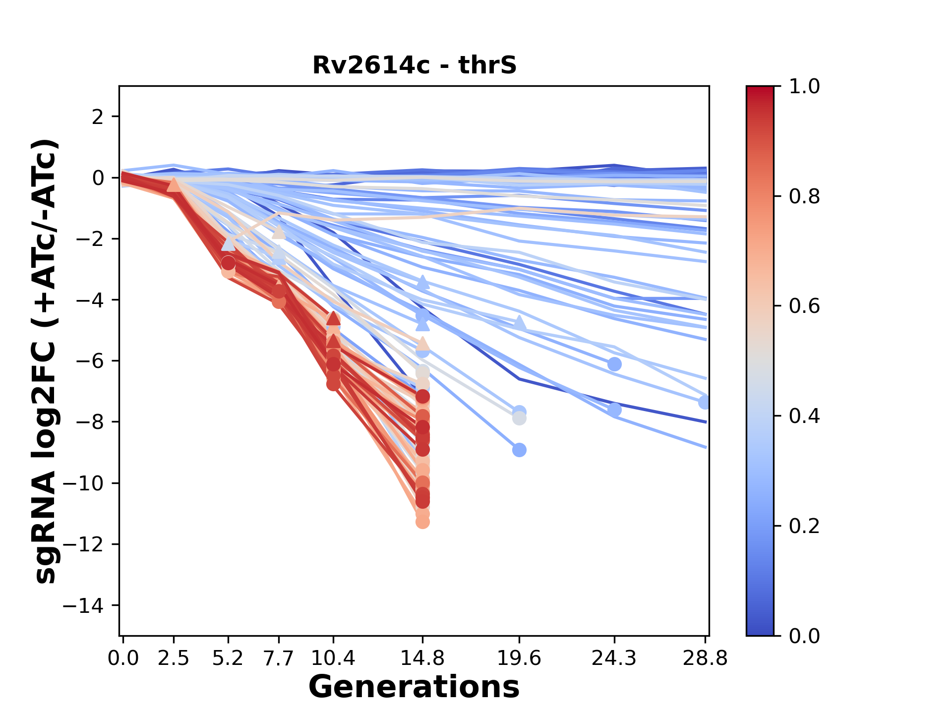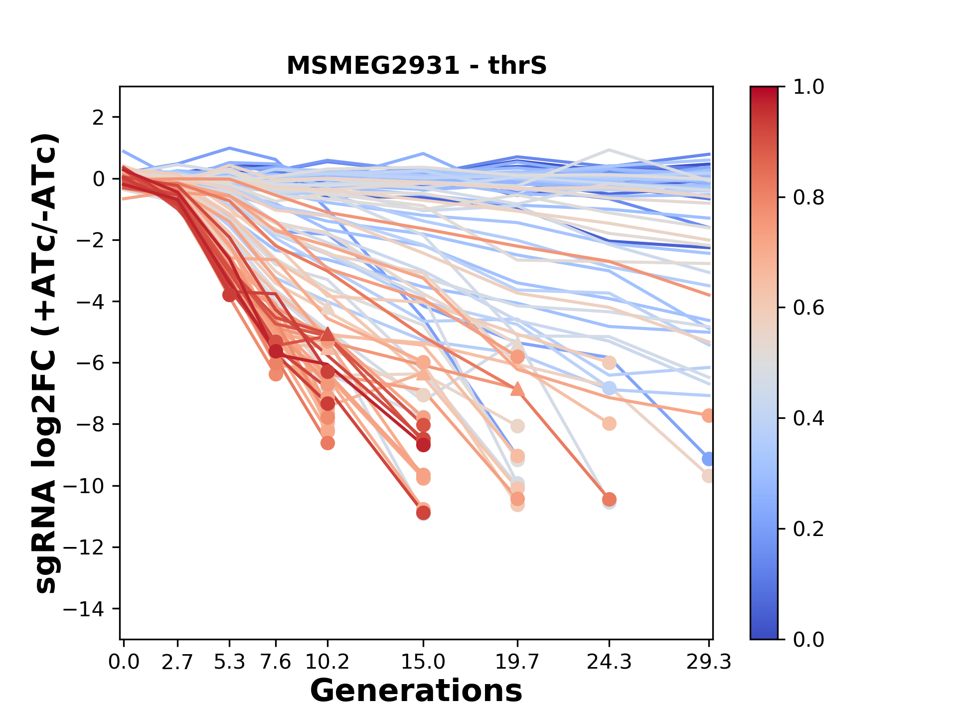 Experiment: We designed an M. tuberculosis CRISPRi library (RLC12) to target all annotated Mtb genes with single guide RNAs (sgRNAs) of varying predicted knockdown efficiencies. In parallel, we constructed a M. smegmatis CRISPRi library (RLC11) to target all annotated Msmeg genes, similar to the Mtb sgRNA library. RLC12 was transformed into M. tuberculosis H37Rv; RLC11 into M. smegmatis mc2-155. We passaged both CRISPRi libraries for nearly 30 generations in the presence or absence of the CRISPRi-inducer anhydrotetracycline (ATc). At the indicated timepoints, genomic DNA was harvested and the representation of individual sgRNAs was counted using Illumina sequencing. Here, we show sgRNA log2 fold-change values (L2FC) (plus versus minus ATc) over consecutive generations for sgRNAs targeting the gene you selected. sgRNAs are color-coded based on their predicted strength from blue (strength=0; weak) to red (strength=1; strong).