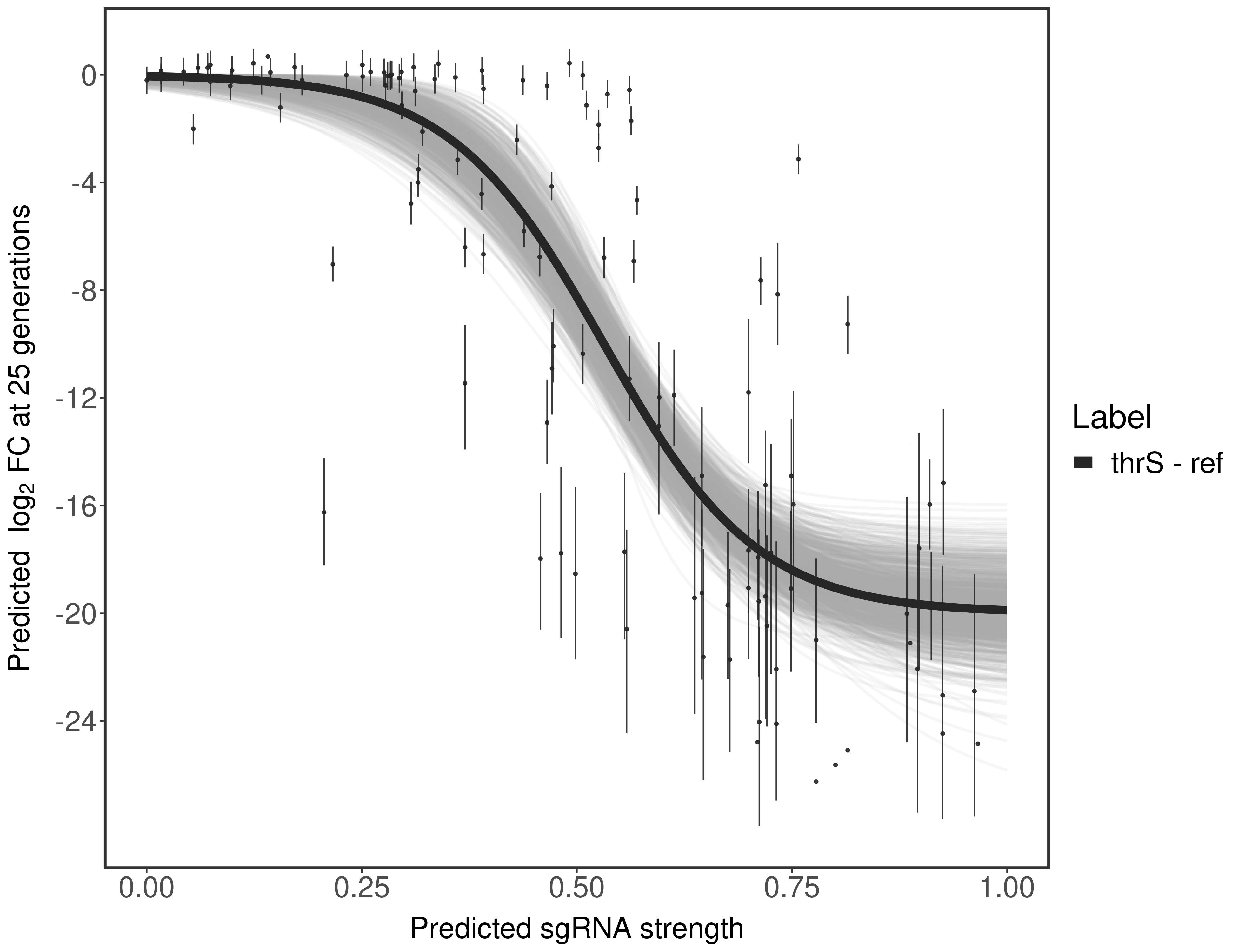 In order to quantify gene vulnerability, data were subsequently analyzed with a hierarchical model at the sgRNA level (two-line model) and gene level (Hill curve). The vulnerability quantification is shown below. [More information]