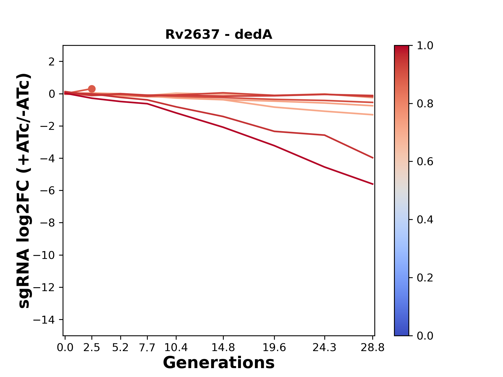 Here, we show sgRNA log2 fold-change values (L2FC) (plus versus minus ATc) over consecutive generations for sgRNAs targeting the gene you selected.