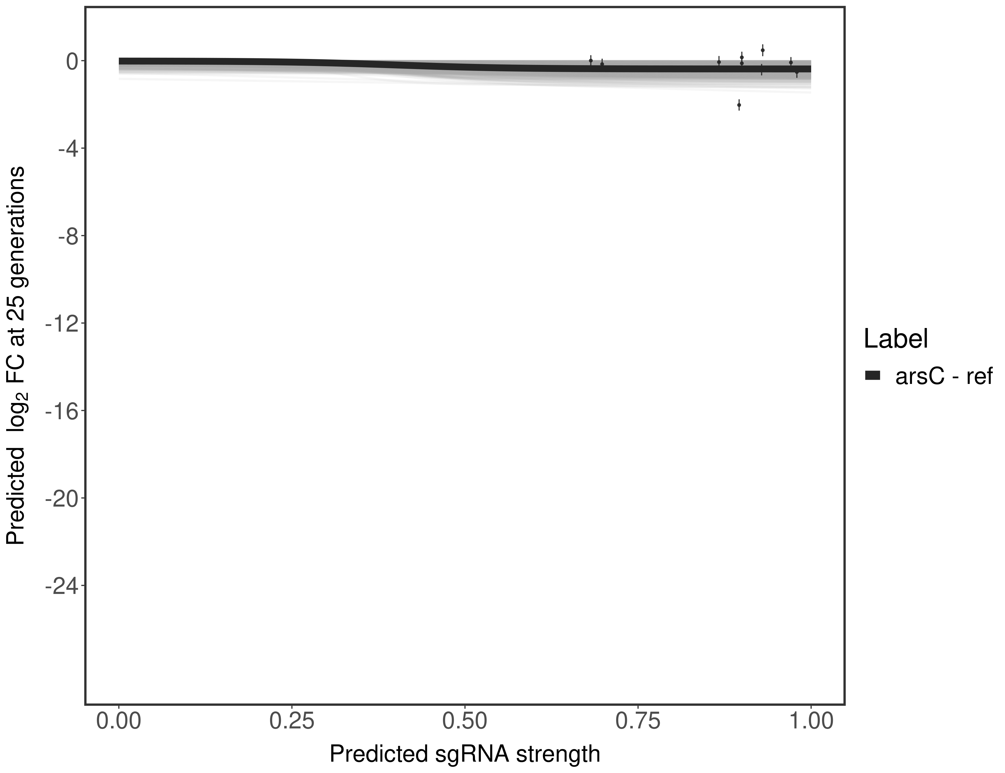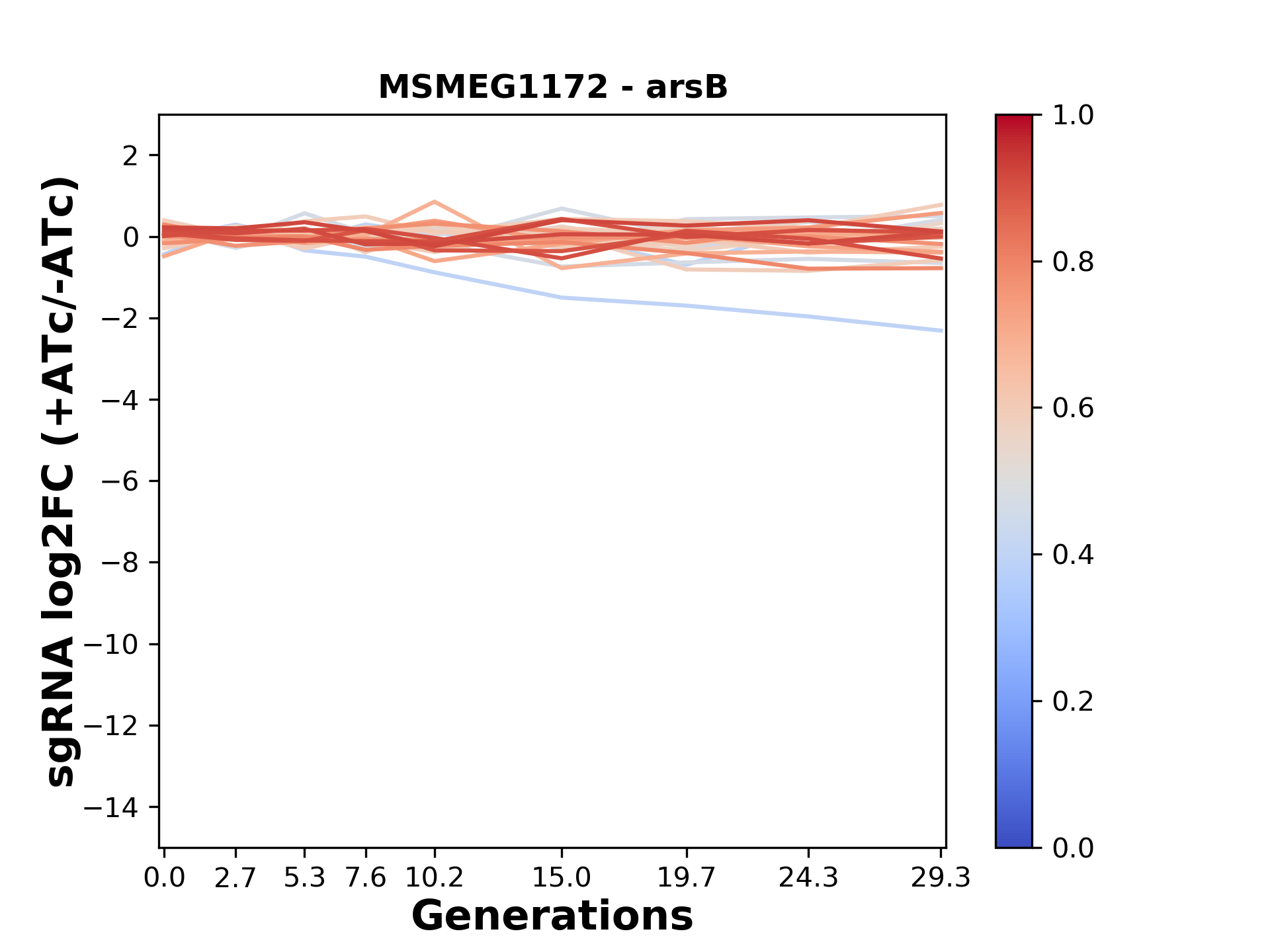 Here, we show sgRNA log2 fold-change values (L2FC) (plus versus minus ATc) over consecutive generations for sgRNAs targeting the gene you selected.