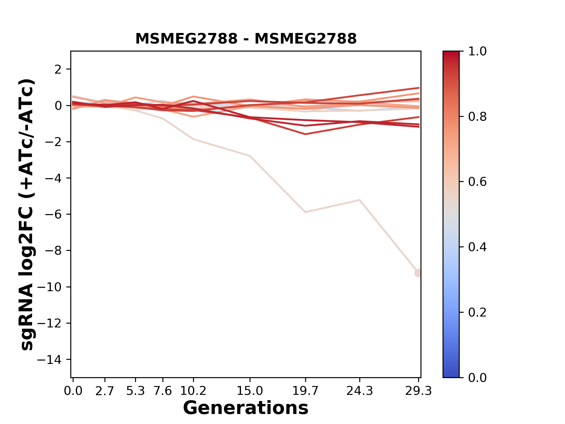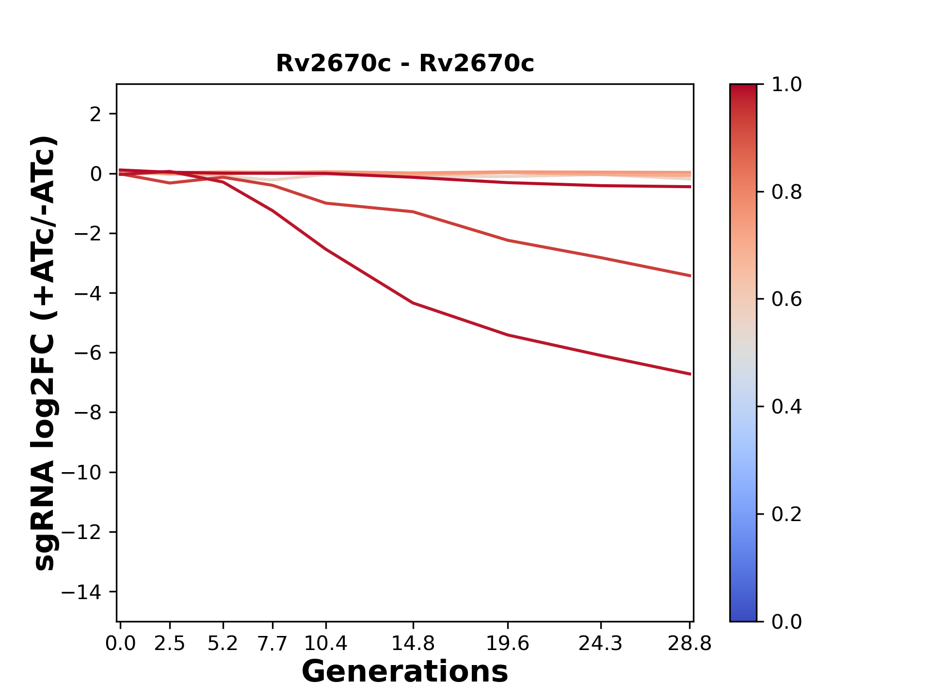 Here, we show sgRNA log2 fold-change values (L2FC) (plus versus minus ATc) over consecutive generations for sgRNAs targeting the gene you selected.