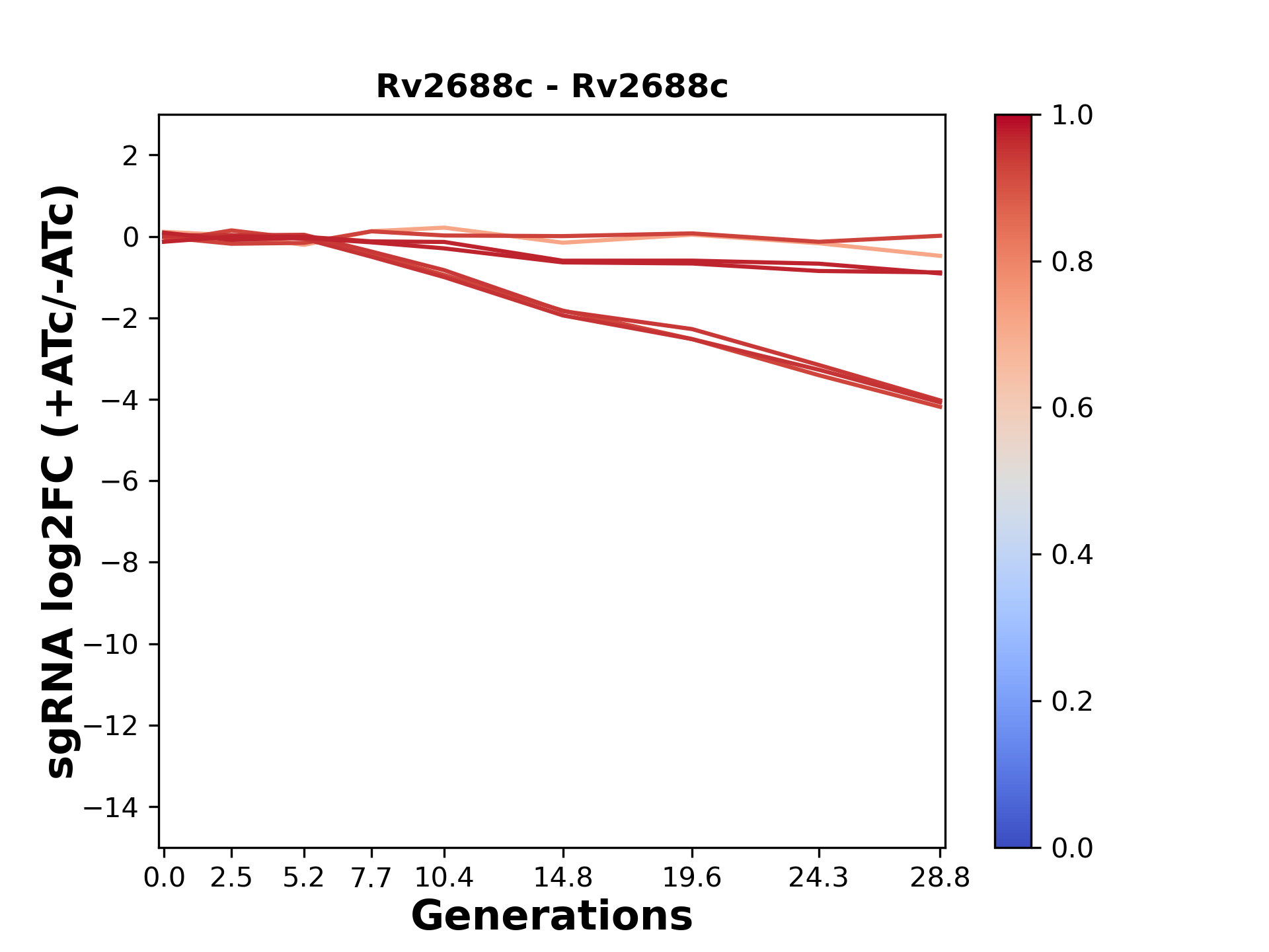 Here, we show sgRNA log2 fold-change values (L2FC) (plus versus minus ATc) over consecutive generations for sgRNAs targeting the gene you selected.