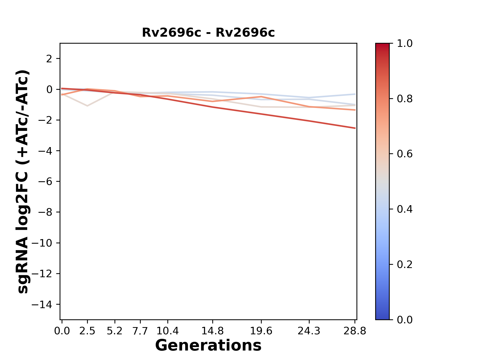 Here, we show sgRNA log2 fold-change values (L2FC) (plus versus minus ATc) over consecutive generations for sgRNAs targeting the gene you selected.
