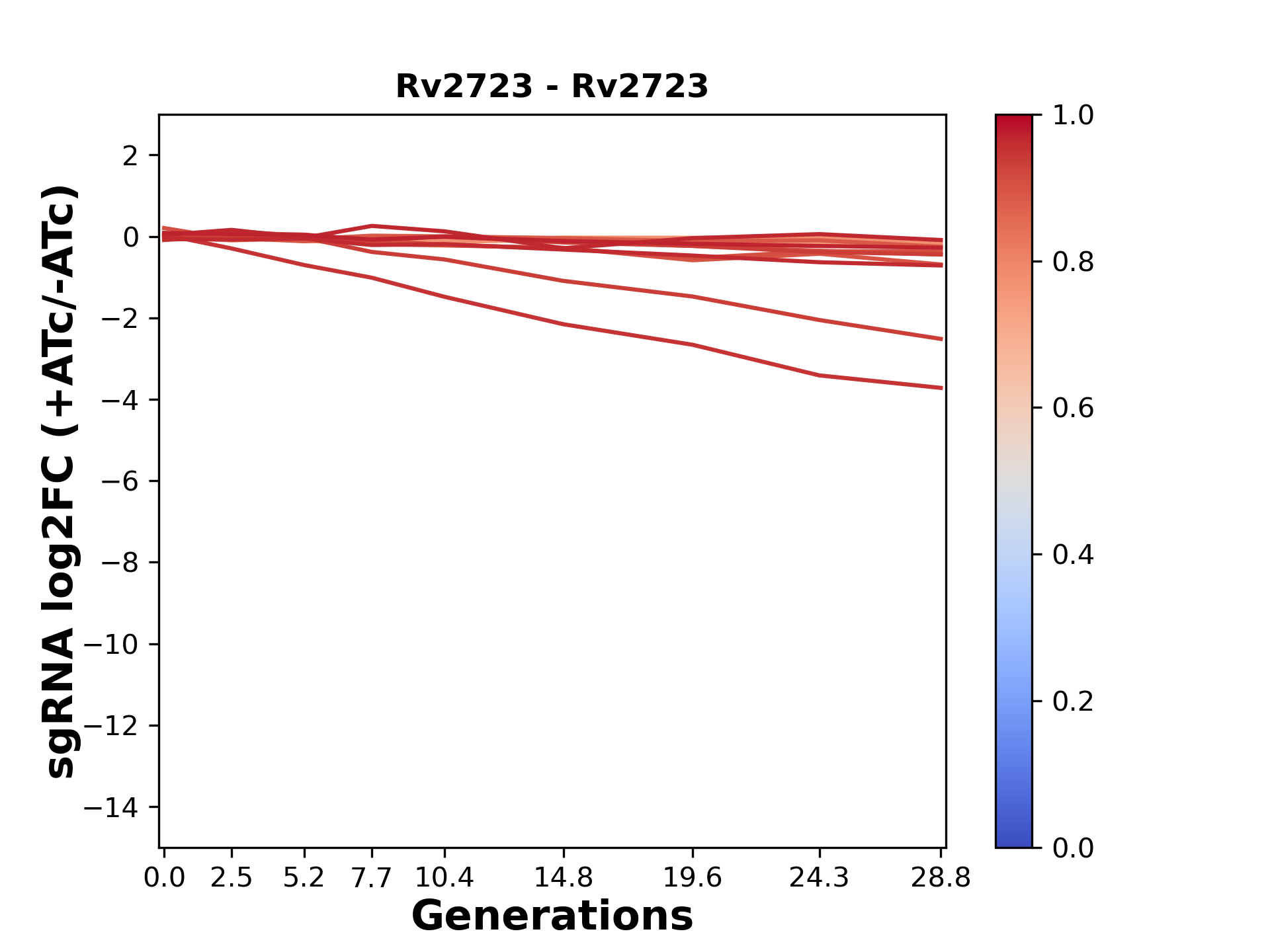 Experiment: We designed an M. tuberculosis CRISPRi library (RLC12) to target all annotated Mtb genes with single guide RNAs (sgRNAs) of varying predicted knockdown efficiencies. In parallel, we constructed a M. smegmatis CRISPRi library (RLC11) to target all annotated Msmeg genes, similar to the Mtb sgRNA library. RLC12 was transformed into M. tuberculosis H37Rv; RLC11 into M. smegmatis mc2-155. We passaged both CRISPRi libraries for nearly 30 generations in the presence or absence of the CRISPRi-inducer anhydrotetracycline (ATc). At the indicated timepoints, genomic DNA was harvested and the representation of individual sgRNAs was counted using Illumina sequencing. Here, we show sgRNA log2 fold-change values (L2FC) (plus versus minus ATc) over consecutive generations for sgRNAs targeting the gene you selected. sgRNAs are color-coded based on their predicted strength from blue (strength=0; weak) to red (strength=1; strong).