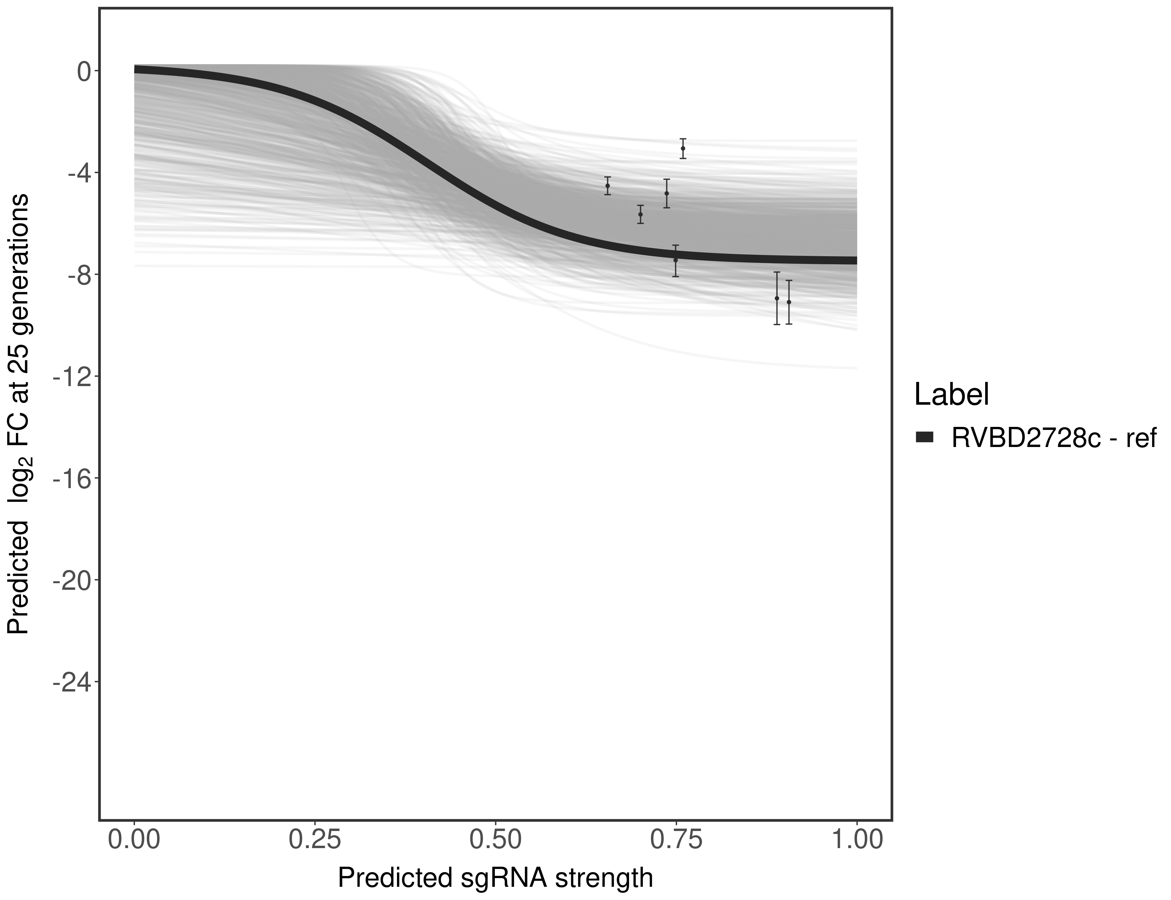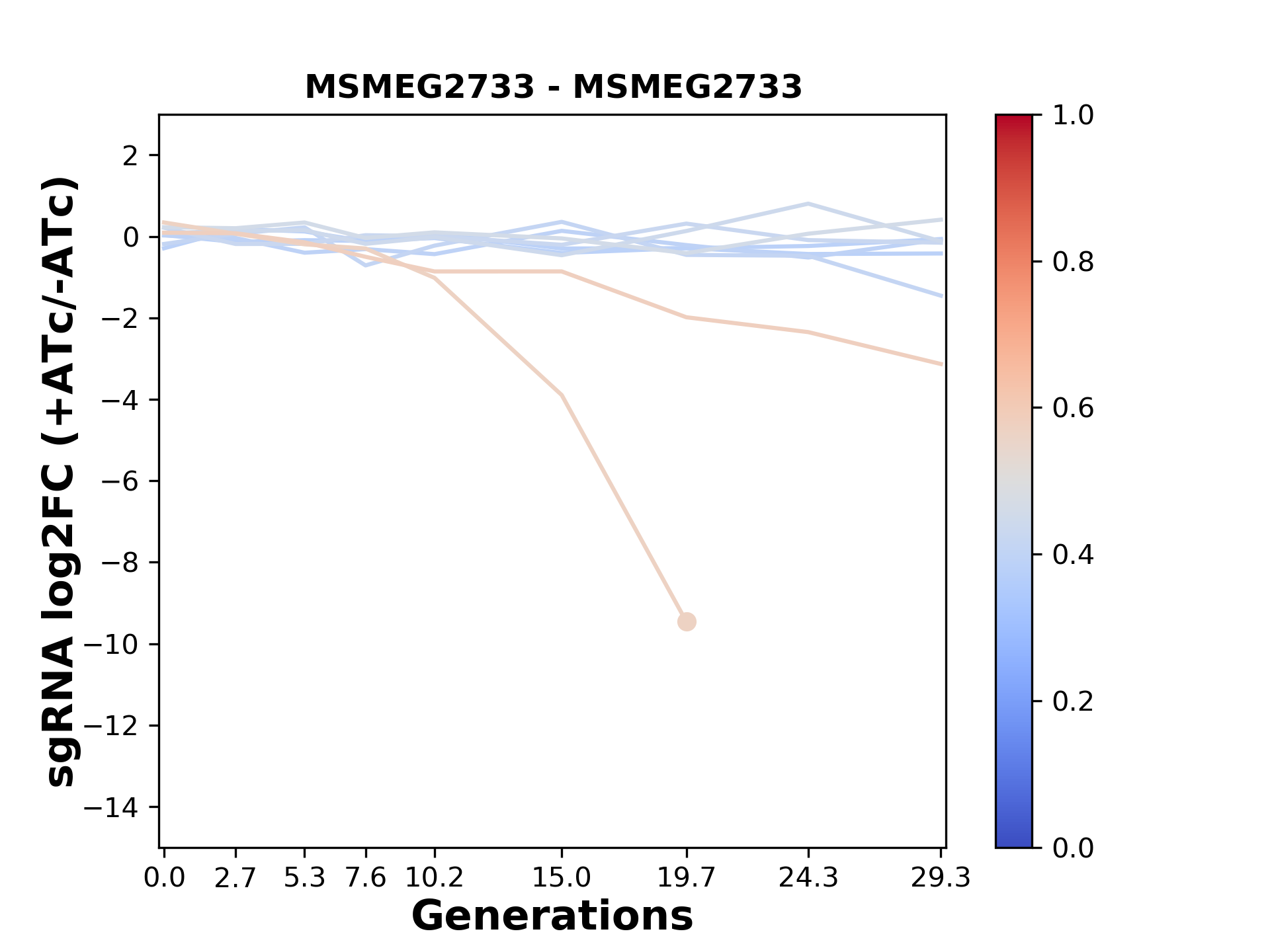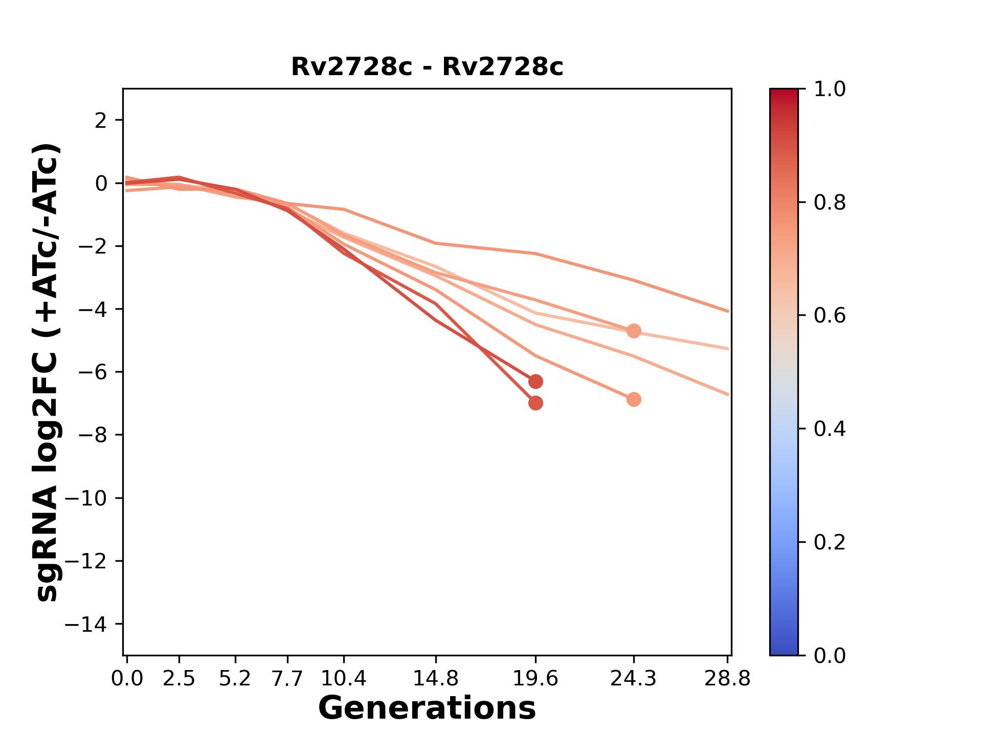 Here, we show sgRNA log2 fold-change values (L2FC) (plus versus minus ATc) over consecutive generations for sgRNAs targeting the gene you selected.