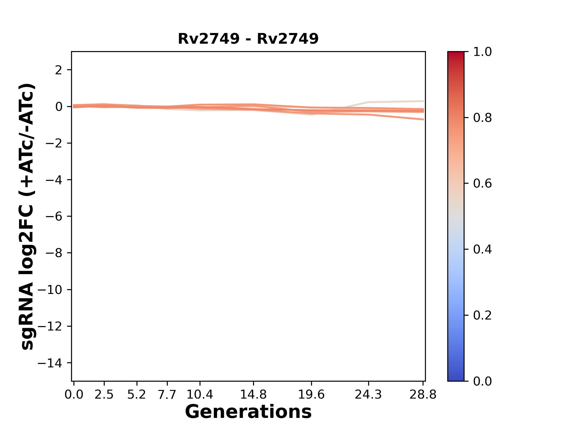 Experiment: We designed an M. tuberculosis CRISPRi library (RLC12) to target all annotated Mtb genes with single guide RNAs (sgRNAs) of varying predicted knockdown efficiencies. In parallel, we constructed a M. smegmatis CRISPRi library (RLC11) to target all annotated Msmeg genes, similar to the Mtb sgRNA library. RLC12 was transformed into M. tuberculosis H37Rv; RLC11 into M. smegmatis mc2-155. We passaged both CRISPRi libraries for nearly 30 generations in the presence or absence of the CRISPRi-inducer anhydrotetracycline (ATc). At the indicated timepoints, genomic DNA was harvested and the representation of individual sgRNAs was counted using Illumina sequencing. Here, we show sgRNA log2 fold-change values (L2FC) (plus versus minus ATc) over consecutive generations for sgRNAs targeting the gene you selected. sgRNAs are color-coded based on their predicted strength from blue (strength=0; weak) to red (strength=1; strong).