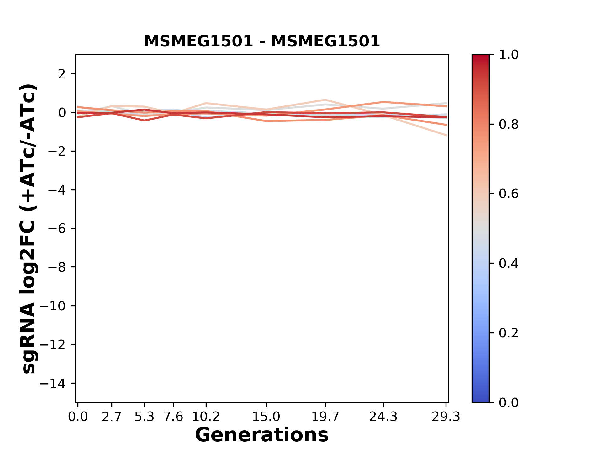 Experiment: We designed an M. tuberculosis CRISPRi library (RLC12) to target all annotated Mtb genes with single guide RNAs (sgRNAs) of varying predicted knockdown efficiencies. In parallel, we constructed a M. smegmatis CRISPRi library (RLC11) to target all annotated Msmeg genes, similar to the Mtb sgRNA library. RLC12 was transformed into M. tuberculosis H37Rv; RLC11 into M. smegmatis mc2-155. We passaged both CRISPRi libraries for nearly 30 generations in the presence or absence of the CRISPRi-inducer anhydrotetracycline (ATc). At the indicated timepoints, genomic DNA was harvested and the representation of individual sgRNAs was counted using Illumina sequencing. Here, we show sgRNA log2 fold-change values (L2FC) (plus versus minus ATc) over consecutive generations for sgRNAs targeting the gene you selected. sgRNAs are color-coded based on their predicted strength from blue (strength=0; weak) to red (strength=1; strong).