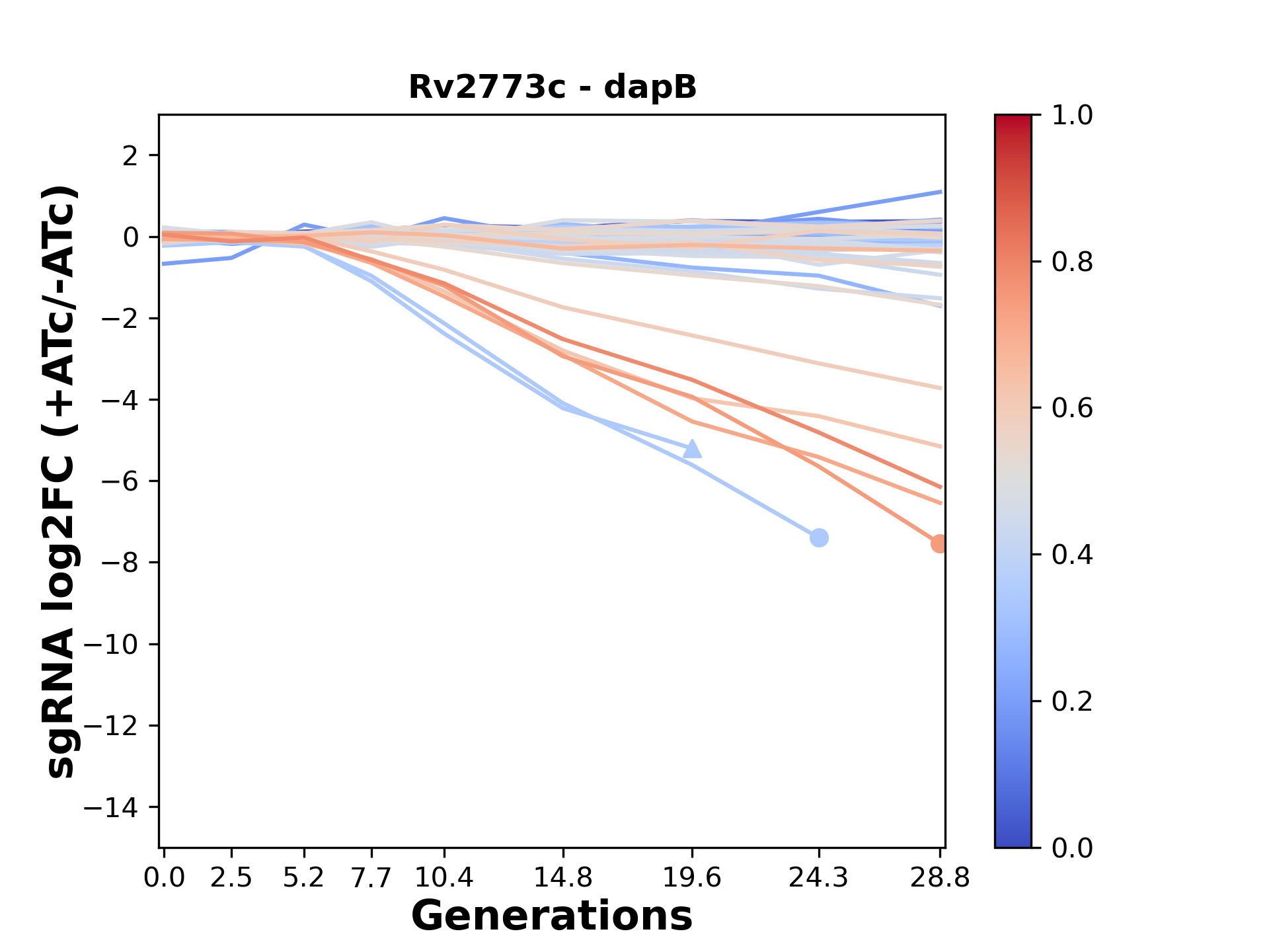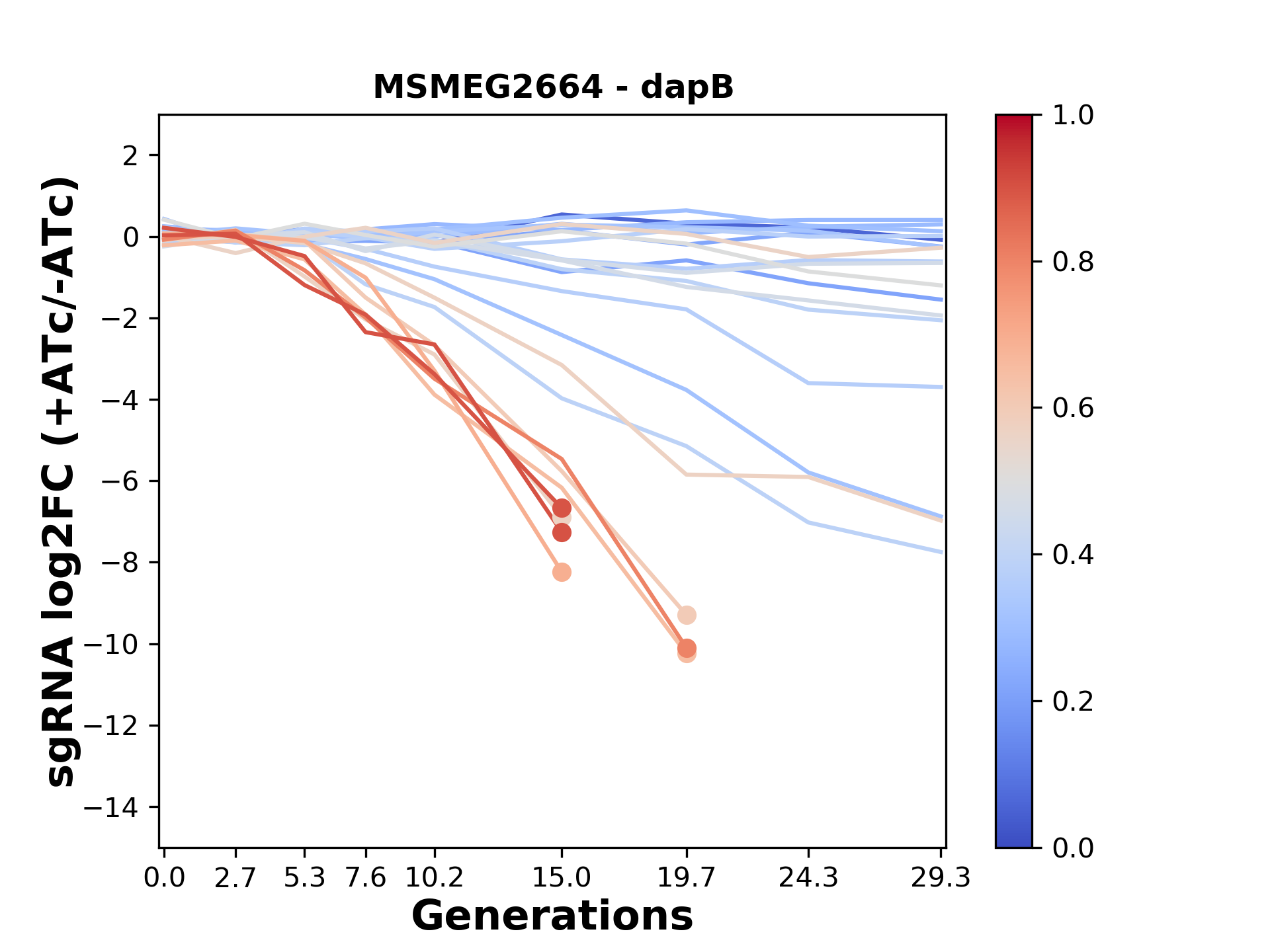 Here, we show sgRNA log2 fold-change values (L2FC) (plus versus minus ATc) over consecutive generations for sgRNAs targeting the gene you selected.