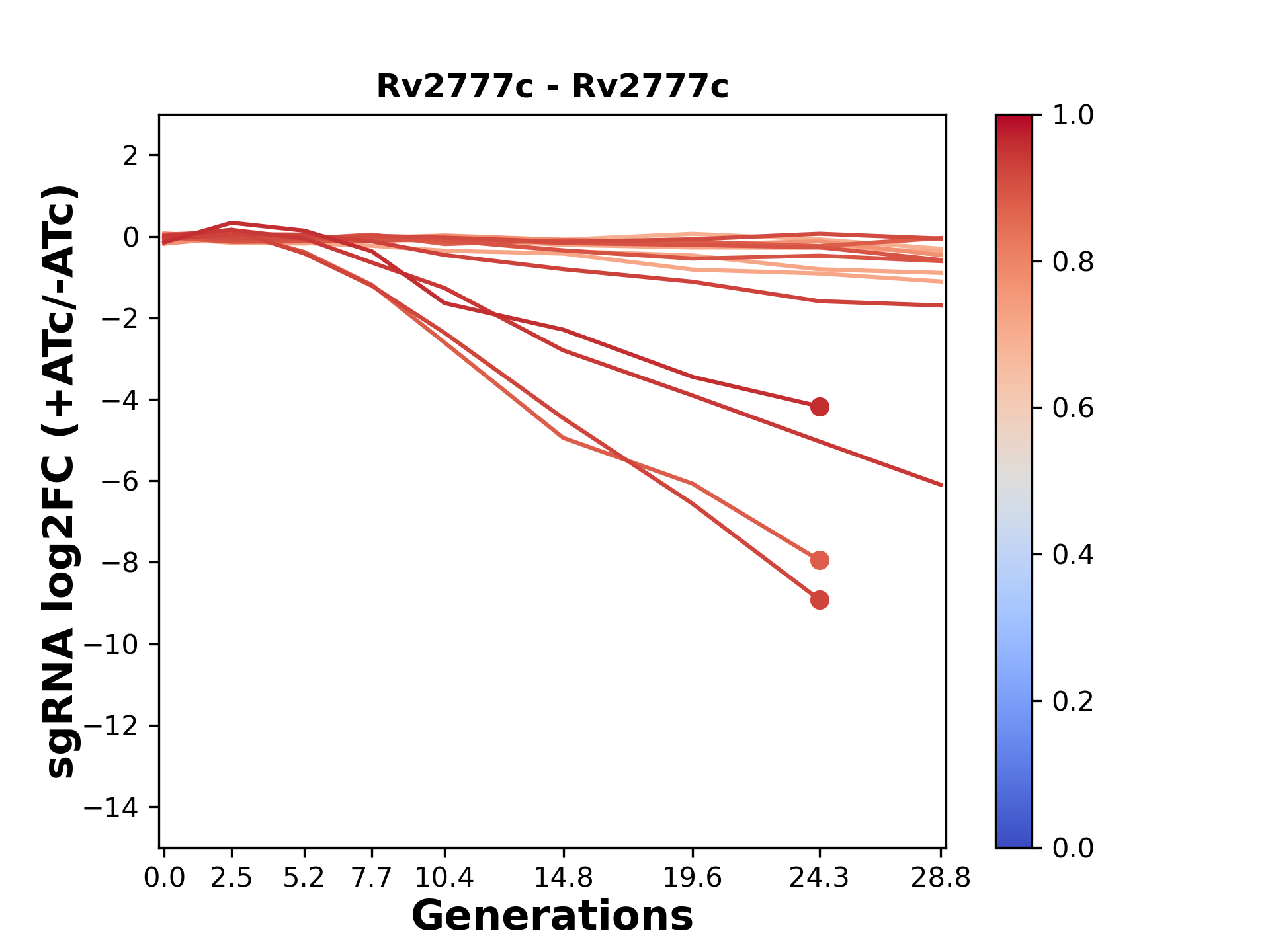 Here, we show sgRNA log2 fold-change values (L2FC) (plus versus minus ATc) over consecutive generations for sgRNAs targeting the gene you selected.