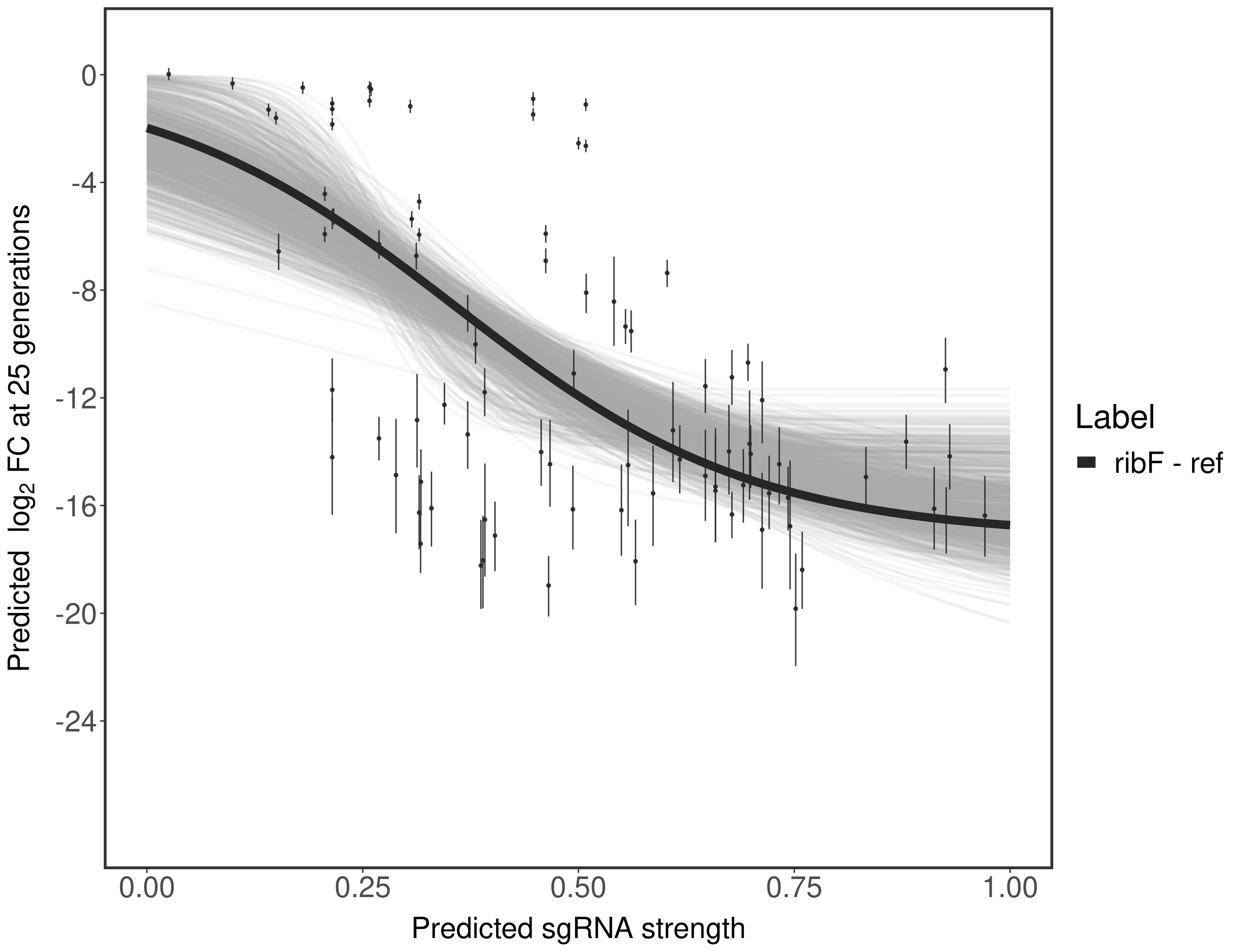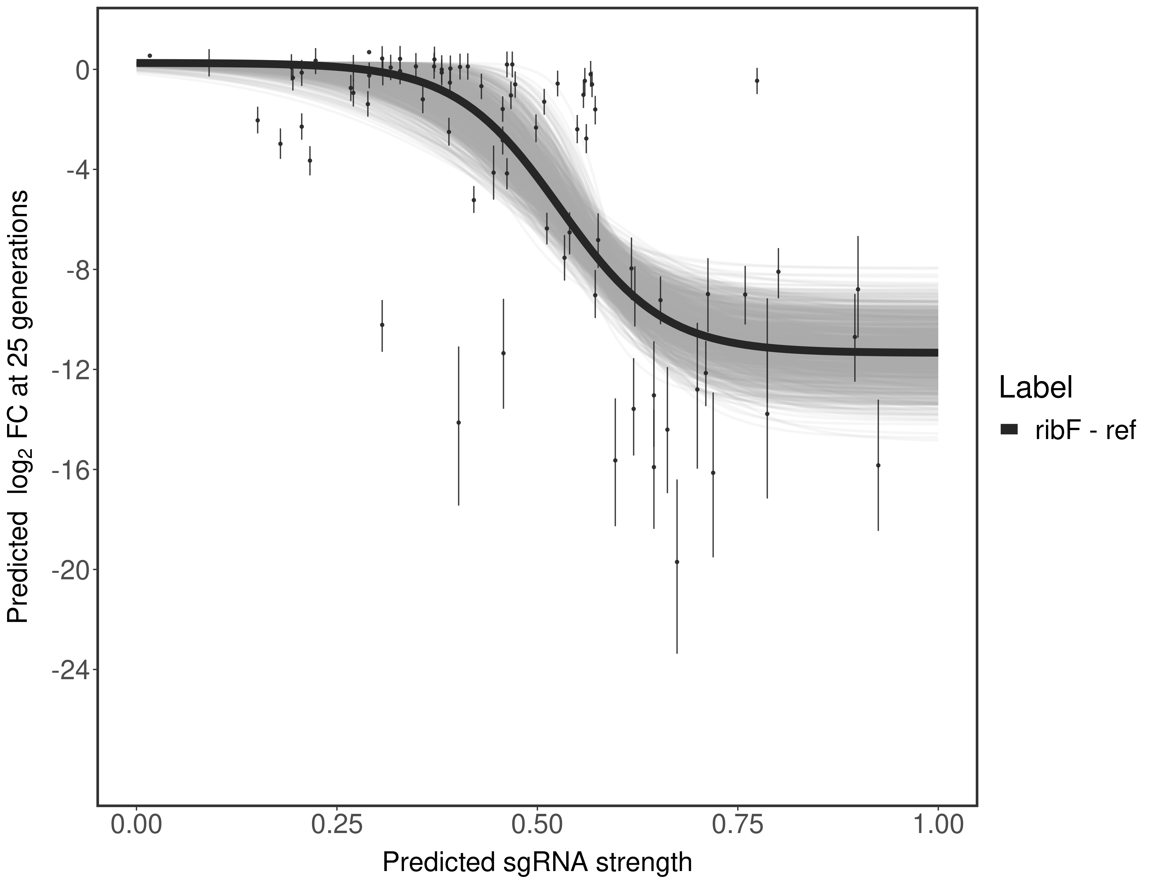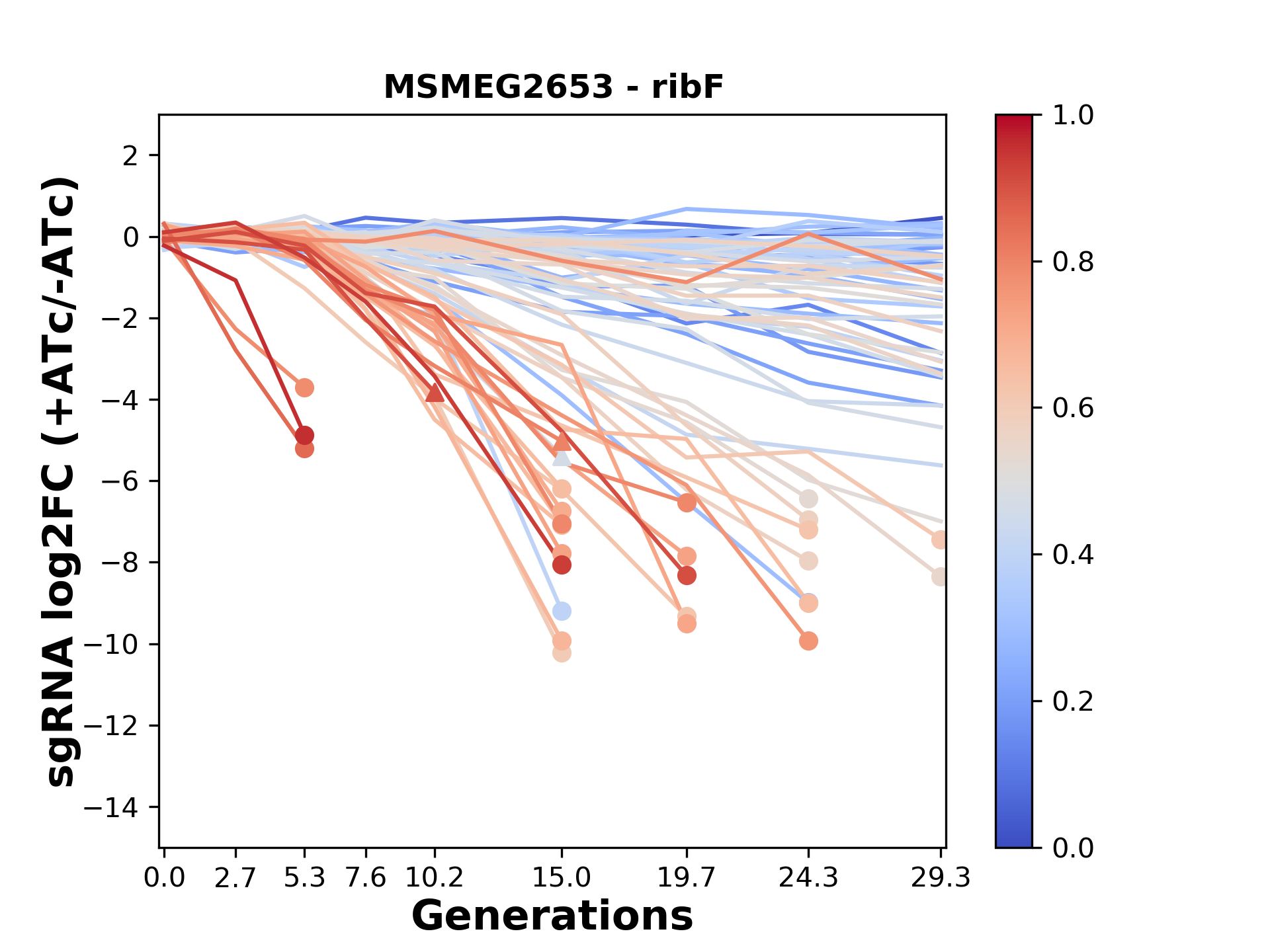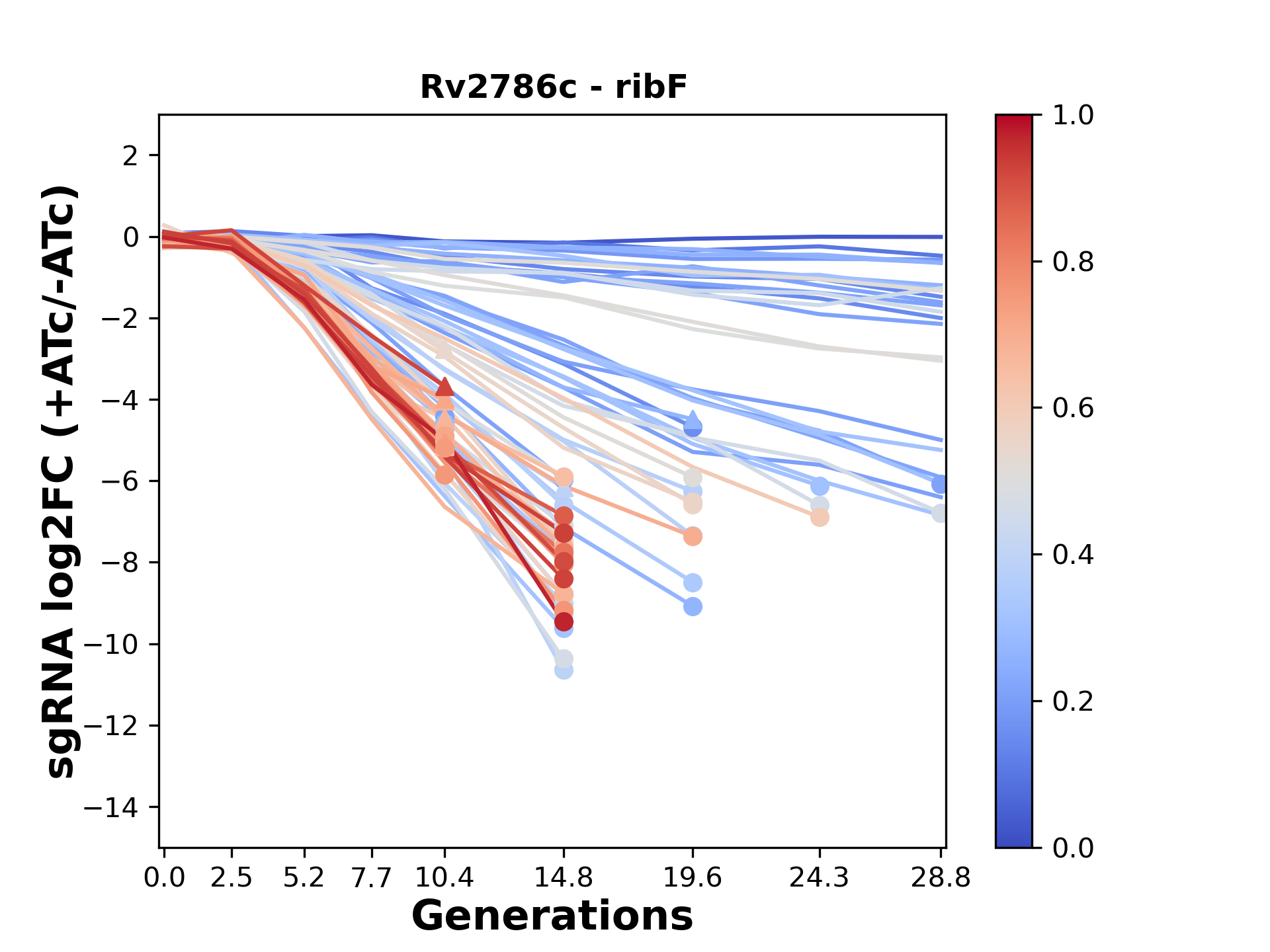 Experiment: We designed an M. tuberculosis CRISPRi library (RLC12) to target all annotated Mtb genes with single guide RNAs (sgRNAs) of varying predicted knockdown efficiencies. In parallel, we constructed a M. smegmatis CRISPRi library (RLC11) to target all annotated Msmeg genes, similar to the Mtb sgRNA library. RLC12 was transformed into M. tuberculosis H37Rv; RLC11 into M. smegmatis mc2-155. We passaged both CRISPRi libraries for nearly 30 generations in the presence or absence of the CRISPRi-inducer anhydrotetracycline (ATc). At the indicated timepoints, genomic DNA was harvested and the representation of individual sgRNAs was counted using Illumina sequencing. Here, we show sgRNA log2 fold-change values (L2FC) (plus versus minus ATc) over consecutive generations for sgRNAs targeting the gene you selected. sgRNAs are color-coded based on their predicted strength from blue (strength=0; weak) to red (strength=1; strong).