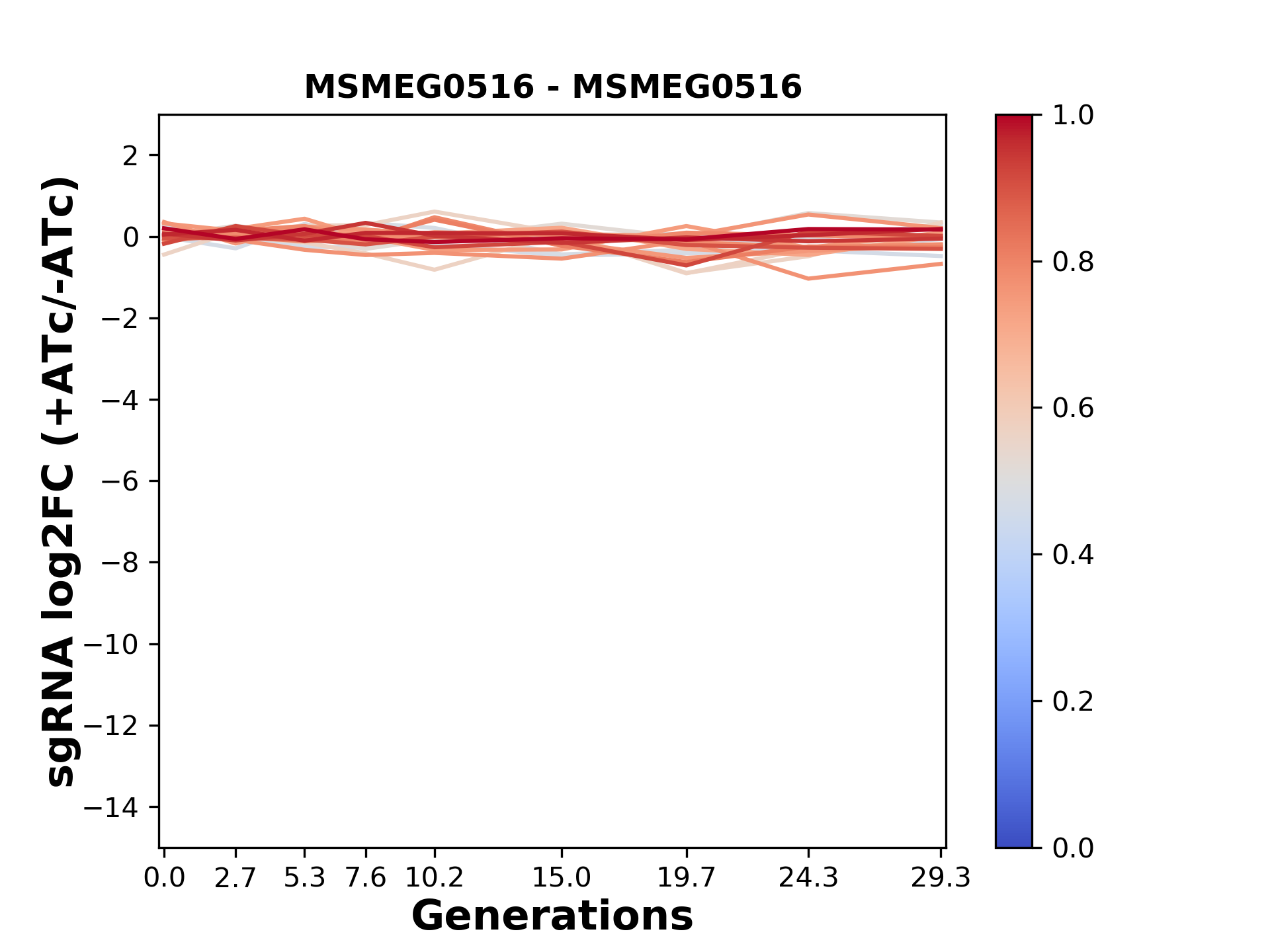 Here, we show sgRNA log2 fold-change values (L2FC) (plus versus minus ATc) over consecutive generations for sgRNAs targeting the gene you selected.