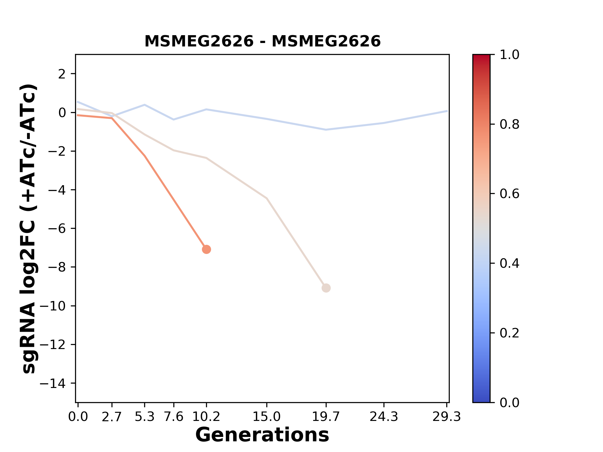 Here, we show sgRNA log2 fold-change values (L2FC) (plus versus minus ATc) over consecutive generations for sgRNAs targeting the gene you selected.