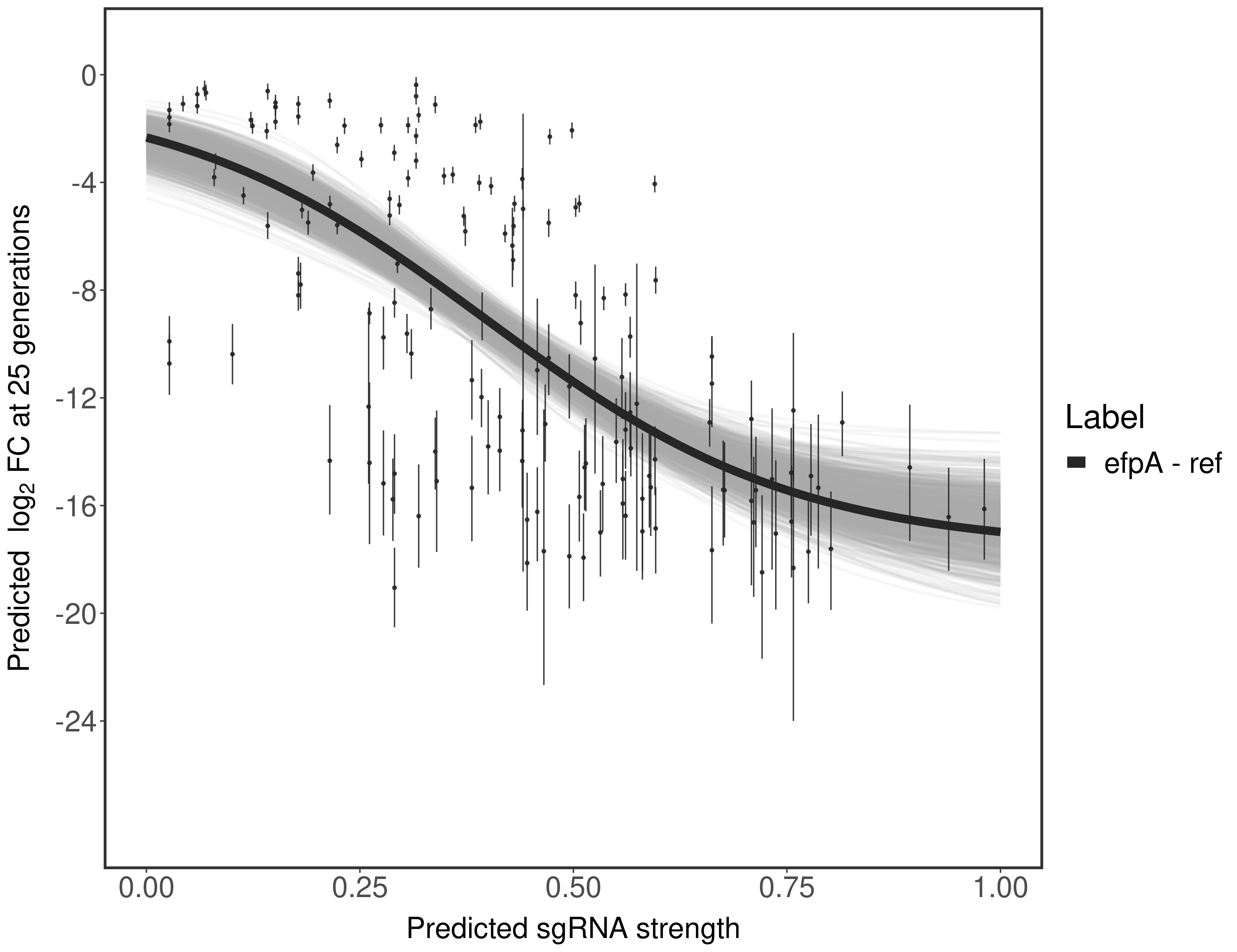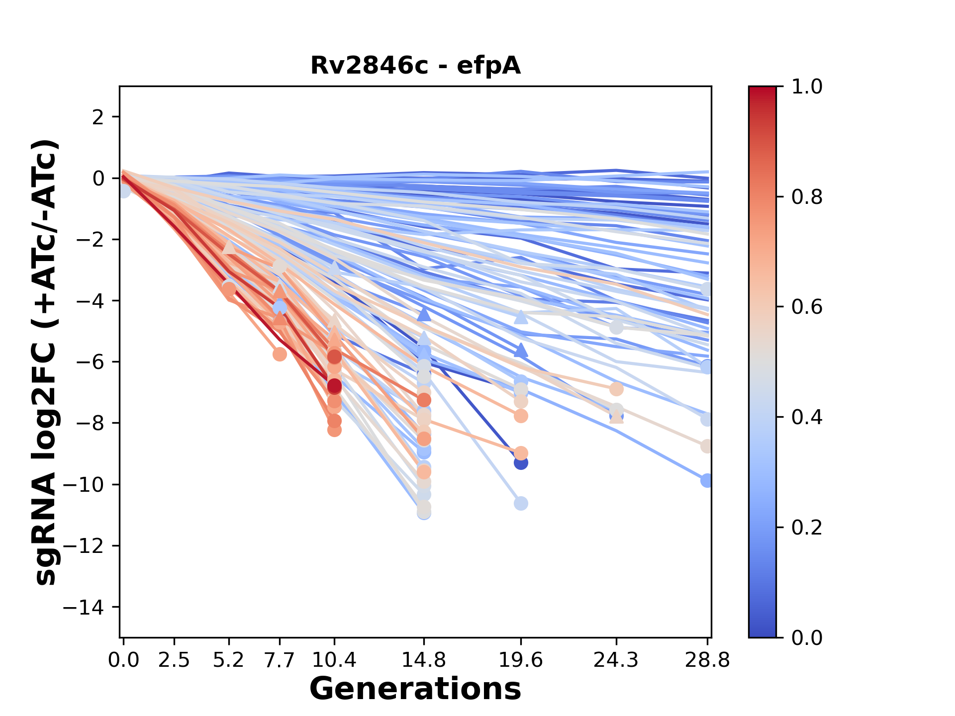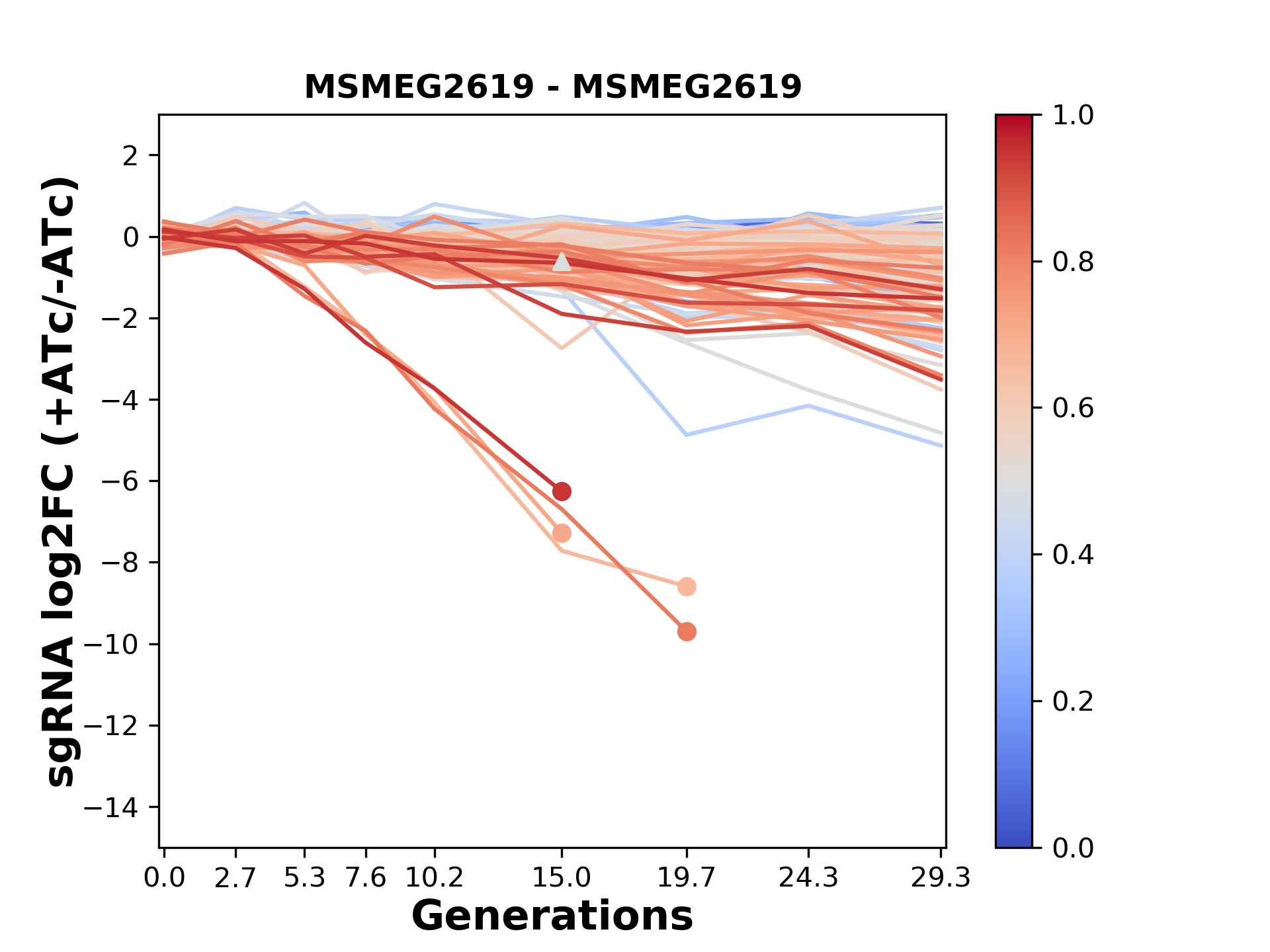 Here, we show sgRNA log2 fold-change values (L2FC) (plus versus minus ATc) over consecutive generations for sgRNAs targeting the gene you selected.