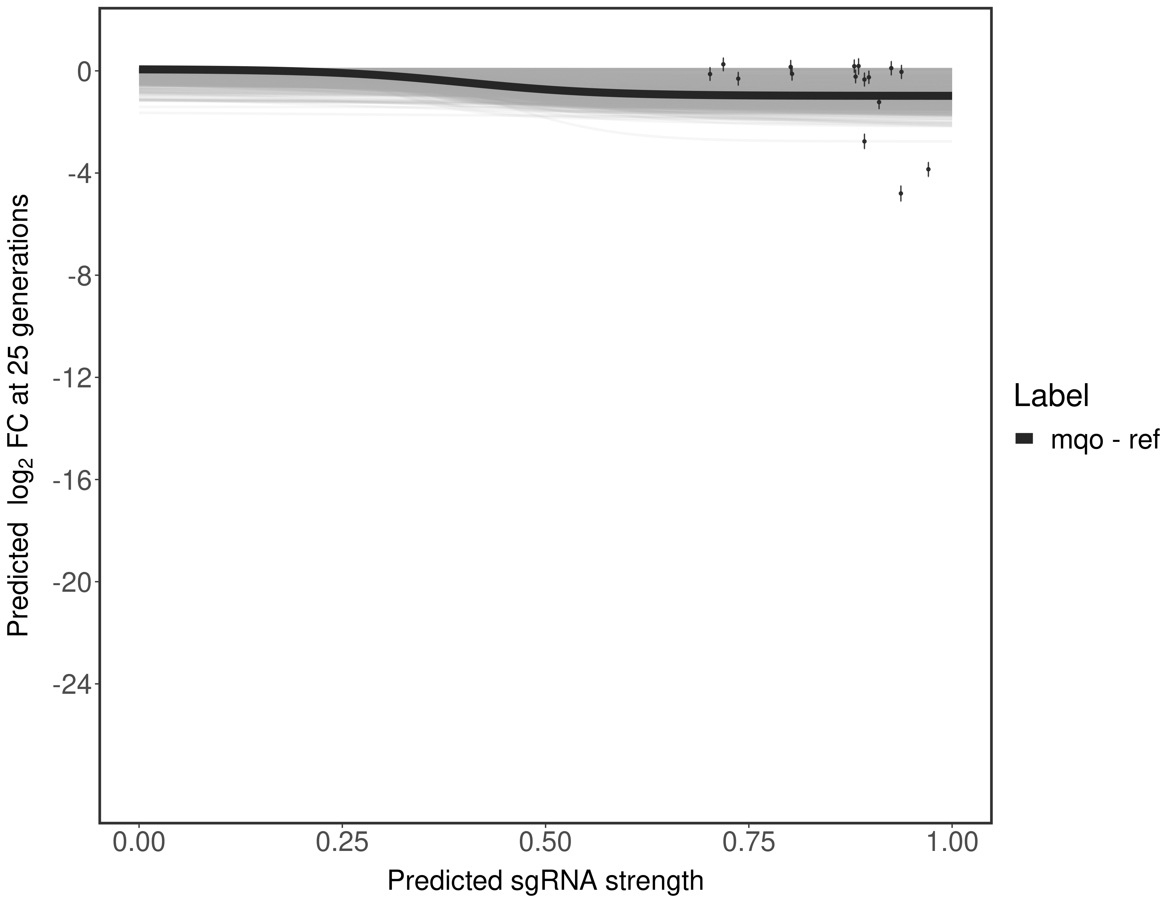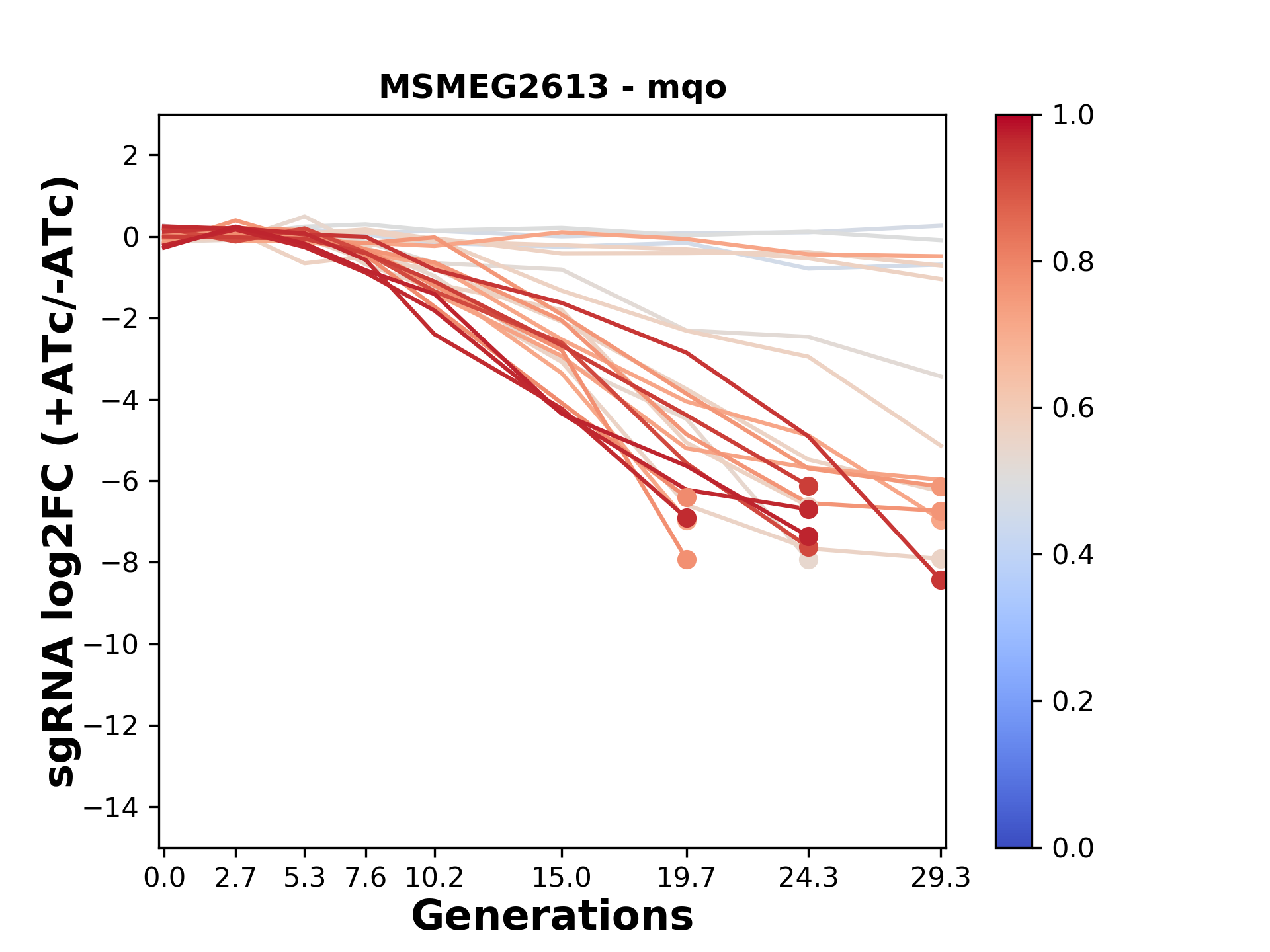 Here, we show sgRNA log2 fold-change values (L2FC) (plus versus minus ATc) over consecutive generations for sgRNAs targeting the gene you selected.