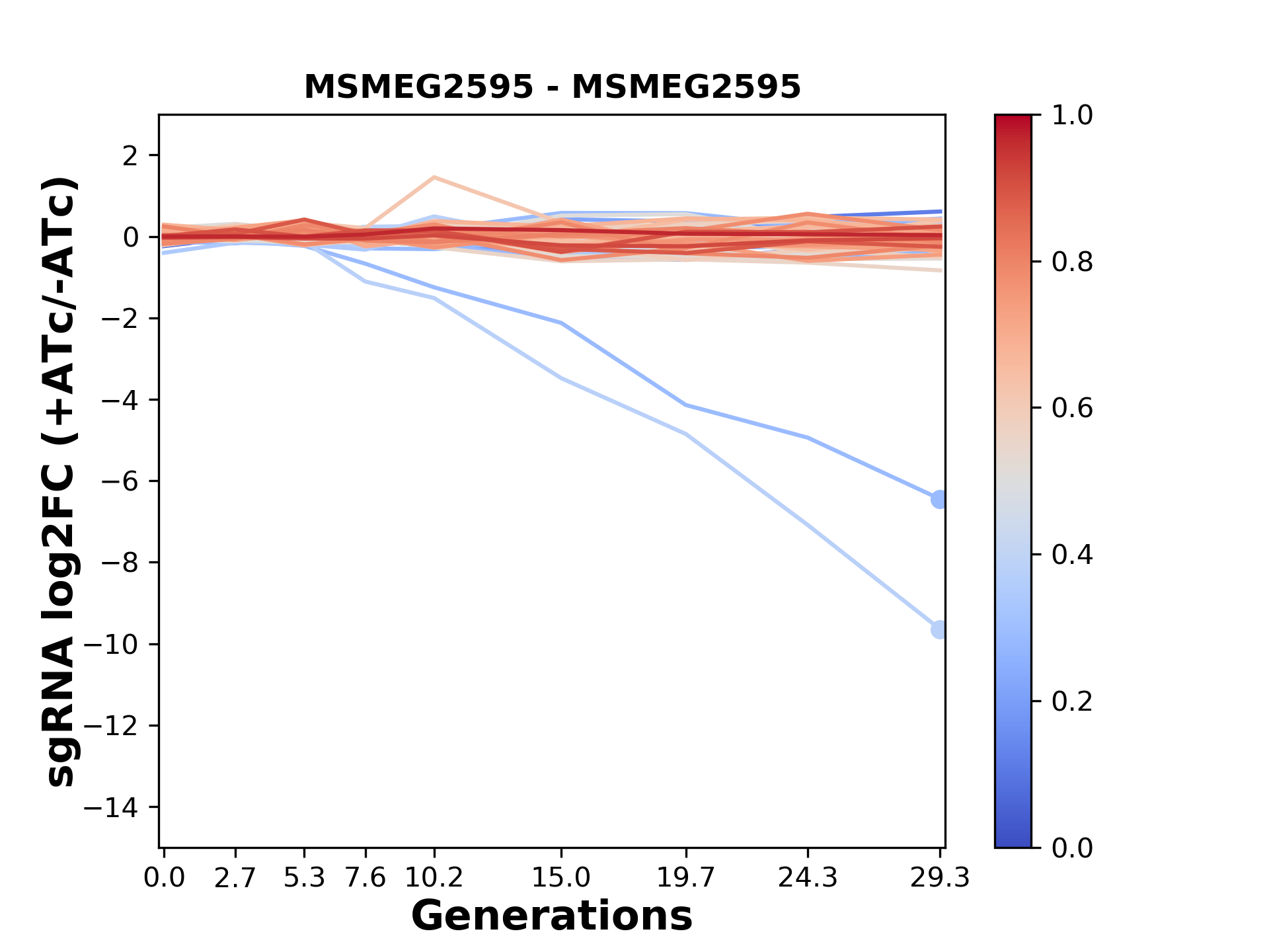Here, we show sgRNA log2 fold-change values (L2FC) (plus versus minus ATc) over consecutive generations for sgRNAs targeting the gene you selected.